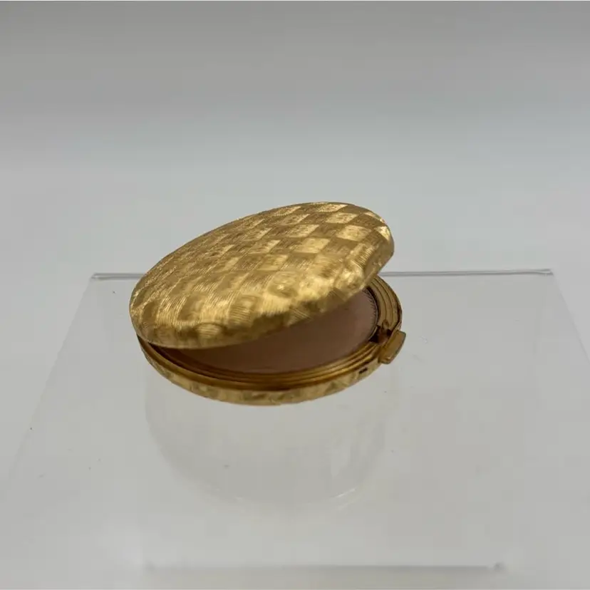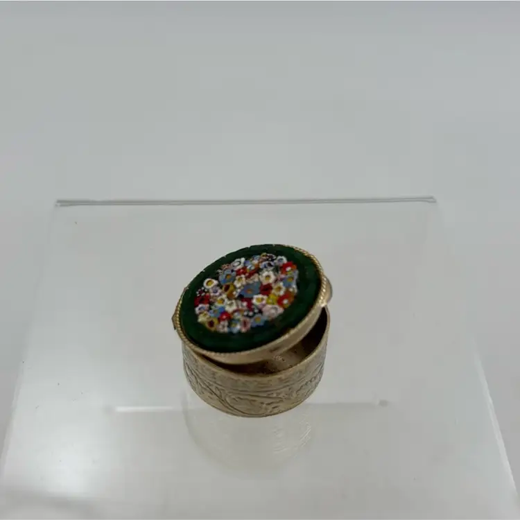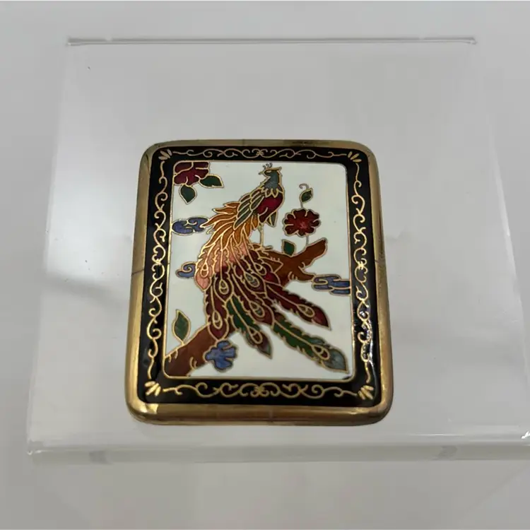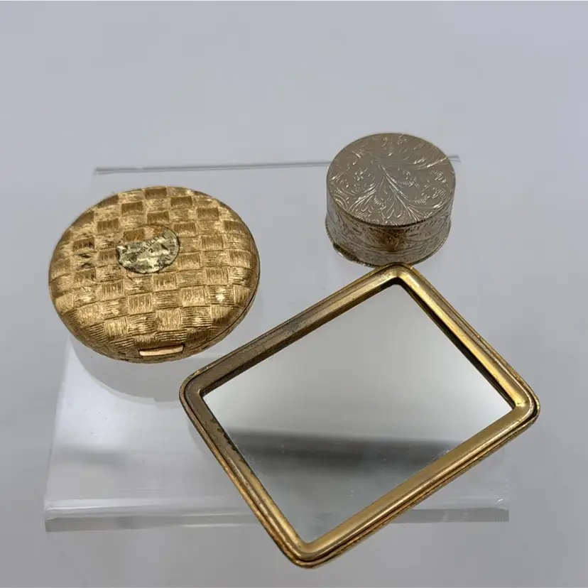 #1 vintage cloisonné peacock brass mini mirror 2 1/2 x 2“ has some ware from use.#2 vintage micro mosaic pill box and wonderful condition.#3 vintage revlon love Pat press powder compact 1960s basketweave, gold tone mirror all three in vintage condition