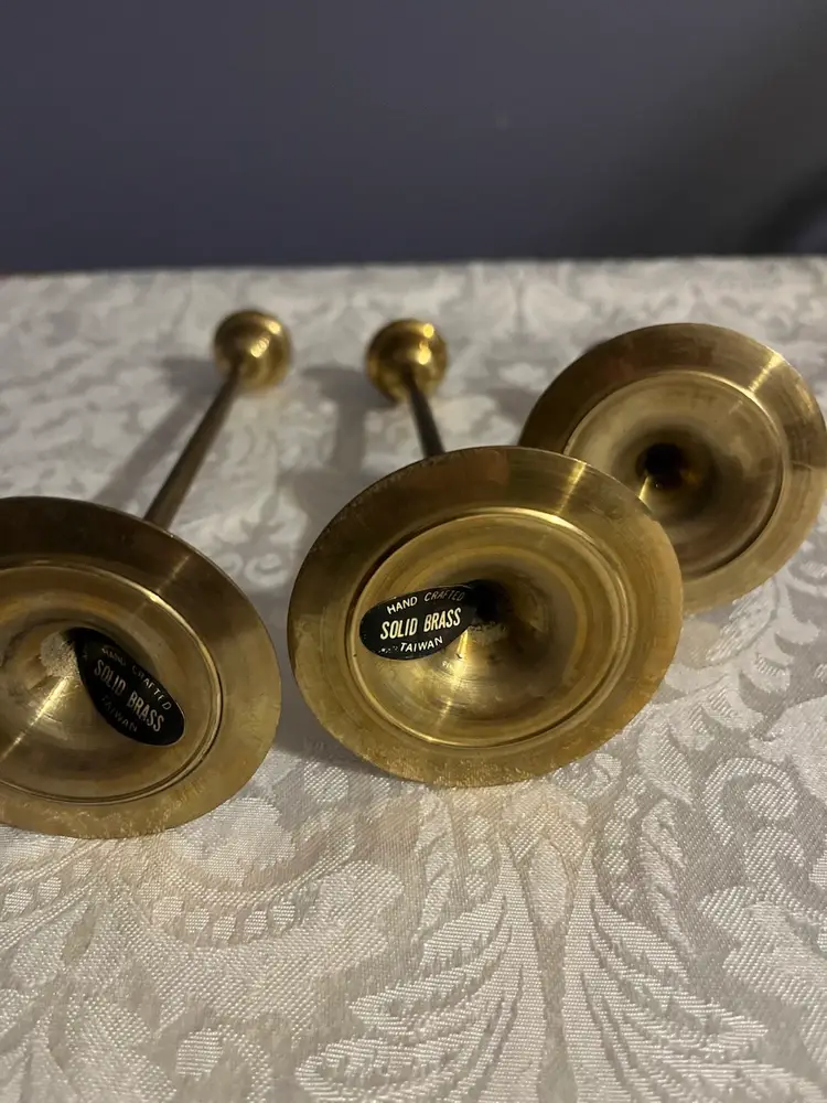 These particular candle holders, with their slender stems and flared bases, are characteristic of mid-century modern or transitional decorative styles. The mention of Taiwan as a manufacturing origin for similar items points to a period when many decorative goods were produced there for export. The patina visible on the brass suggests they have been used and aged gracefully, adding to their vintage appeal.