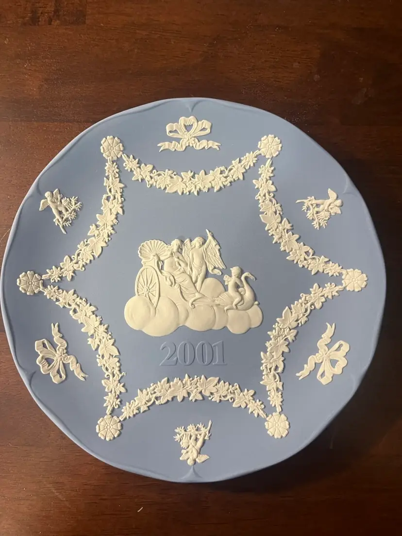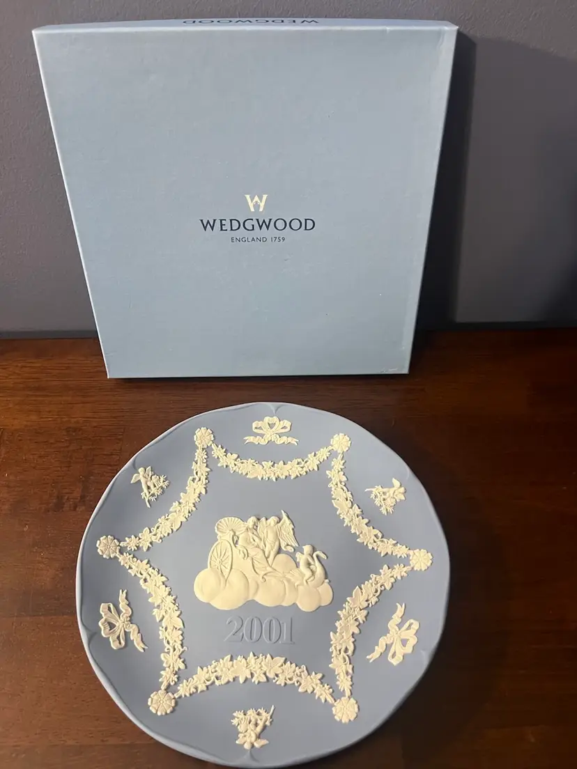 Annual plates, such as this one from 2001, are a popular collectible series produced by Wedgwood. These plates are typically released each year and feature unique designs that often commemorate historical events, seasons, or artistic themes. They are designed for decorative purposes and are highly sought after by collectors who aim to complete a set or acquire plates from specific years.