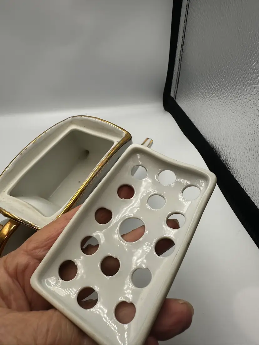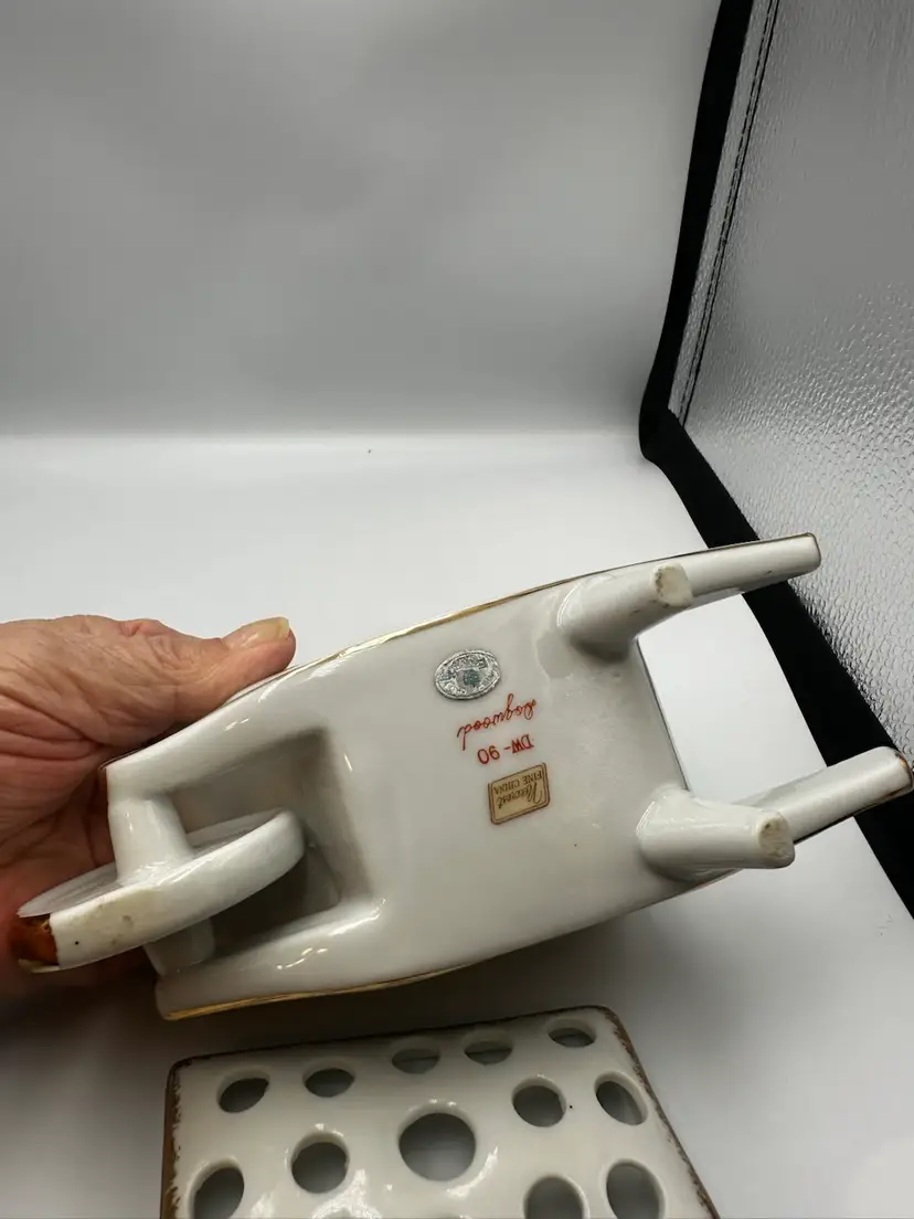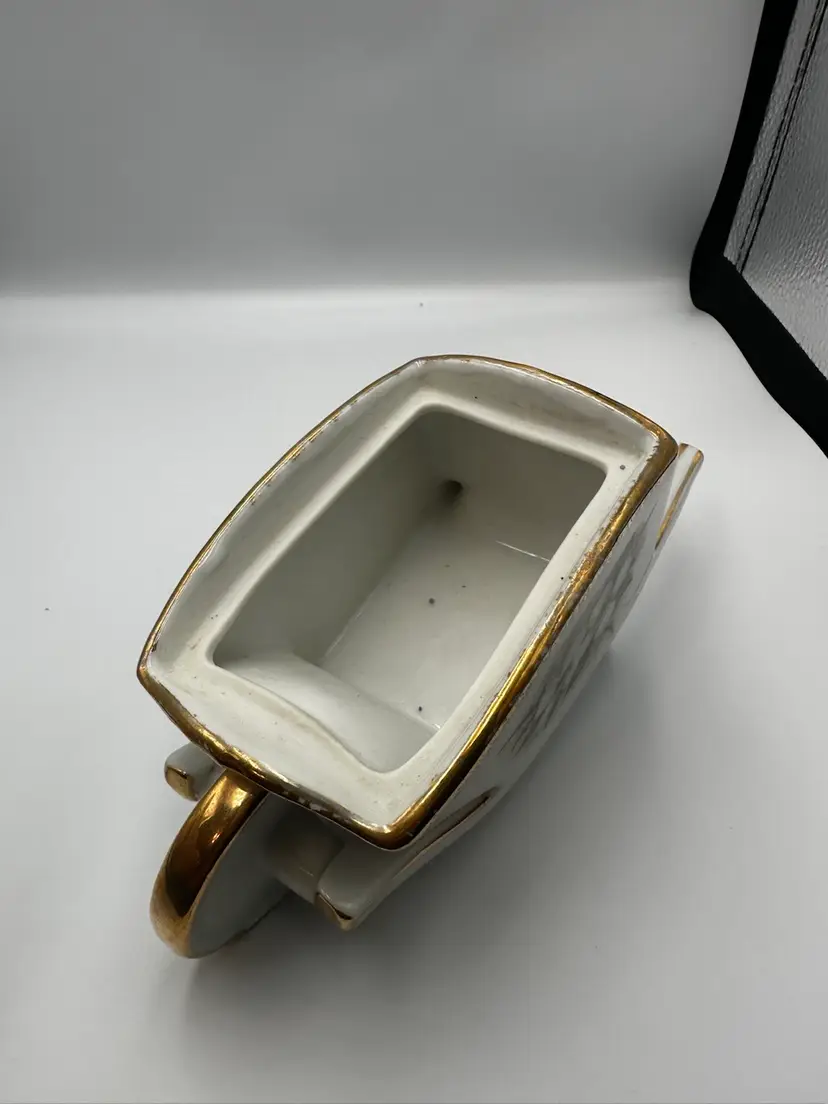 7 1/2” x 3” Vintage ceramic flower frog in the shape of a wheelbarrow with gold tone accents and a dogwood floral pattern