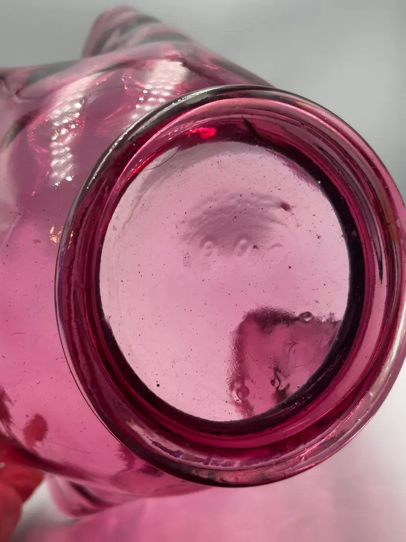 Likely a vintage or antique Victorian piece made from cranberry glass, a red glass created by adding gold salts to molten glass, a technique often used in hand-blown craft production.