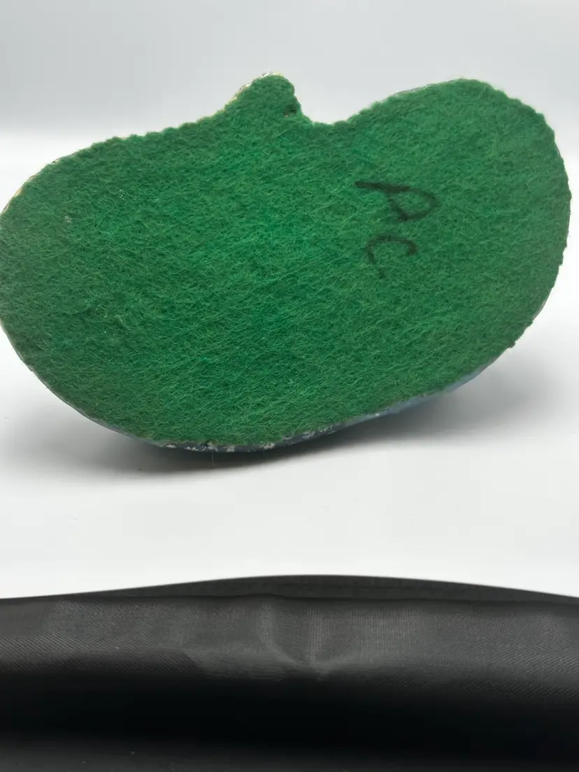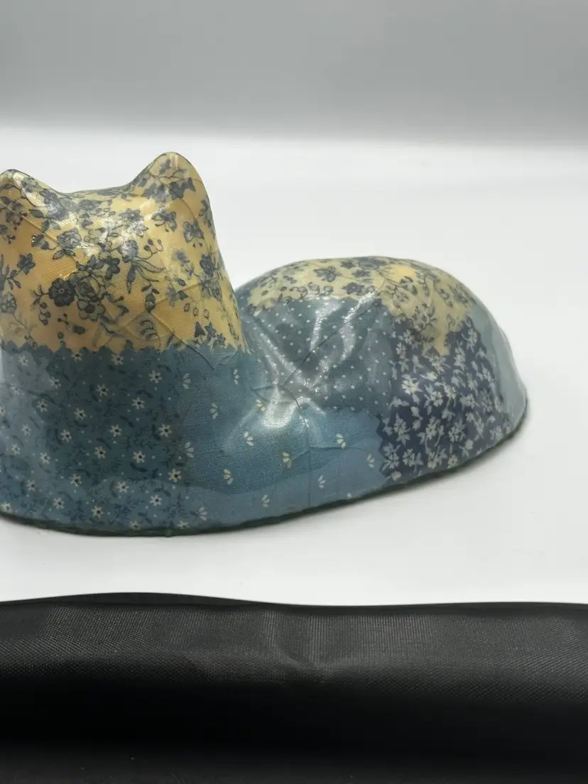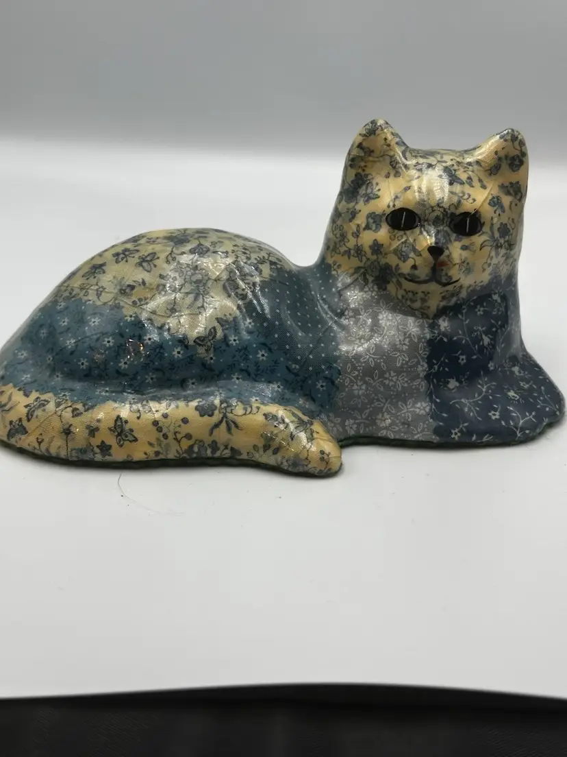 A 6 inch vintage ceramic cat figurine with a decoupage patchwork floral design, possibly a doorstop or decorative item. • The design features various blue, white, and yellow/tan floral and paisley patterns. ® • The material is ceramic, covered with fabric or paper sealed with a glossy finish. No chips but there is crazing