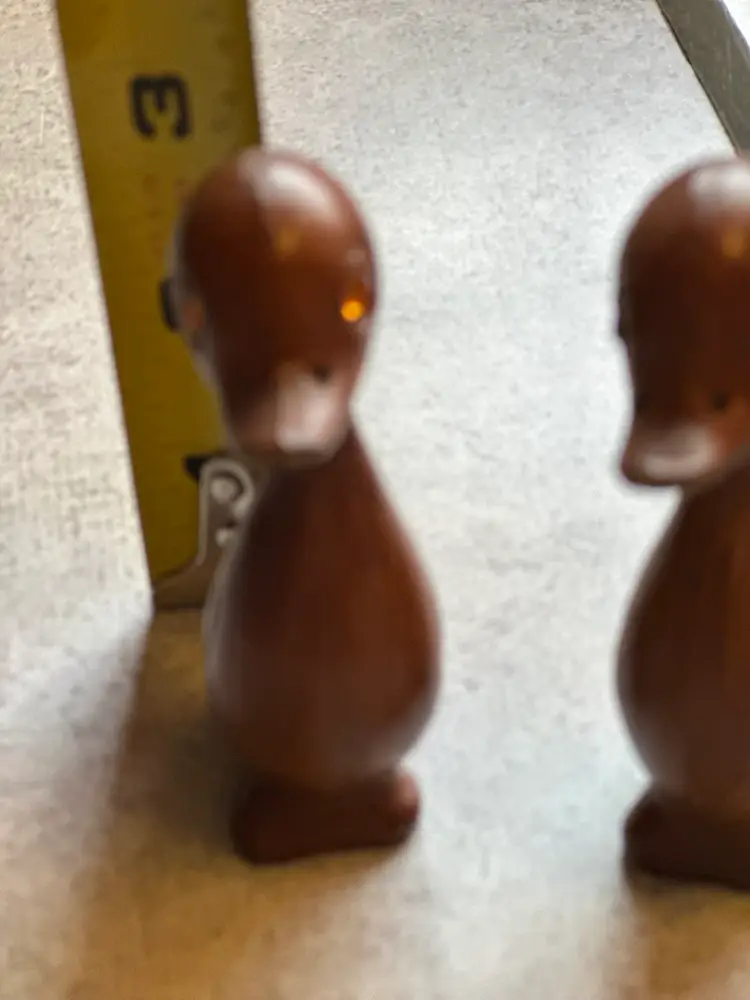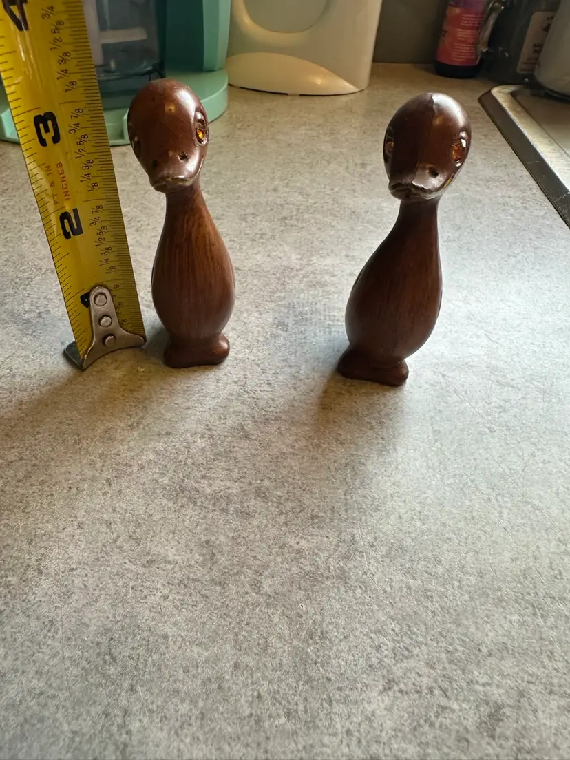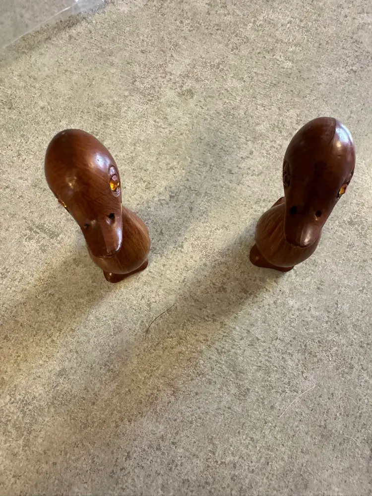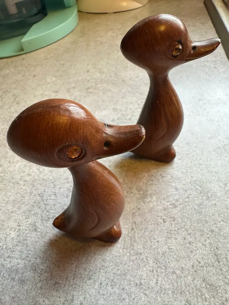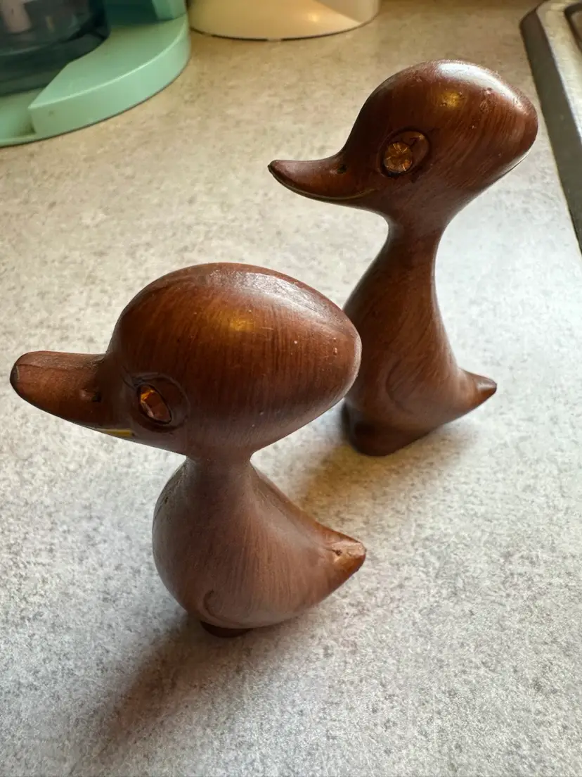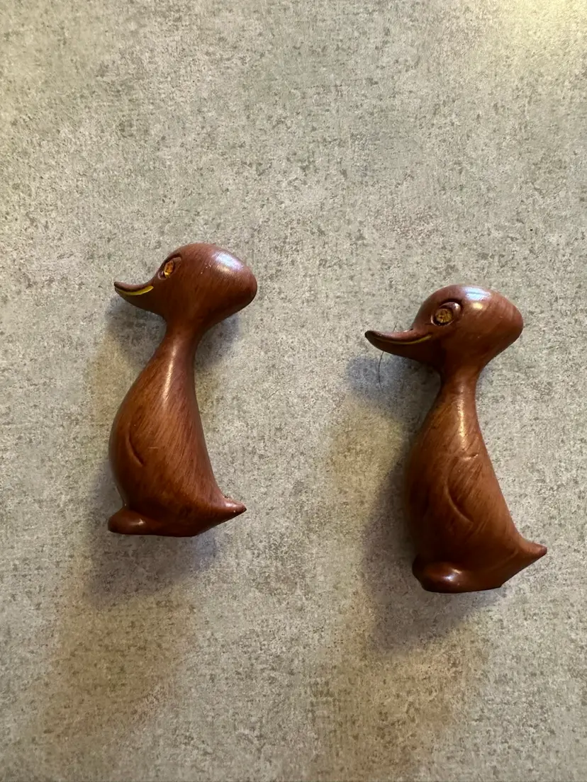 These wooden duck figurines with amber rhinestone eyes were produced in Hong Kong during the 1960s as part of the Mid-Century Modern decorative arts movement. The stylized, minimalist design reflects the aesthetic preferences of the period, with smooth lines and natural materials being highly valued. Great condition.
