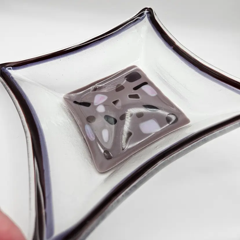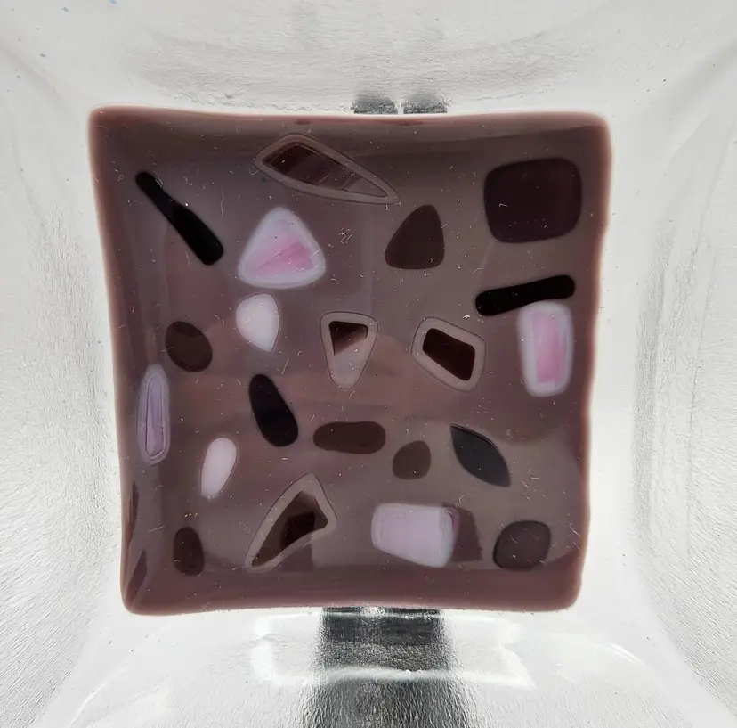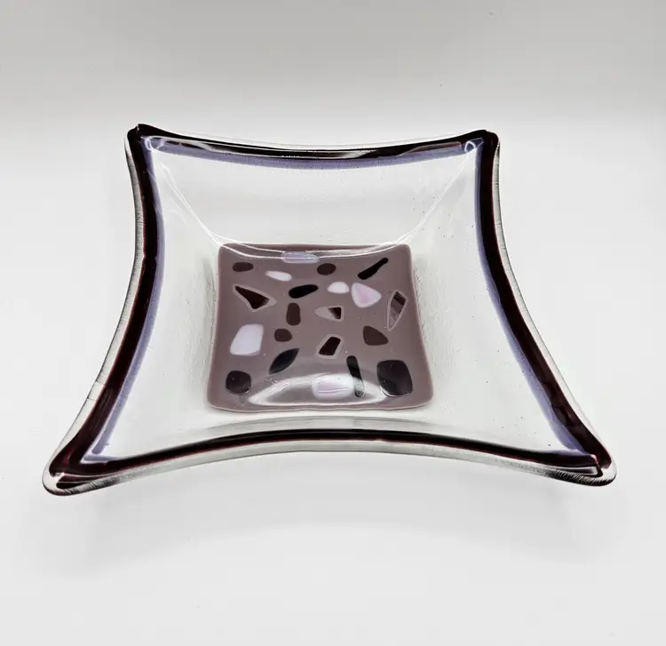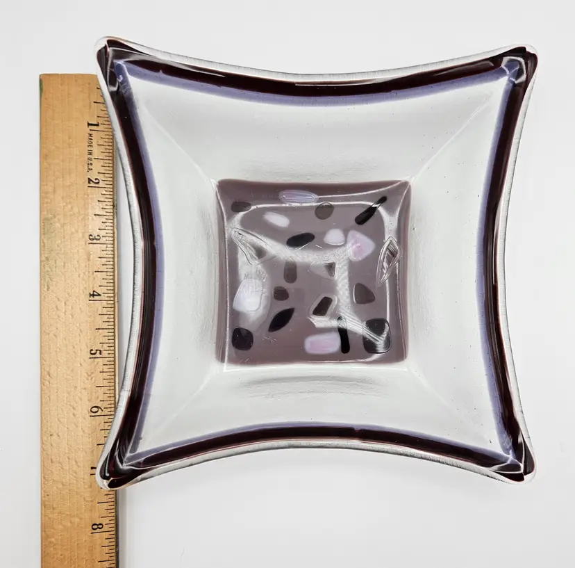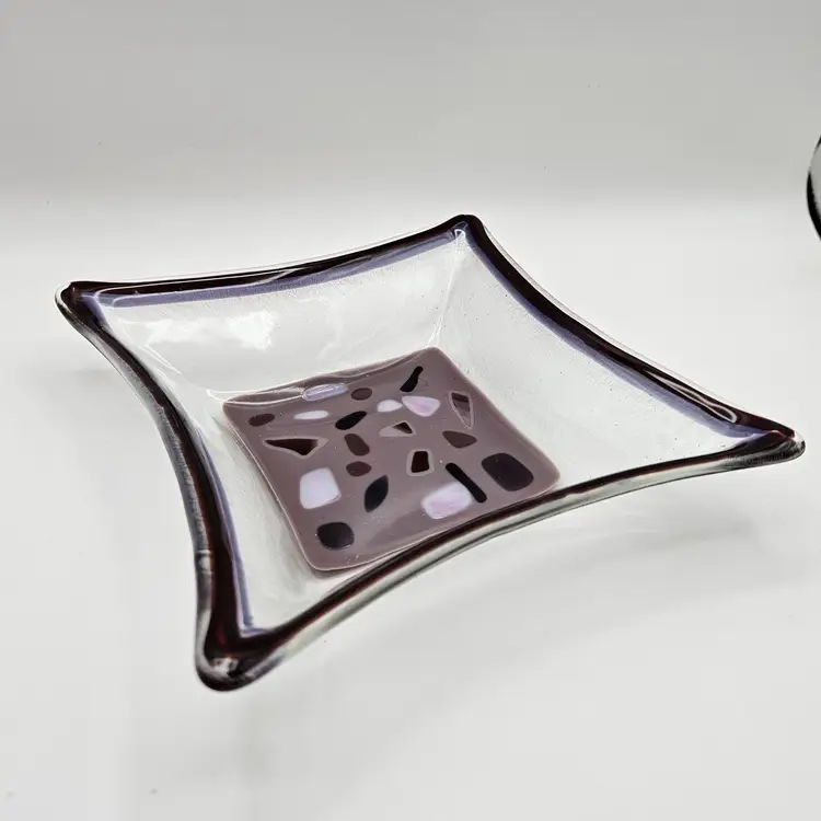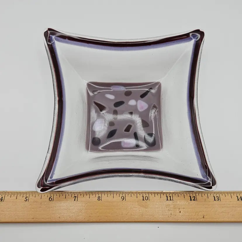 Abstract Fused Art Glass Square Console Dish Bowl Pink Mauve Browns Purple