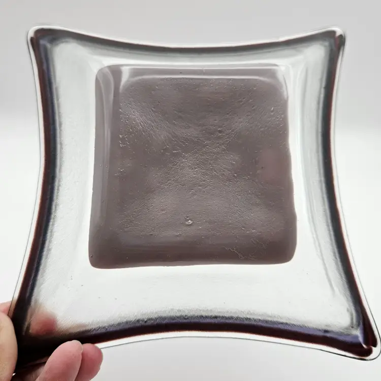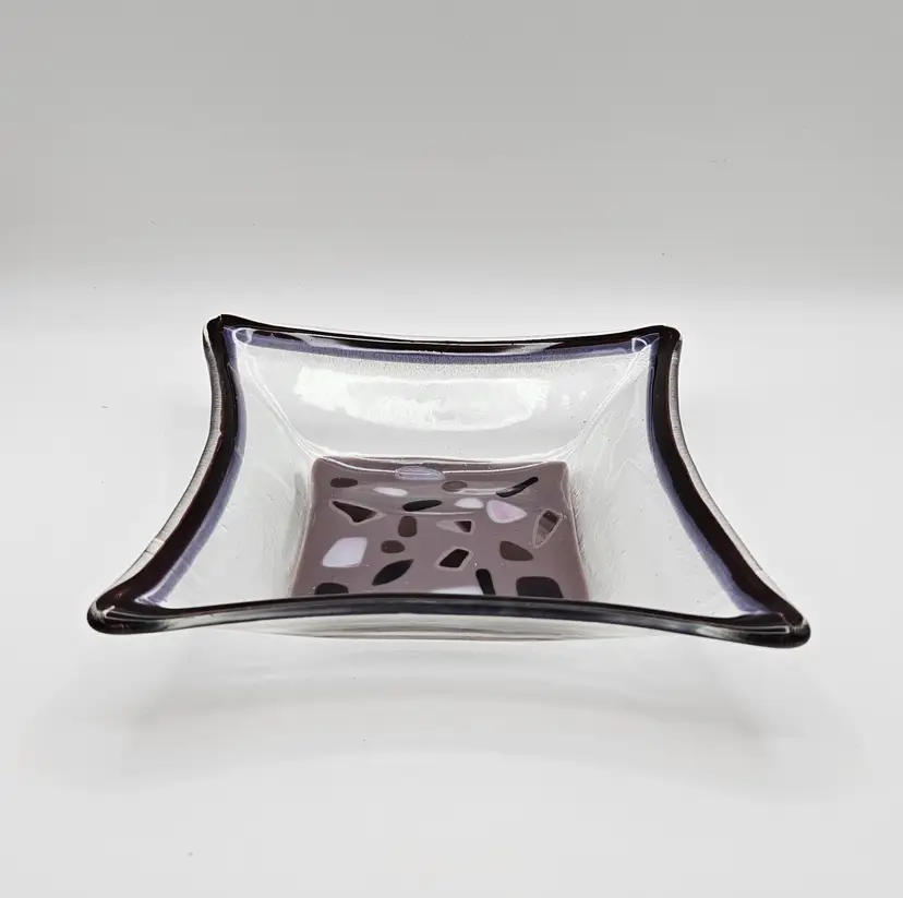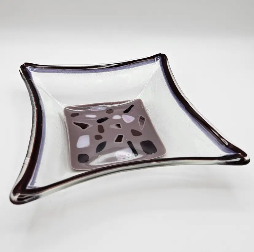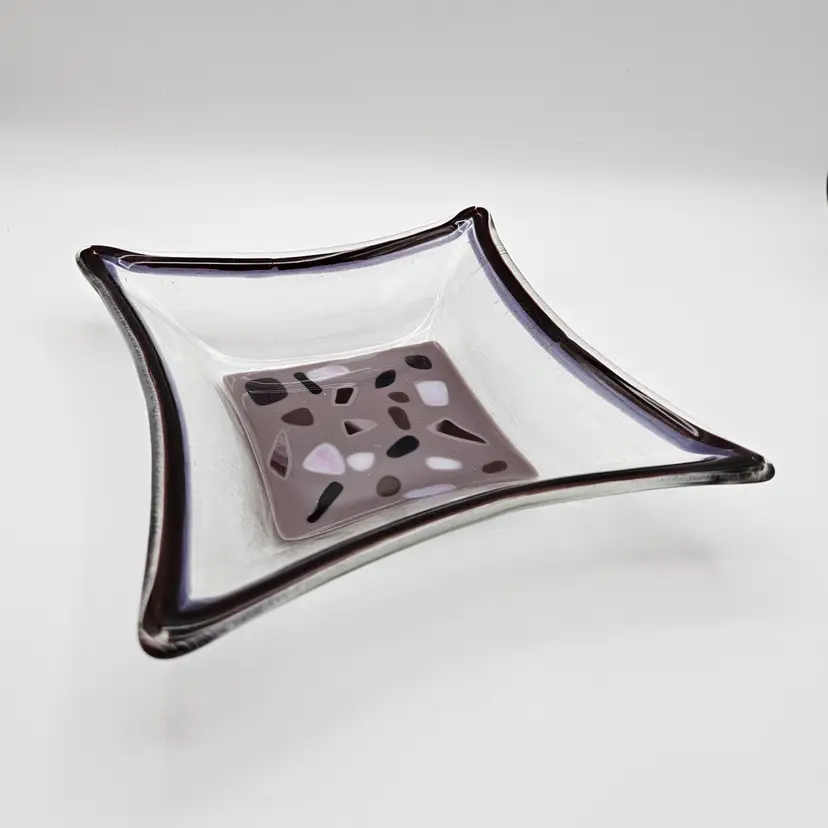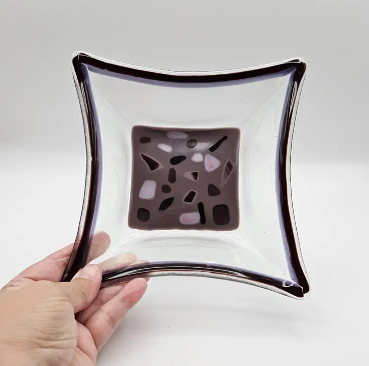 Abstract Fused Art Glass Square Console Dish Bowl Pink Mauve Browns Purple