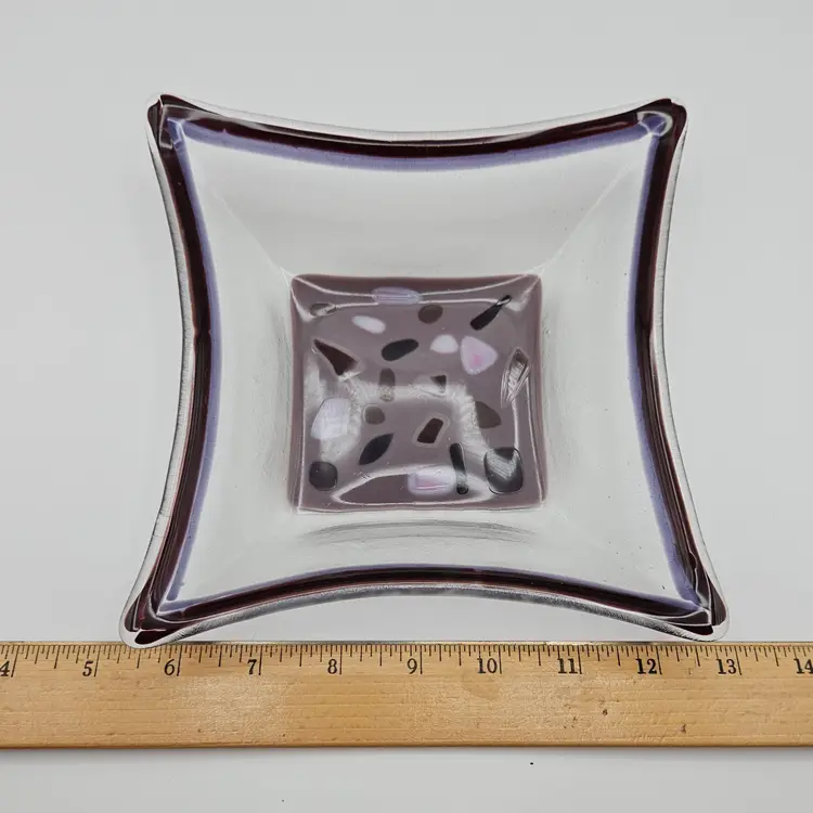 Unique, one of a kind handmade hand fused glass square console dish bowl. Pink Mauve Browns Purple White fused art glass. Abstract design. Translucent and opaque glass. Display this . piece or use it as a candy dish, trinket tray, small serving bowl, pillar candle plate, or centerpiece. Measurements: 7x7 Condition: Good pre-owned condition with typical minor scuffs. No chips or cracks. Please see pictures for more details.