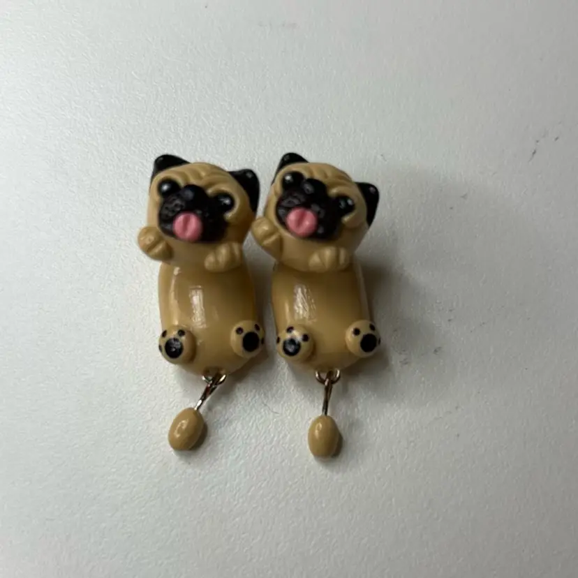 Adorable Pug Earrings, Two Parts, 1 1/4” Long Including Dangling Tail. Made With Polymer Clay