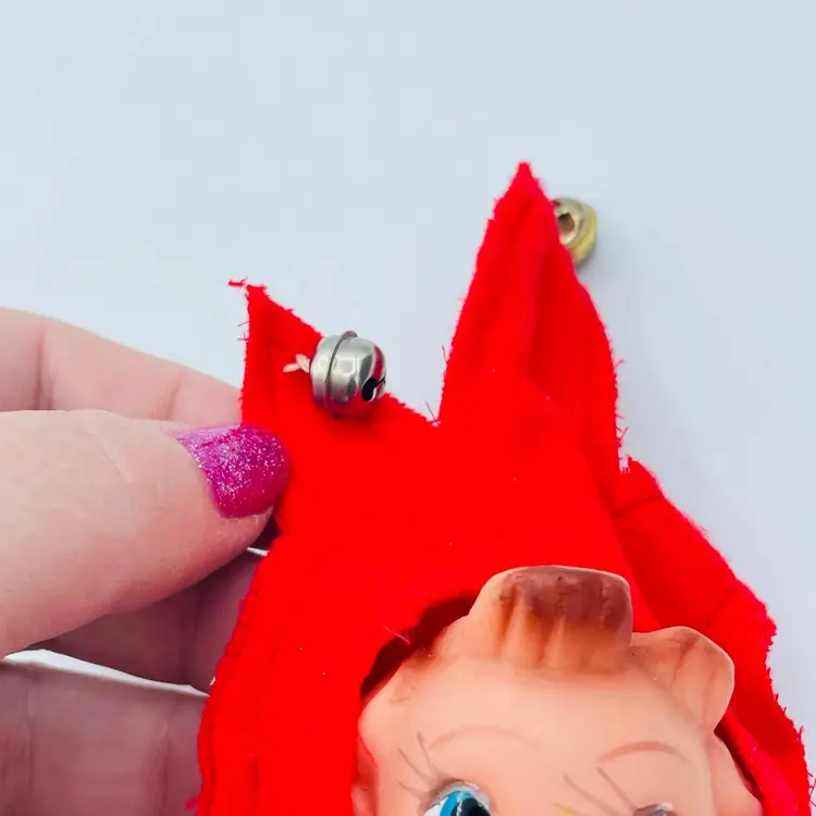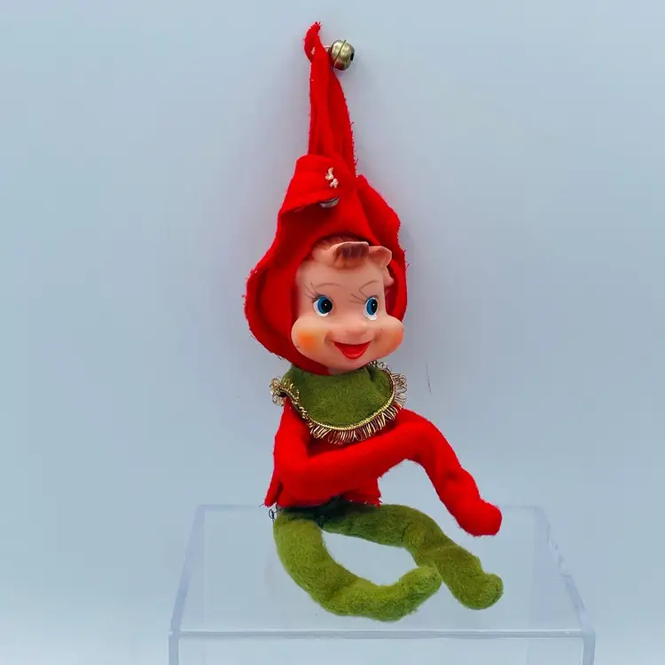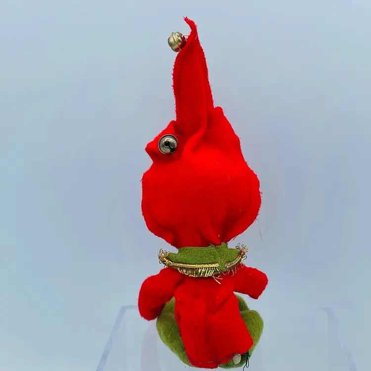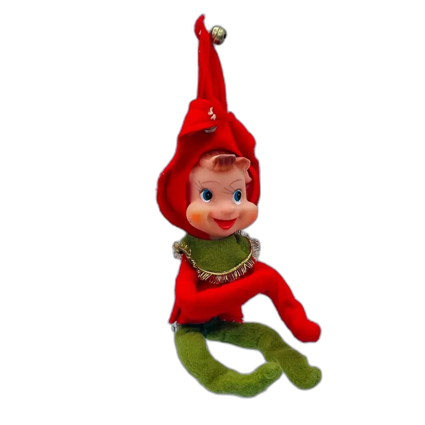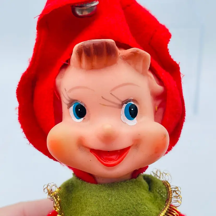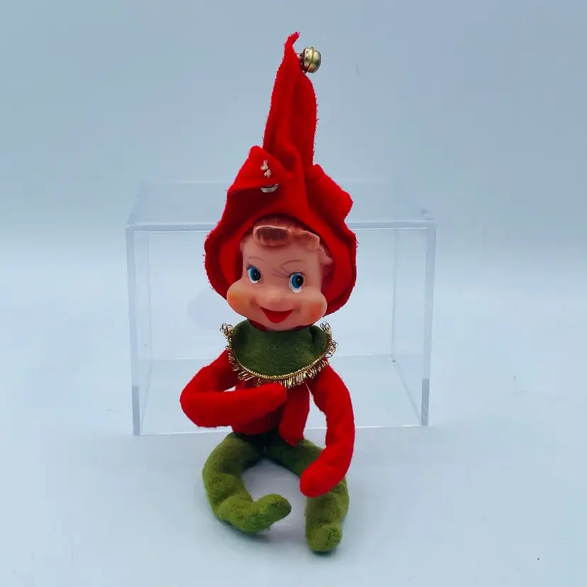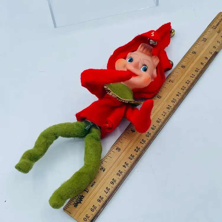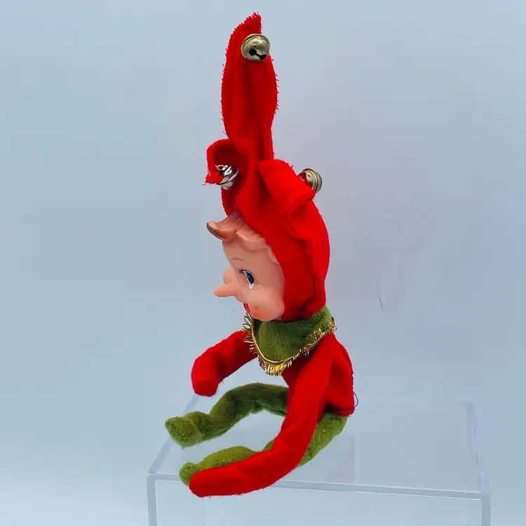 Cute red/green vintage elf- nice little jingle bells in hate. Plastic face. Posable arms and legs. See all images for more info and details.