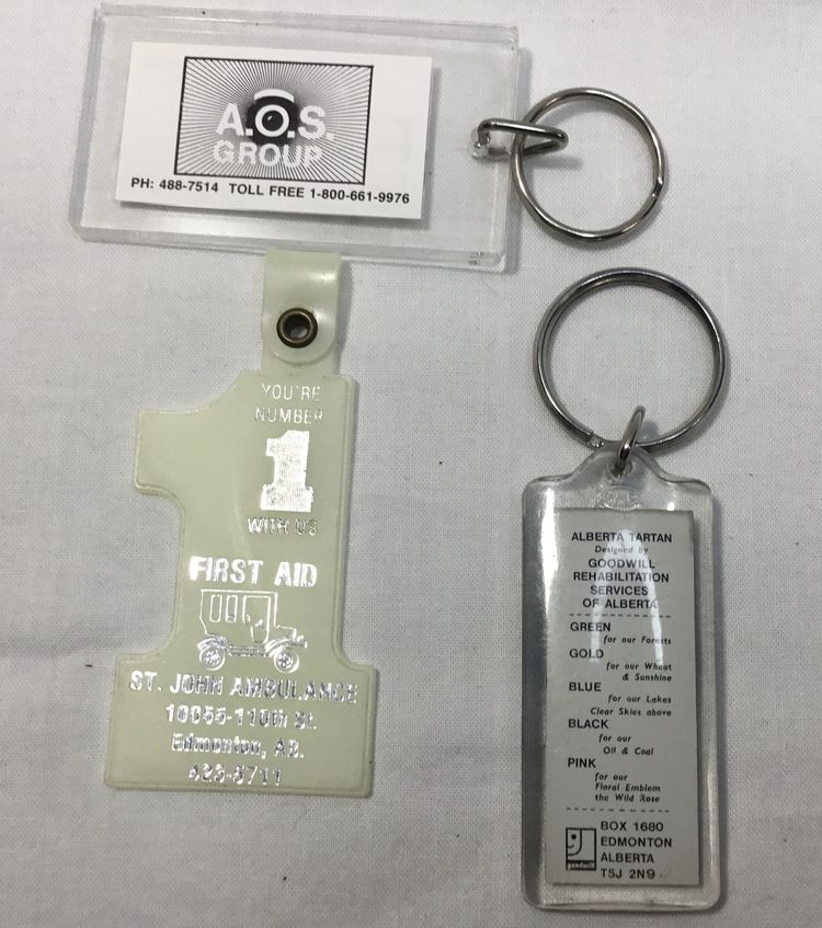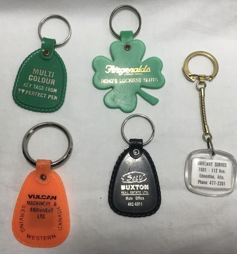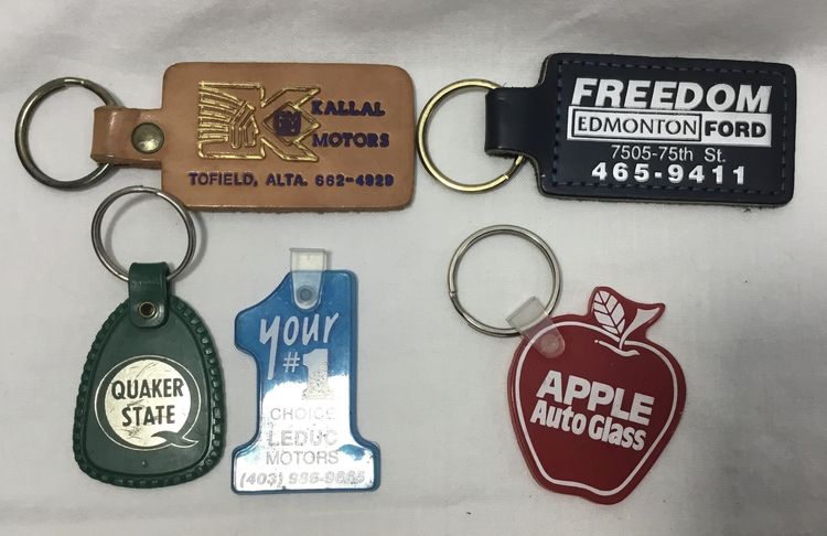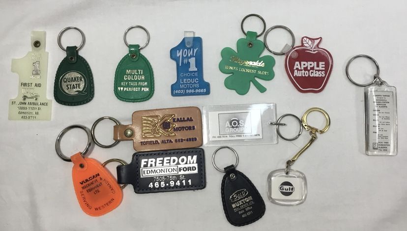 Lot of 13 advertising key rings. 5 car related: Freedom Ford, Kallal Motors, Quaker State, Apple Auto Glass, LeDuc Motors. 3 medical related: Optomitrist's Group, St. John's Ambulance, Goodwill Rehabilitation services. 5 miscellaneous: Fitzgerald's Casino Reno, Vulcan Machinery, Buxton Real Estate, Perfect Pen Keytags, Gulf Driveway Service.