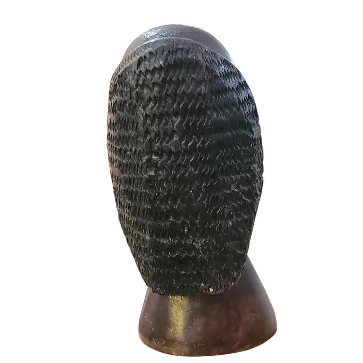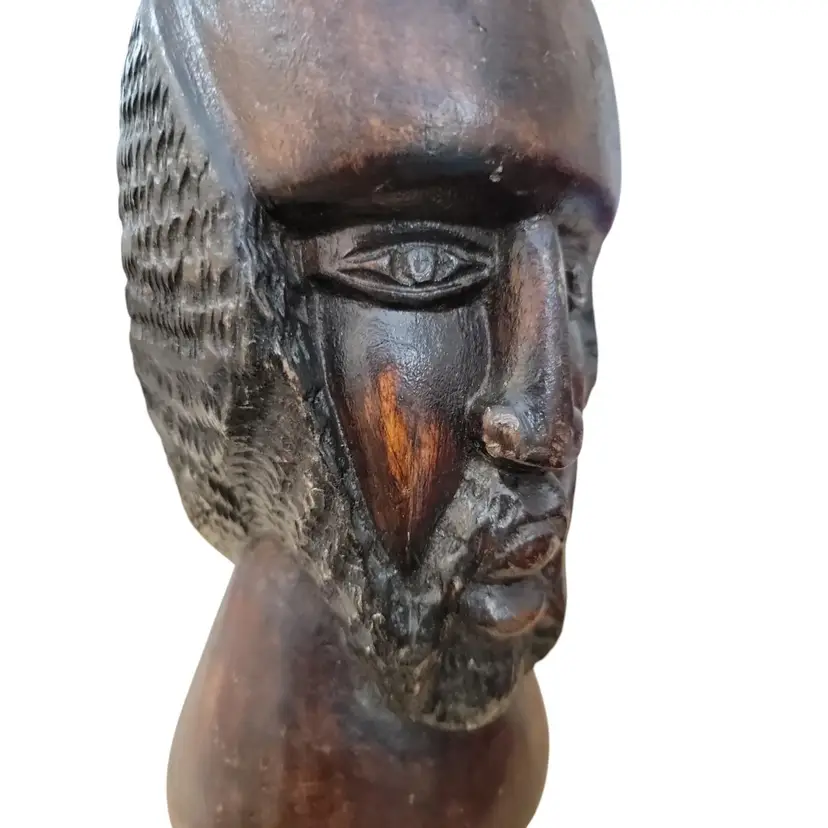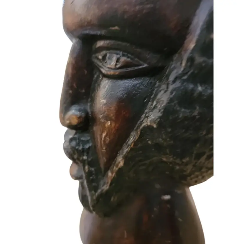 The product is an African Folk Art Tribal Carved Male Head/ Bust or Statue, 10 " tall, approximately 6" at his widest and, before protective packaging, weighs 2 lbs. It features intricate carving and staining, with a realistic portrayal of a male head. There is some wear to the stain coverage in some spots, but it adds to the weathered look of this man. See photos.