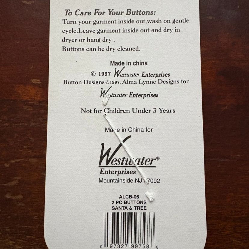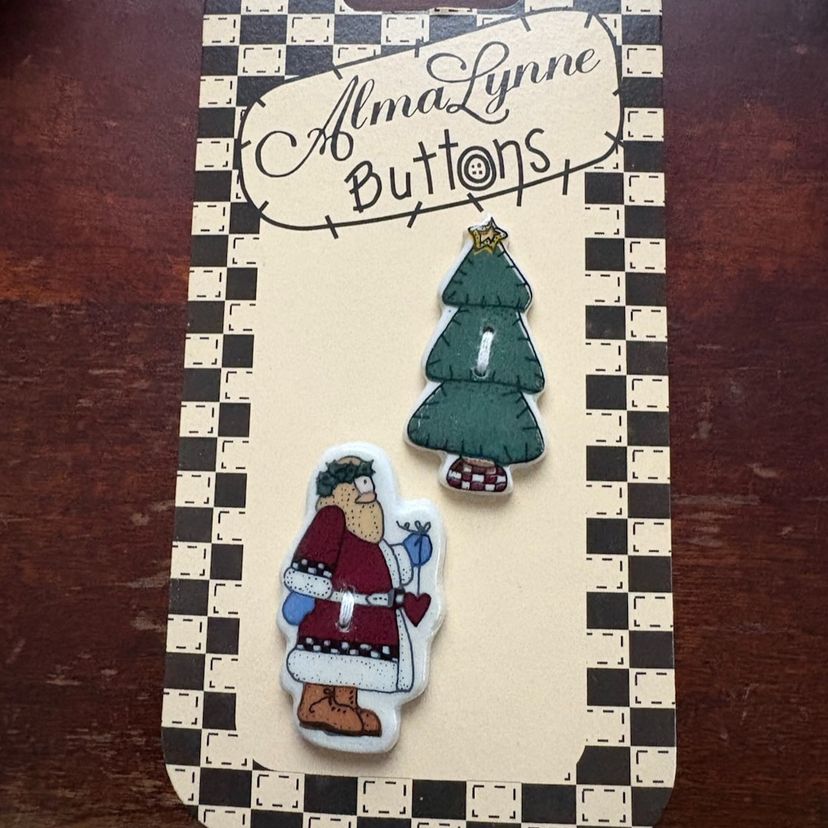Alma Lynne Ceramic Christmas Buttons Set of 2 buttons Featuring Santa and tree Sizes are approximately1 1/2 inches by 3/4 inches 1997