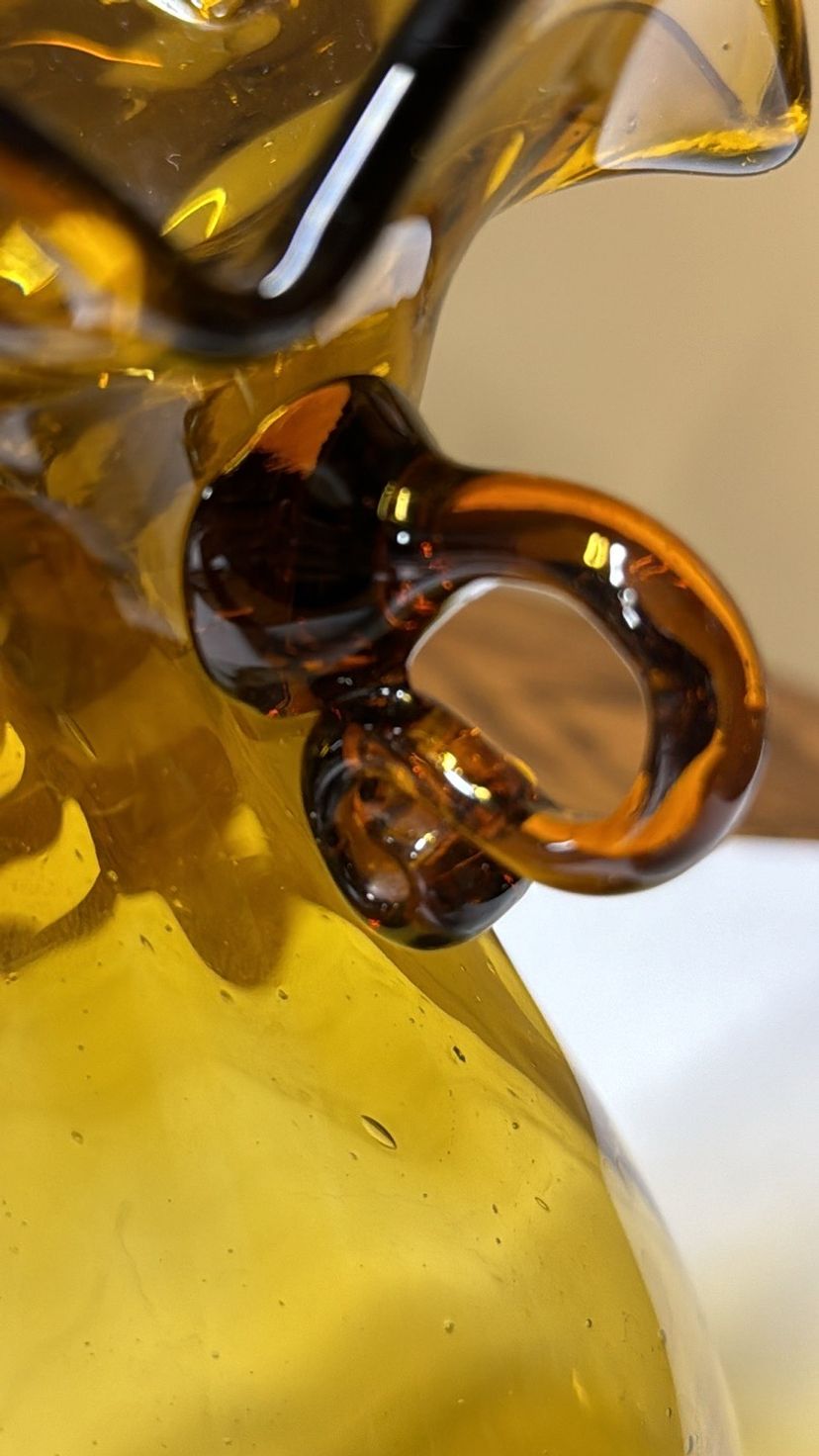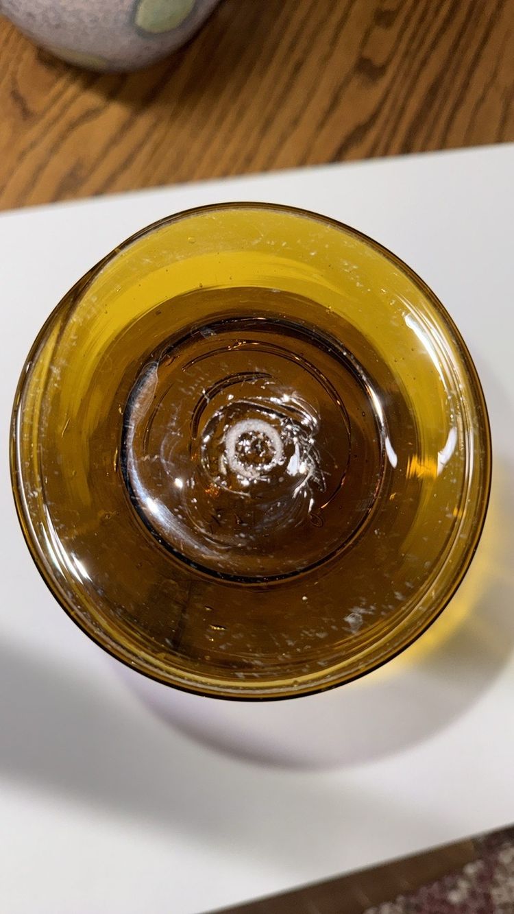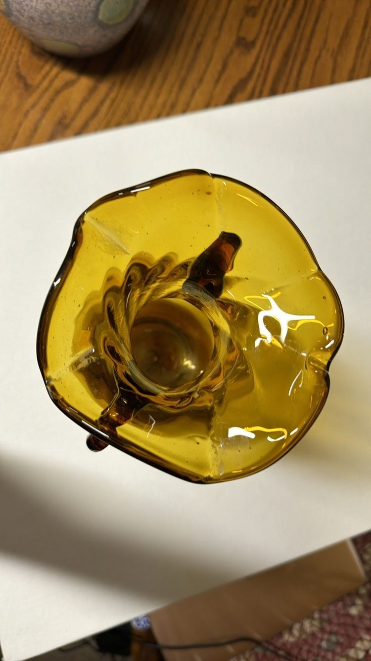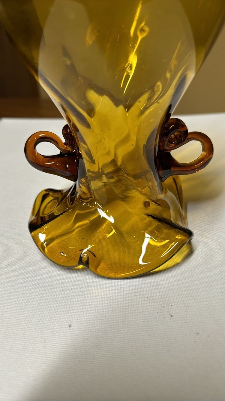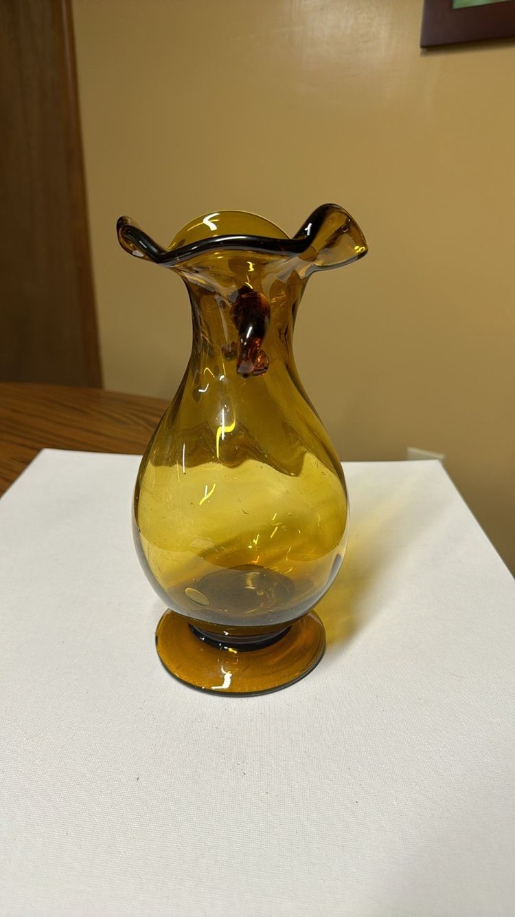 Amber brown hand blown vase 9.5” tall about 4.5” diameter on top Two applied handles Pedestal vase Bubbles in the glass No breaks or chips there are some scratches Nice handmade vase (3914241)
