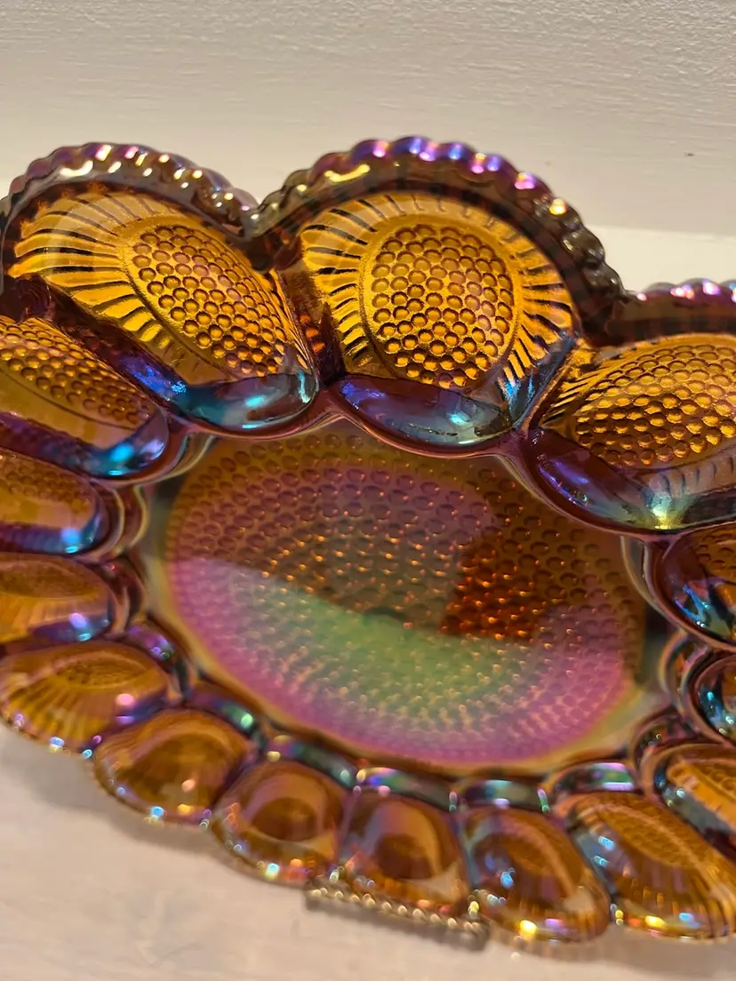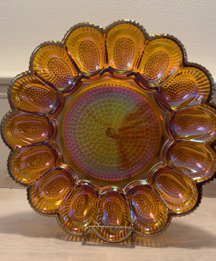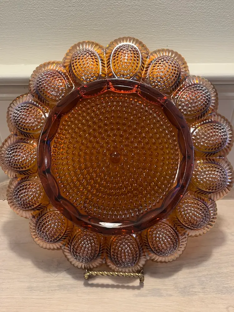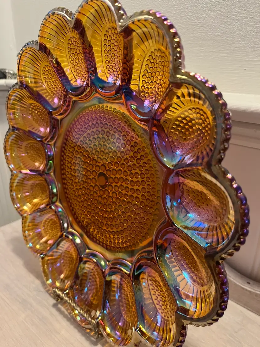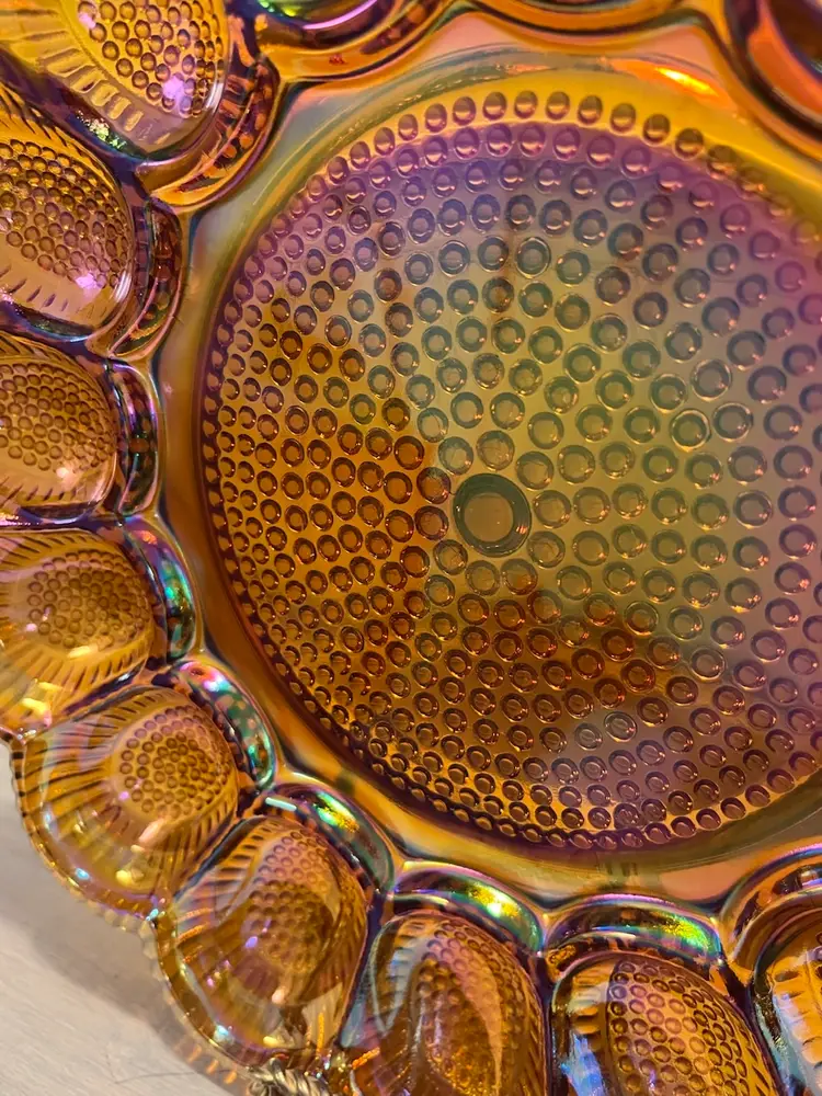 Vintage Amber Carnival Indiana Glass Iridescent Hobnail Armadillo Deviled Egg Tray. Beautiful condition with amazing iridescence. This tray measures approximately 11” wide and 1 3/4” tall. It is HEAVY and weighs approximately 4lbs
