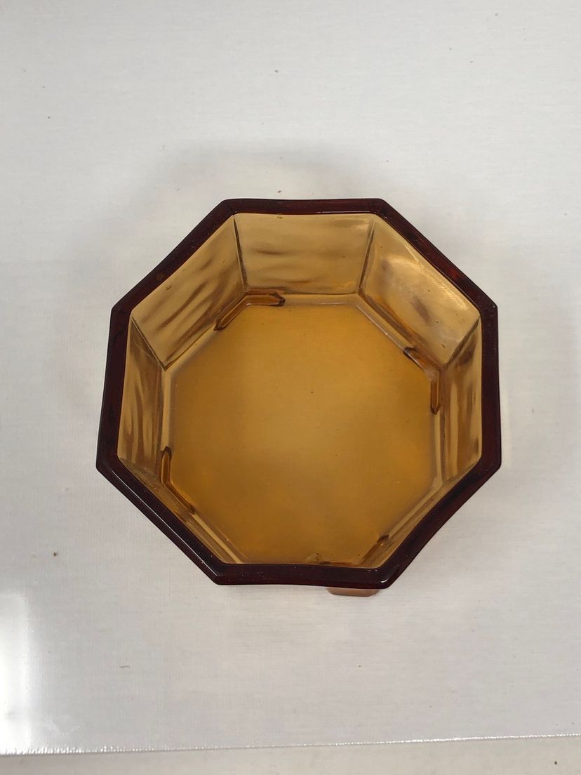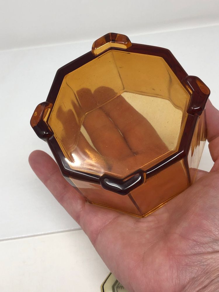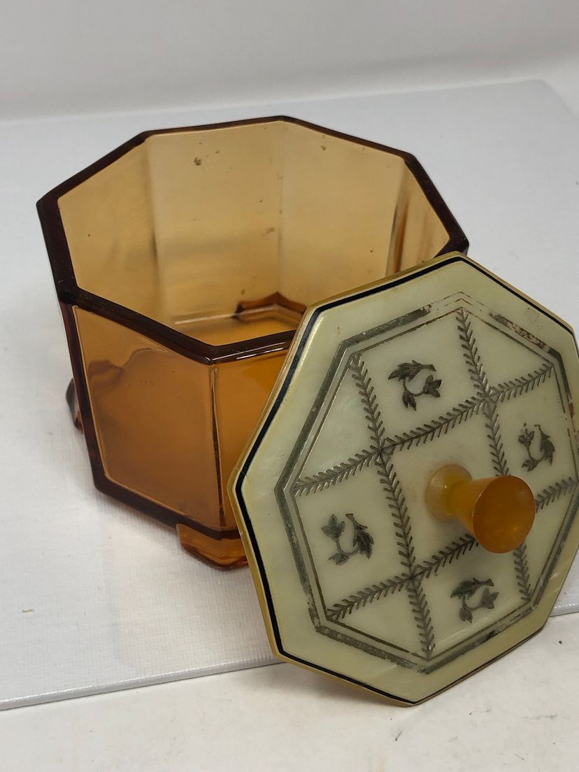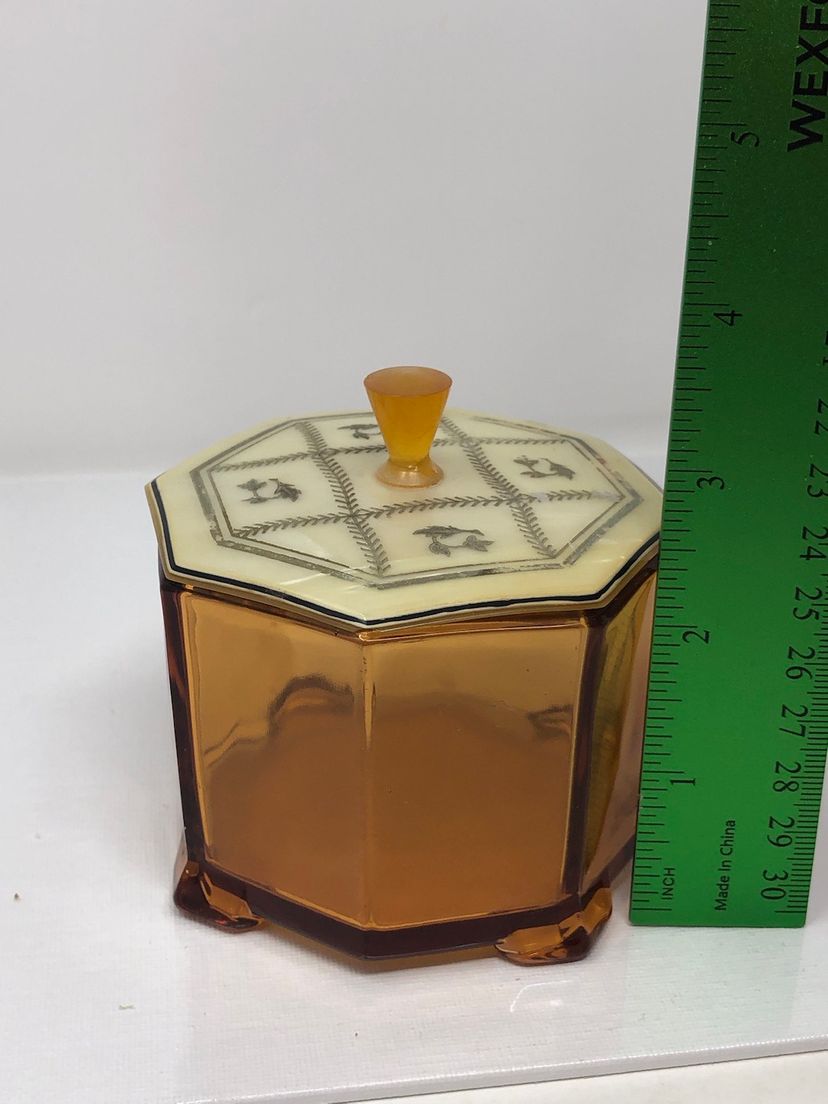 3" amber glass footed octagonal jar, no chips or cracks. Celluloid lid with floral design and handle has some chipping on the underside, but is still functional and lovely. No markings or labels