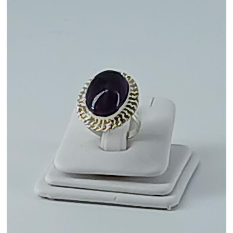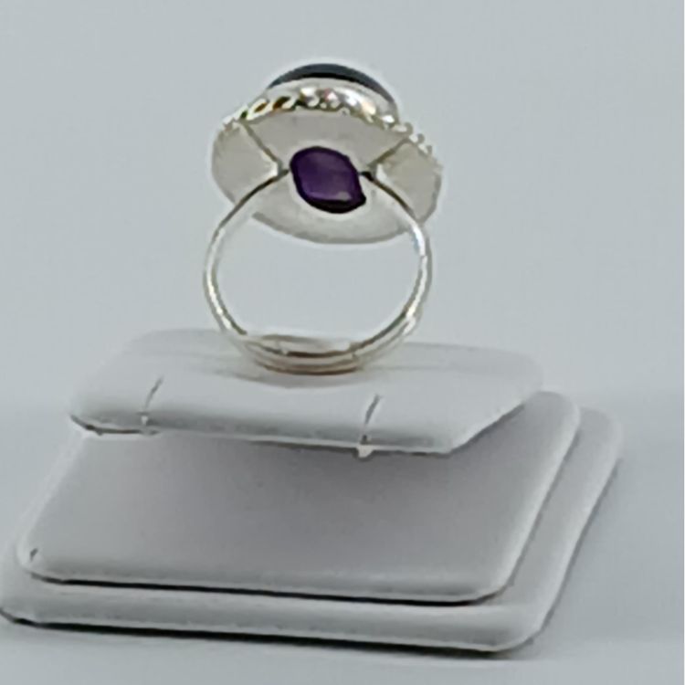 RM1625 – An Amethyst gem stone has been mounted into a Sterling Silver setting. Stone measures 3/4x 9/16 inches and setting measures 1 x 13/16 inches. Ring is a size 9.