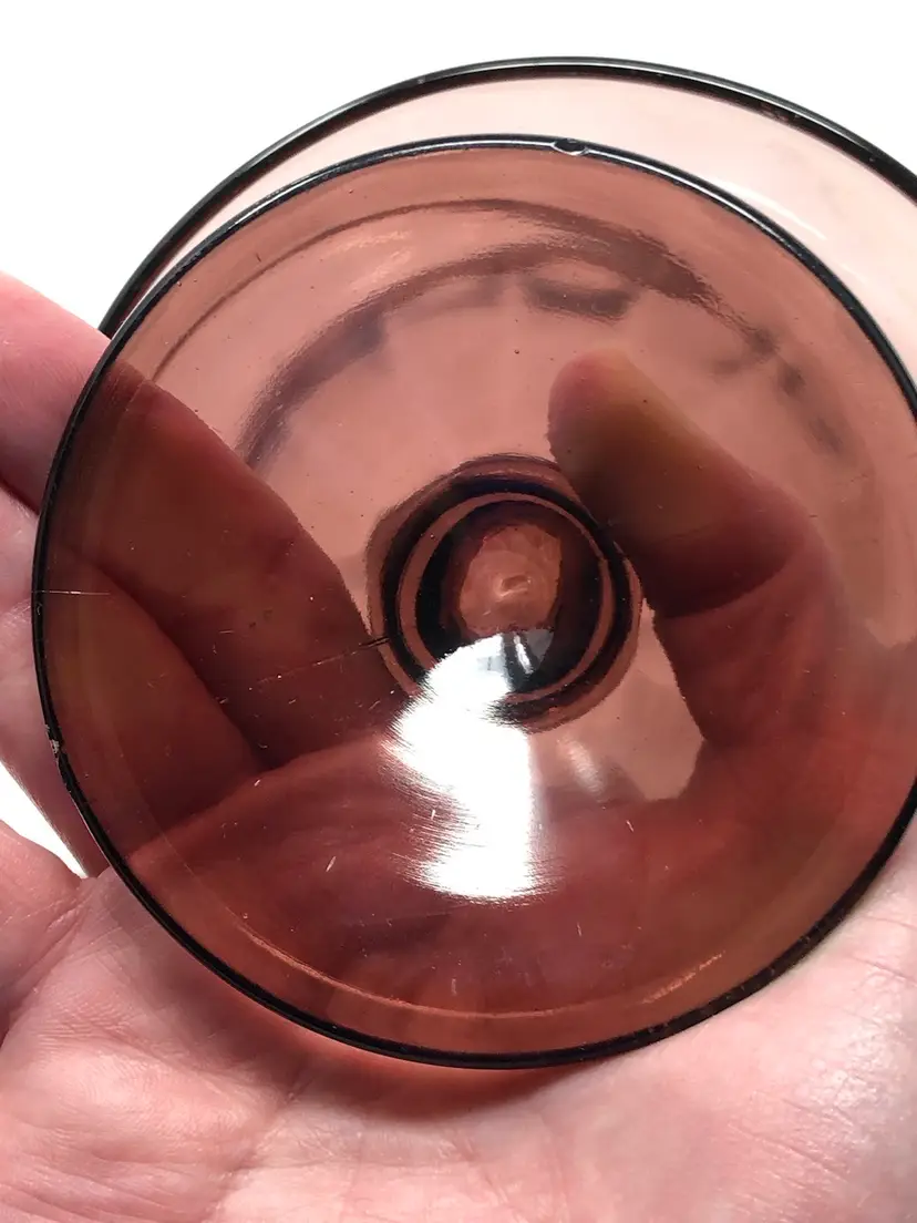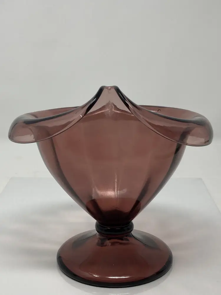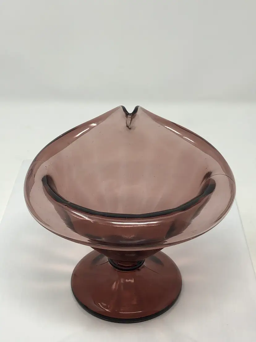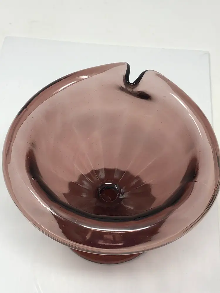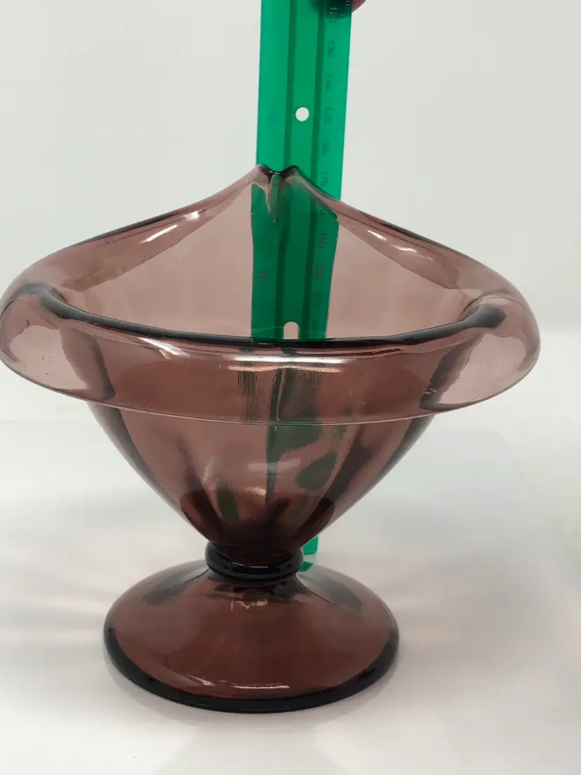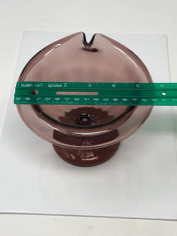 5 1/2" tall and across, this purple dish has a striped optic pattern and stands on a slender pedestal base. No markings or labels, no chips or cracks.