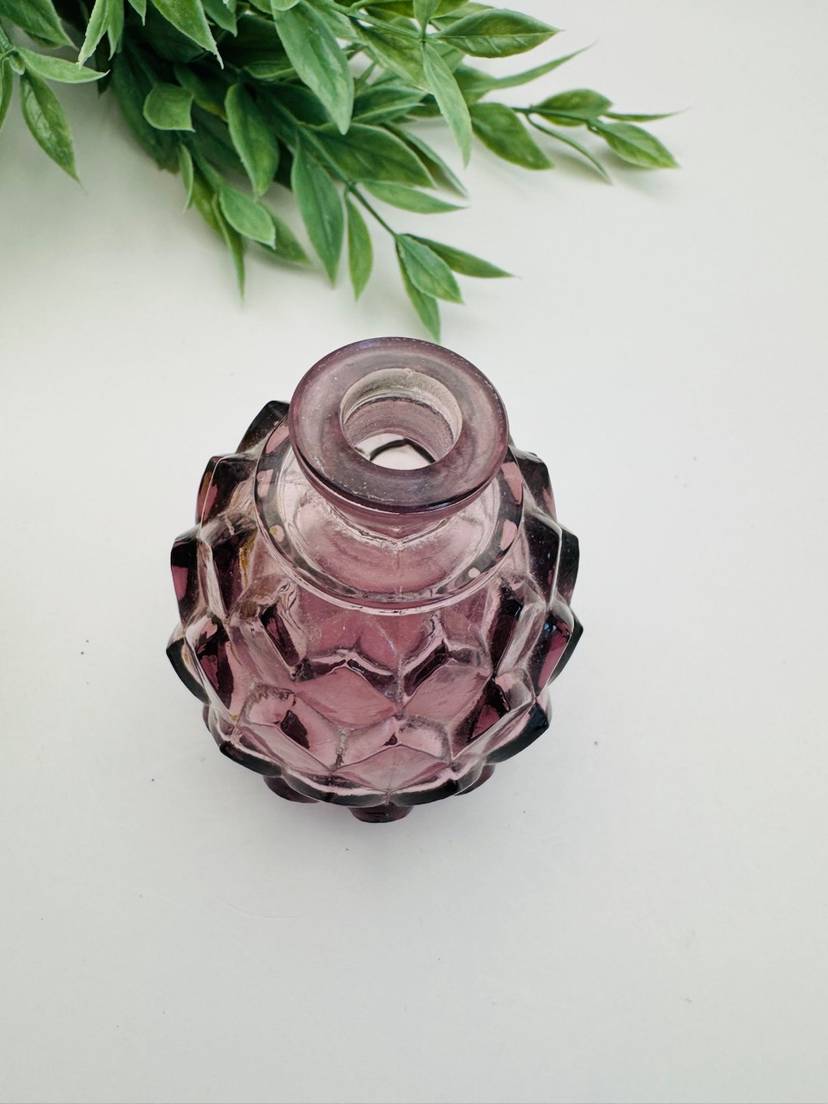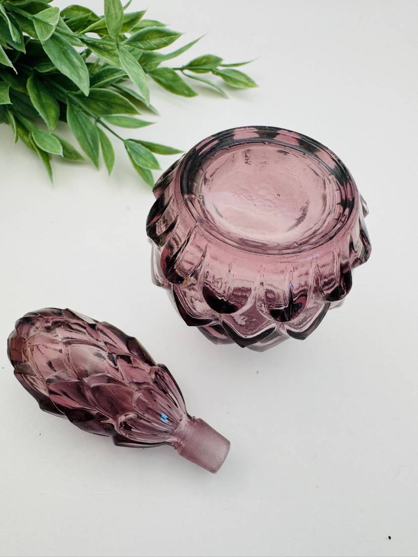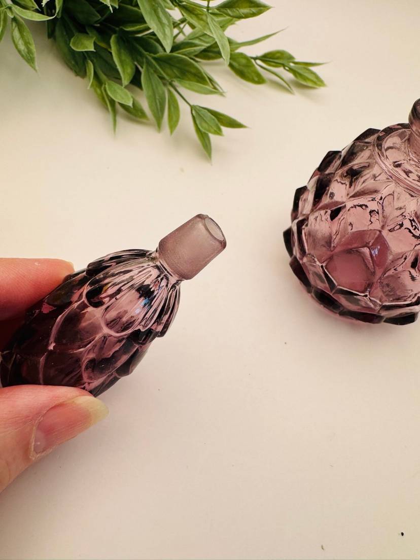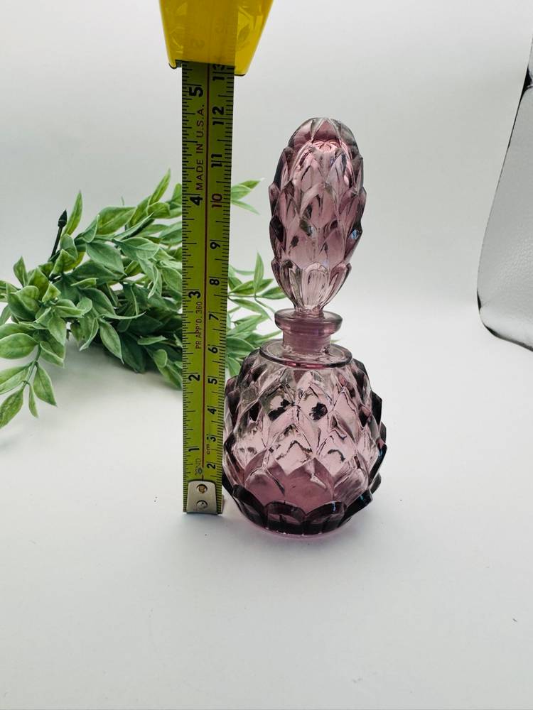 Beautiful amethyst perfume bottle. Glass stopper, no chips. 5” tall, 2.25 diameter