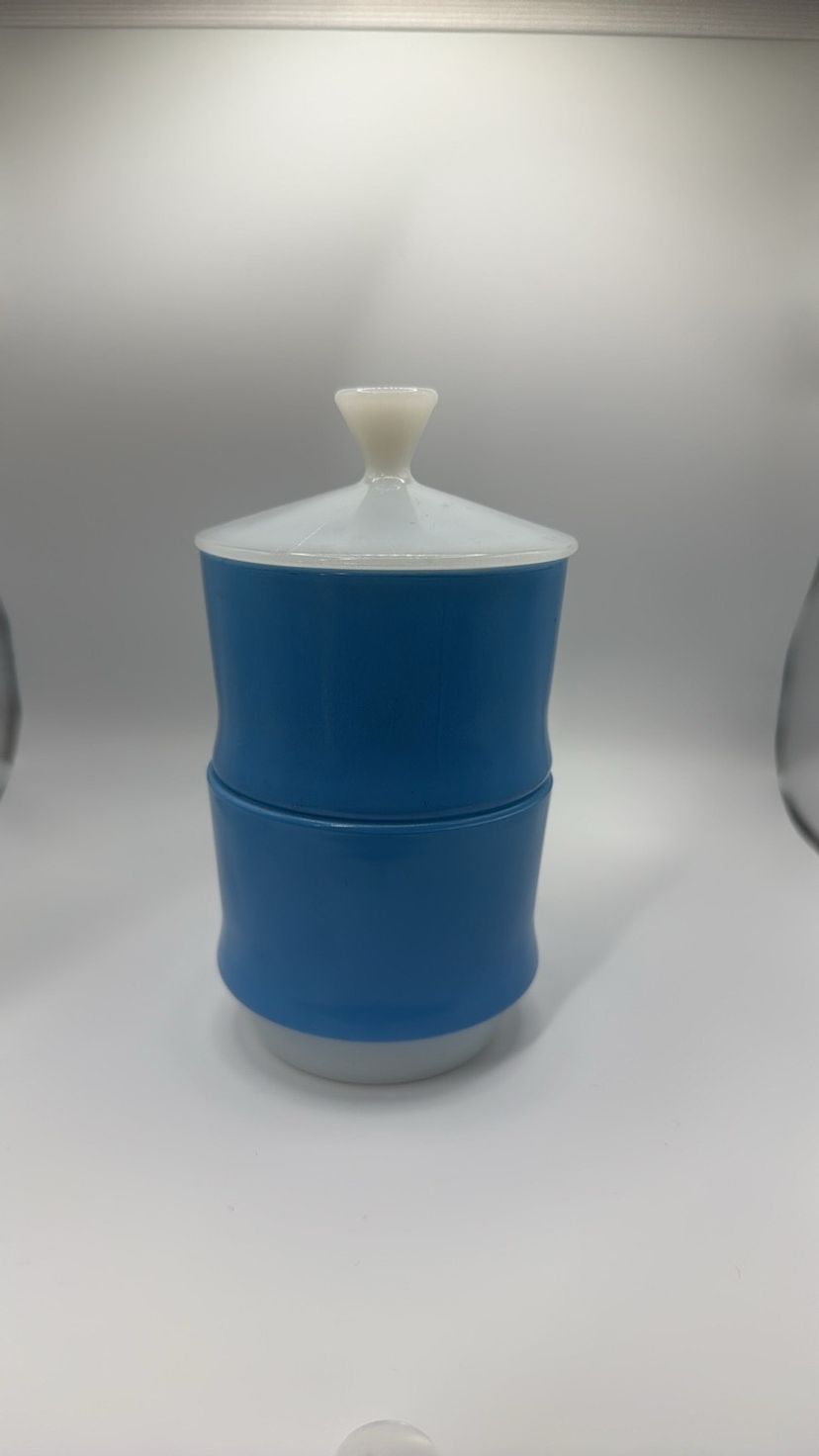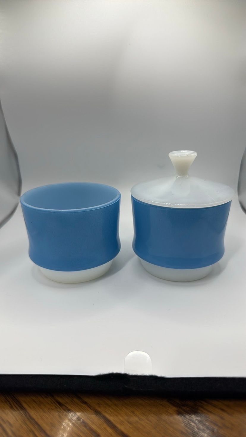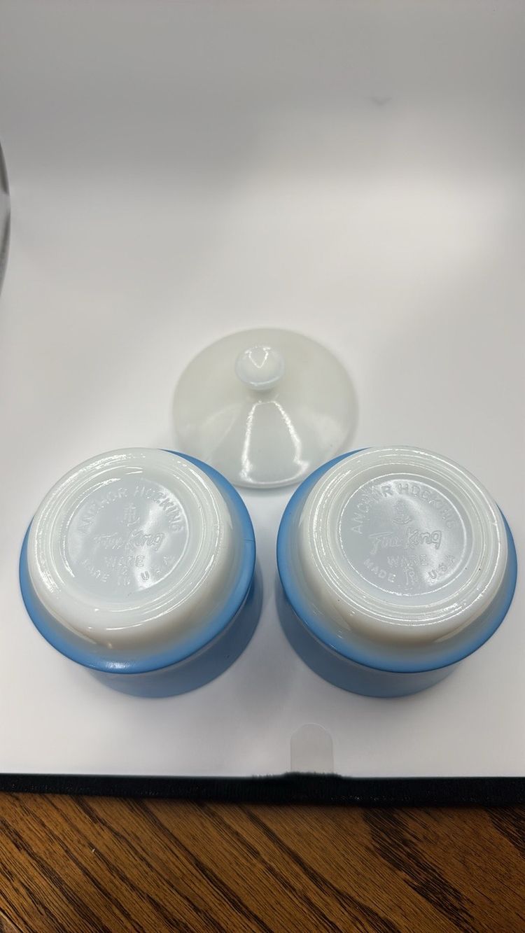 Anchor Hocking Fire King Ware Blue and White set of 2 Condiment dishes or Sugars with one Lid 4.5 inches tall to top of lid x 3.25 inches wide They stack No chips or cracks they look almost new