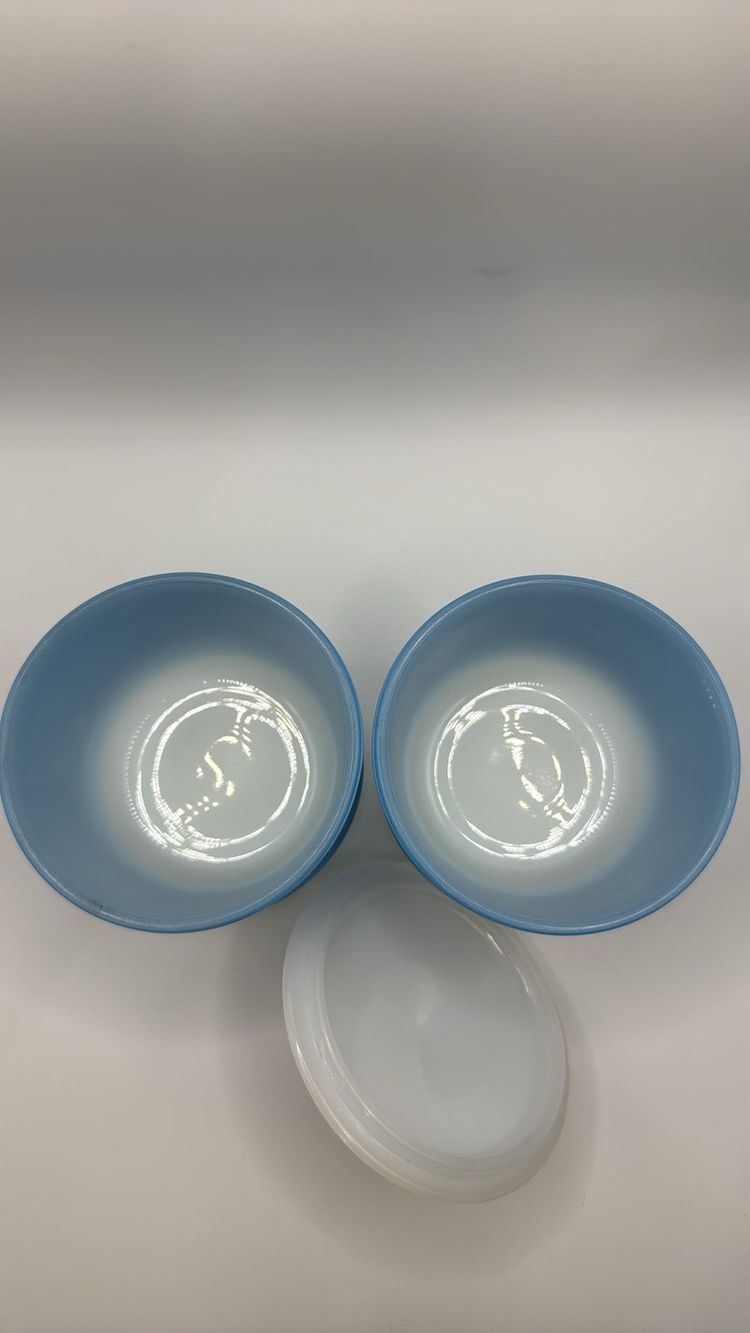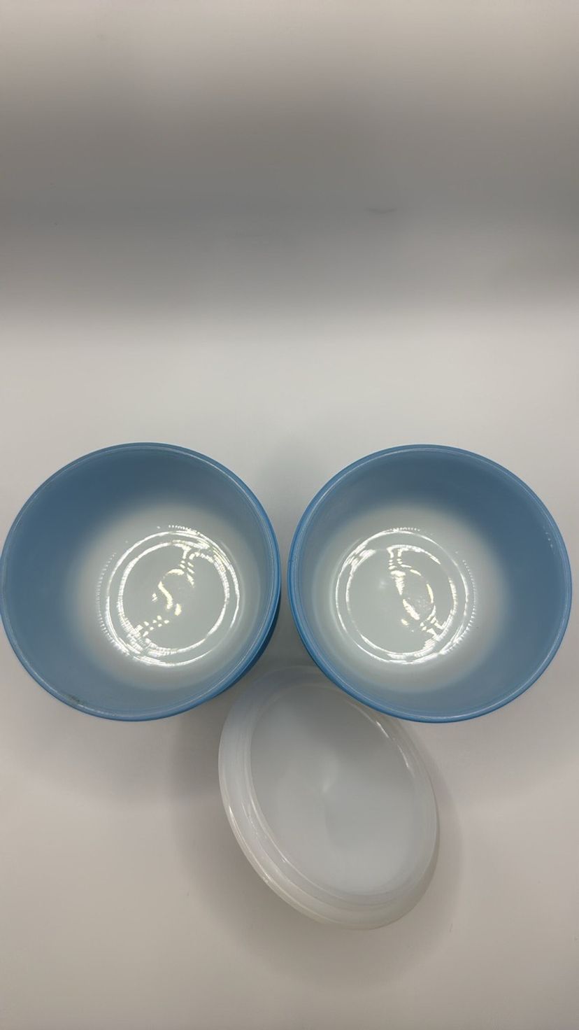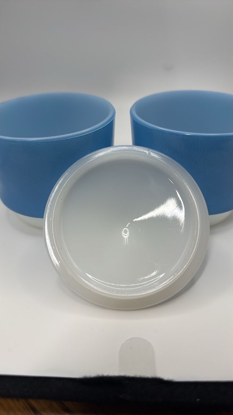 Anchor Hocking Fire King Ware Blue and White set of 2 Condiment dishes or Sugars with one Lid 4.5 inches tall to top of lid x 3.25 inches wide They stack No chips or cracks they look almost new