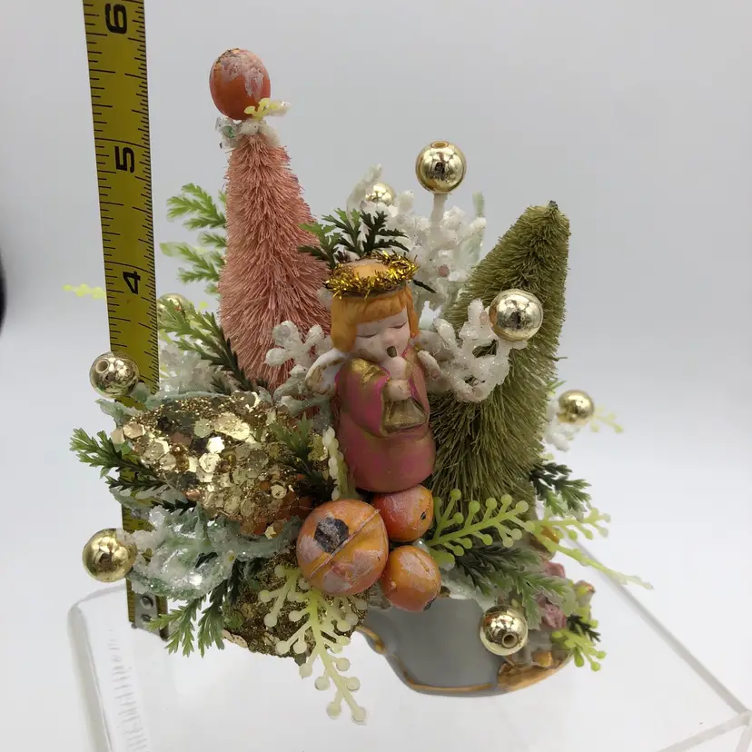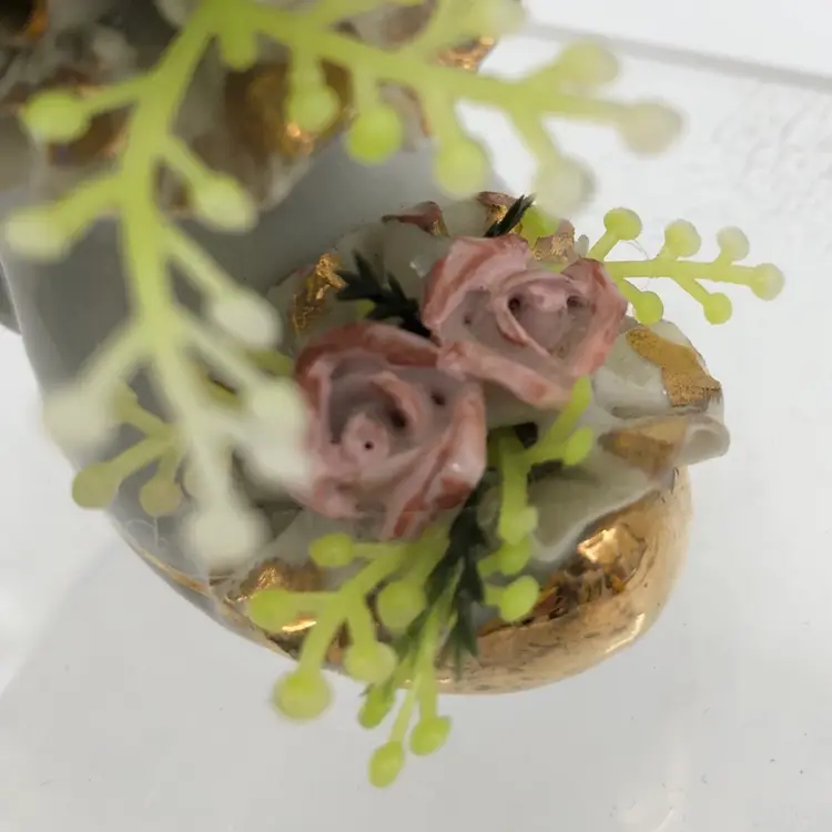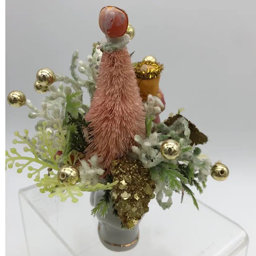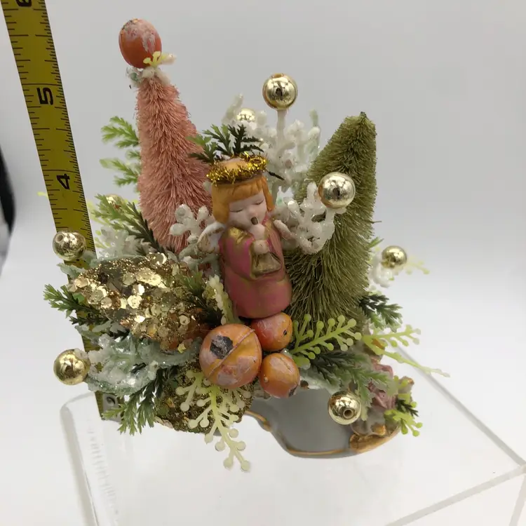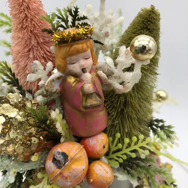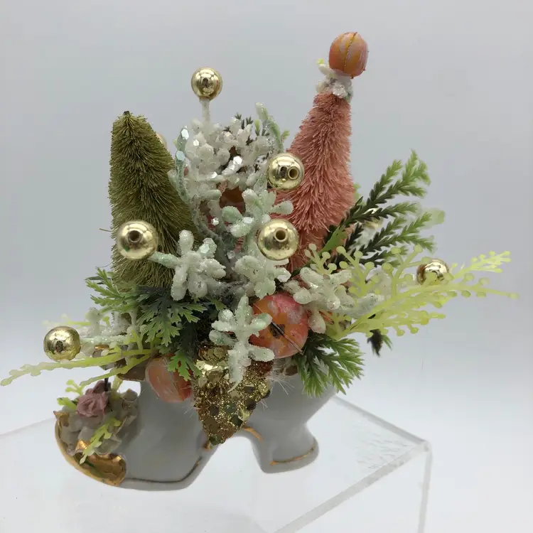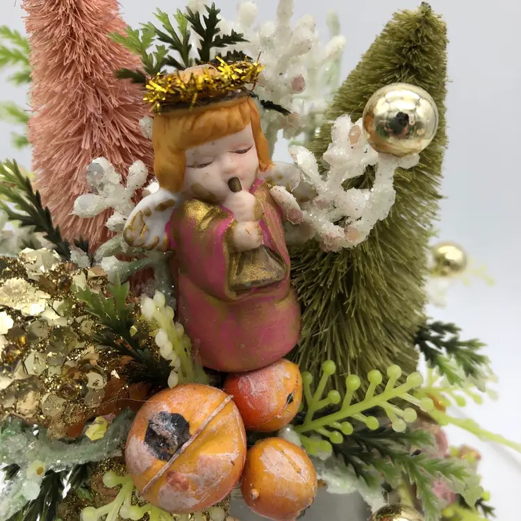 Glamorous gold, blush pink & green angel assemblage in a porcelain shoe. So much blingy goodness in one 6"H x 4 1/2"W package! It was fun to make and I hope you enjoy it as much as I do.