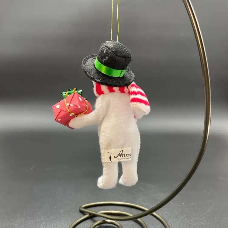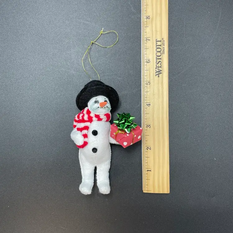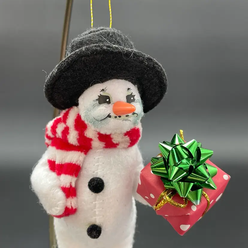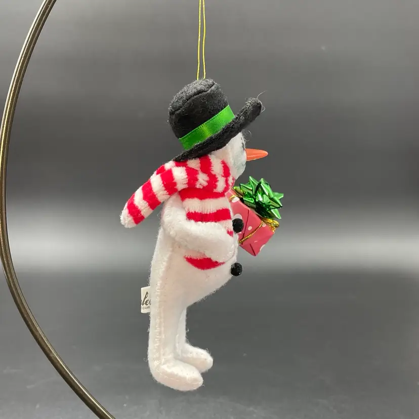 This is a 2014 Annalee Dolls Merry Mint Snowman with Gift hanging ornament. Measures approximately 5" long. No major flaws. Smoke free home. #238