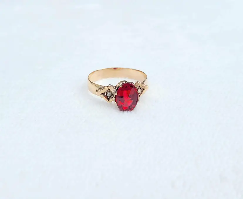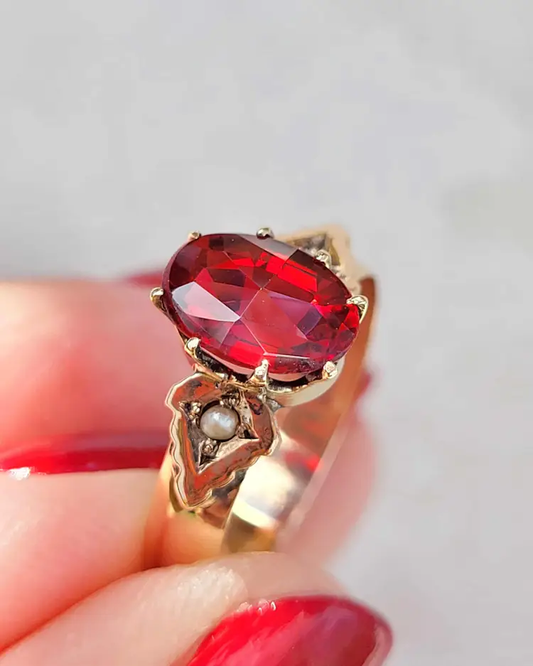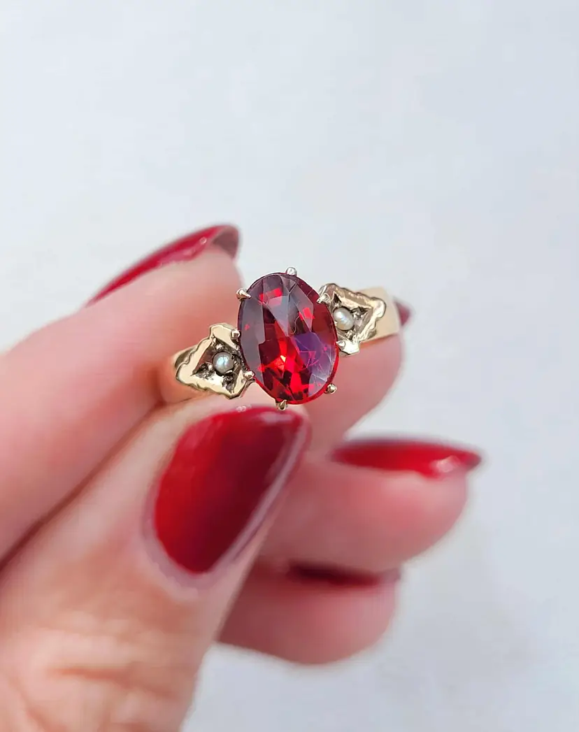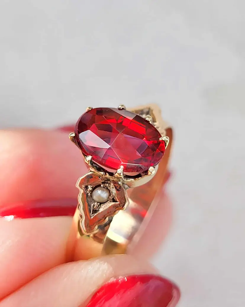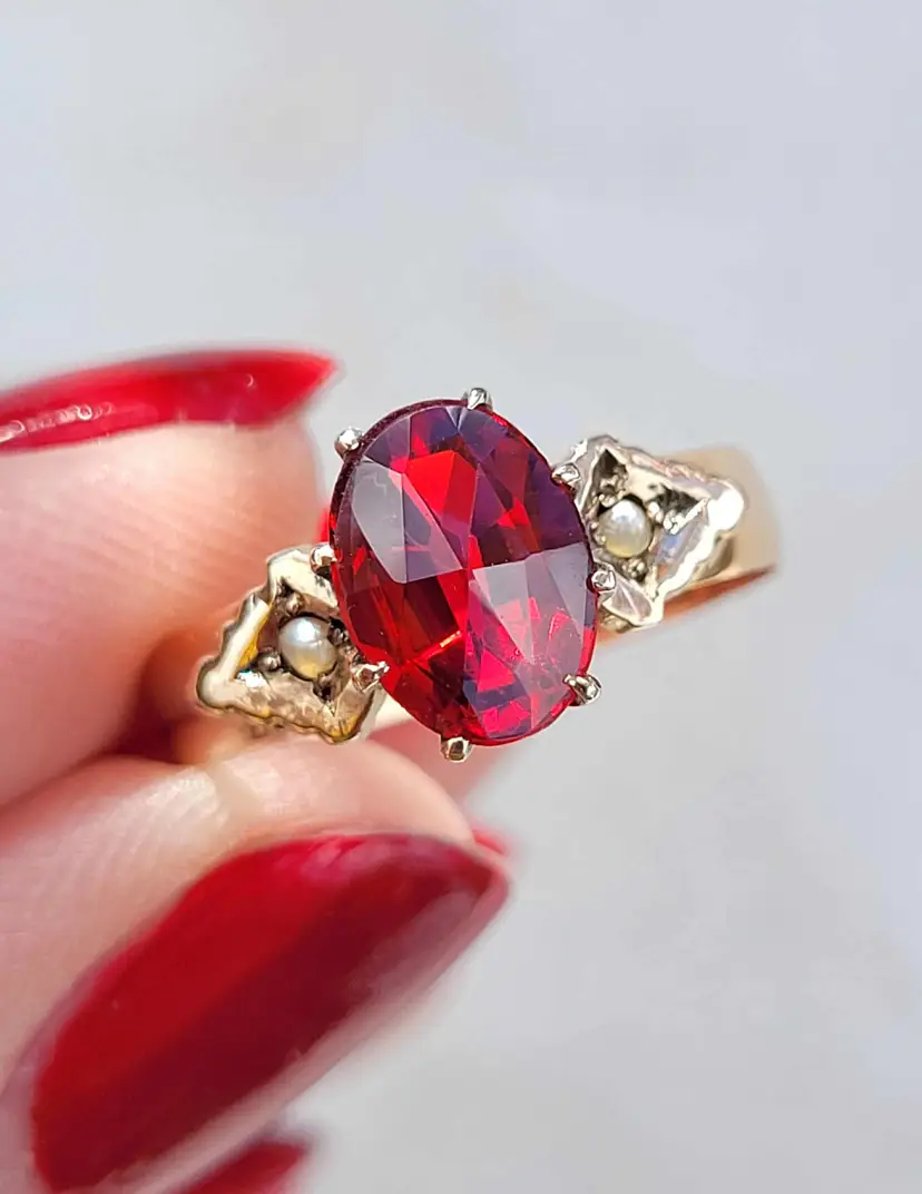 Gorgeous 10k yellow gold Victorian ring, featuring the most vibrant cherry red garnet I've ever seen, with a little seed pearl on either side. The garnet has a really interesting cut that's almost rose cut at the top, letting more light in. The gemstone is verified via Presidium tester and Spectrometer. The metal content is unmarked but it tests as solid 10k via Auracle tester and acid testing, and it does have an inscription inside the band. It is in good condition. Please see pictures for details, does not include my ring box.