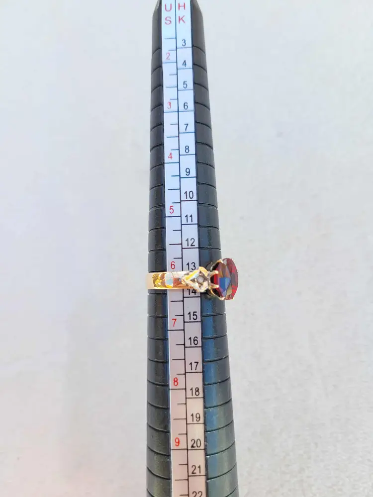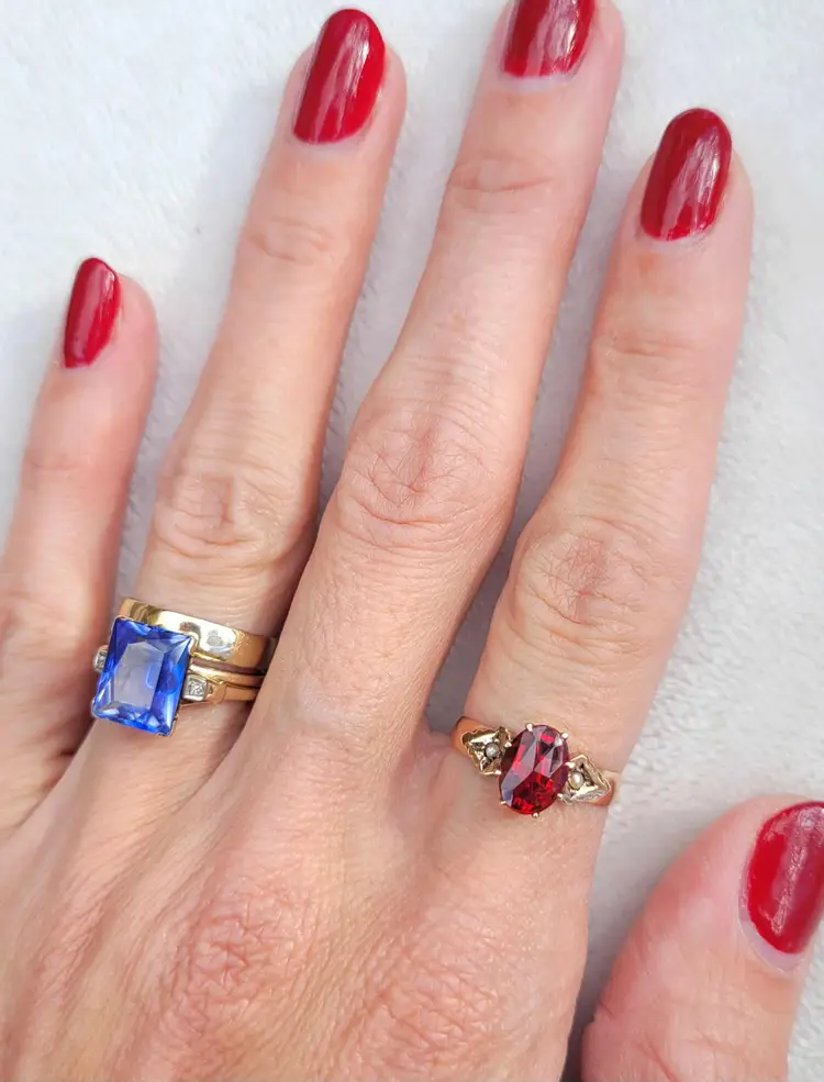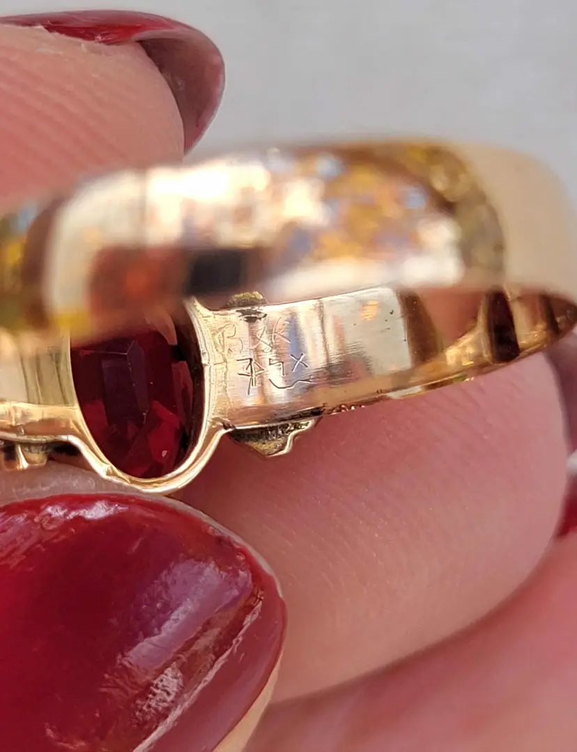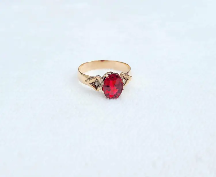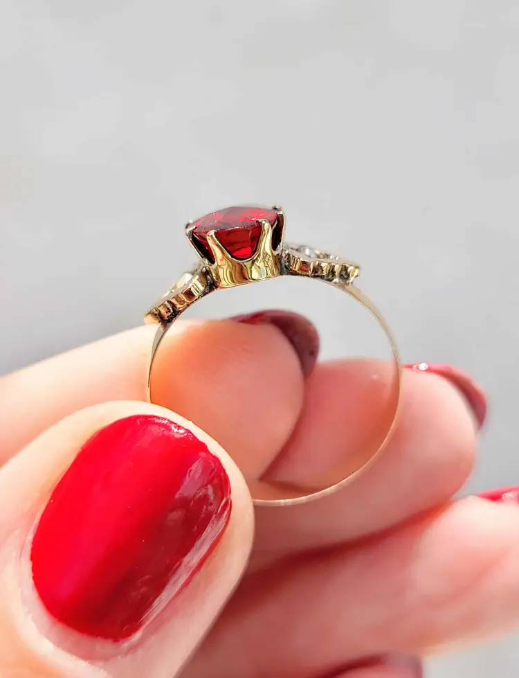 Gorgeous 10k yellow gold Victorian ring, featuring the most vibrant cherry red garnet I've ever seen, with a little seed pearl on either side. The garnet has a really interesting cut that's almost rose cut at the top, letting more light in. The gemstone is verified via Presidium tester and Spectrometer. The metal content is unmarked but it tests as solid 10k via Auracle tester and acid testing, and it does have an inscription inside the band. It is in good condition. Please see pictures for details, does not include my ring box.