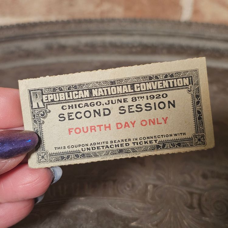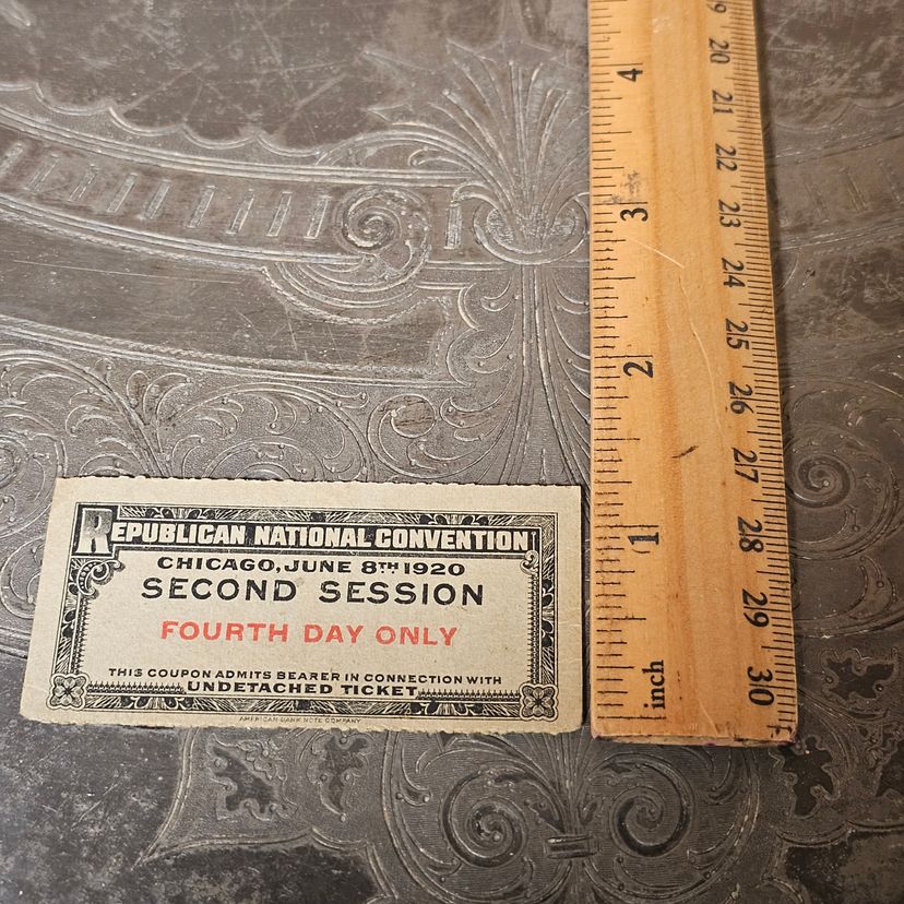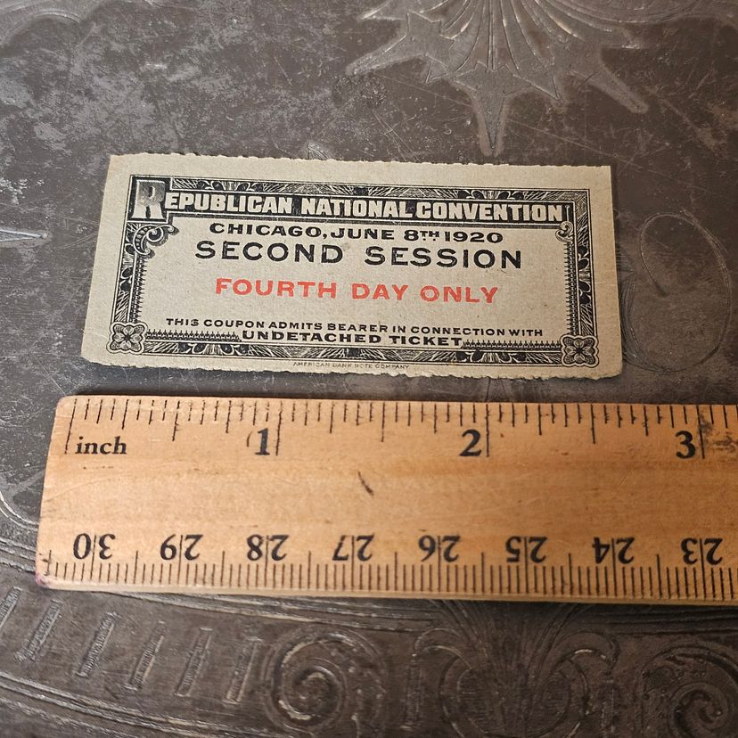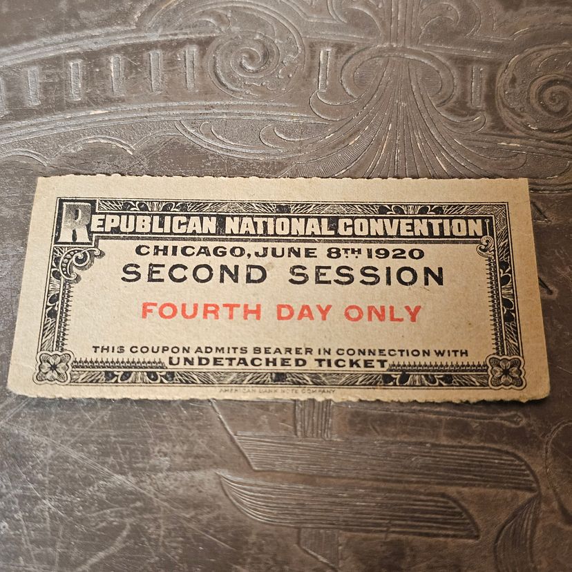 Authentic 1920 Republican National Convention ticket stub, a rare piece of early 20th-century American political history. This ticket was issued for the Second Session, Fourth Day Only (June 8, 1920) in Chicago, Illinois, where Warren G. Harding was ultimately nominated as the Republican candidate for President.