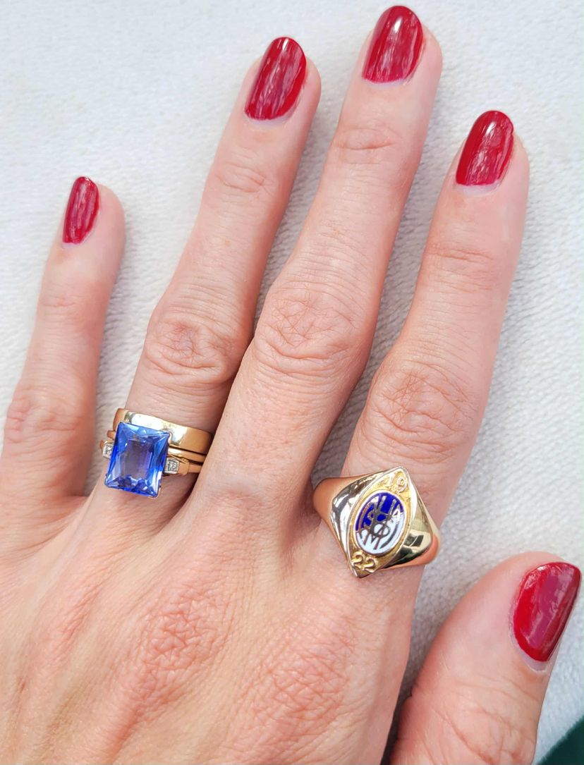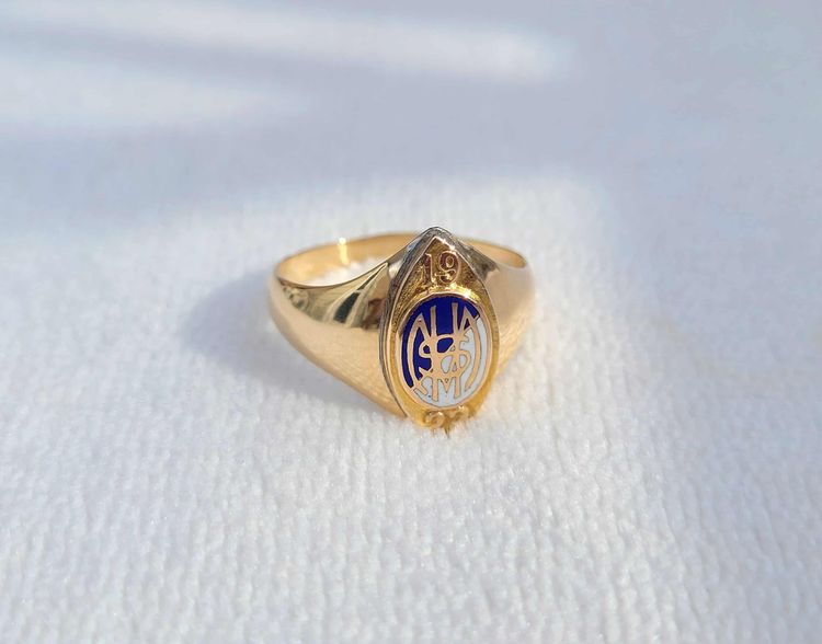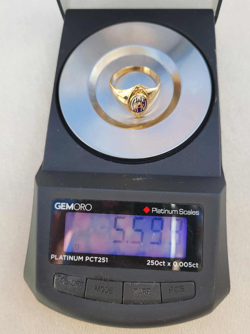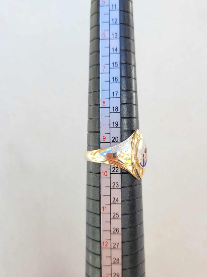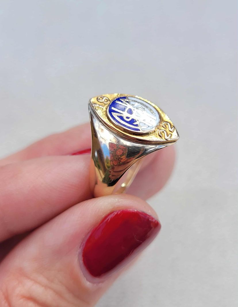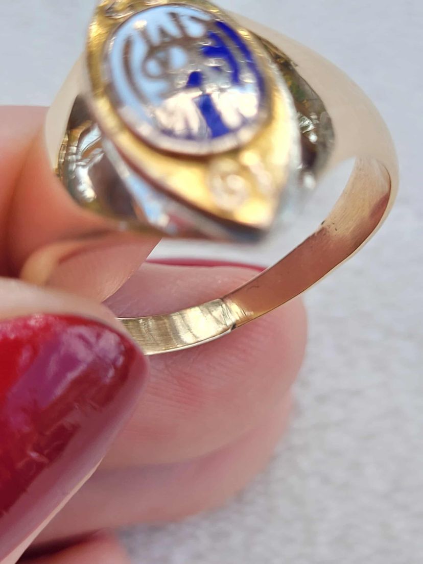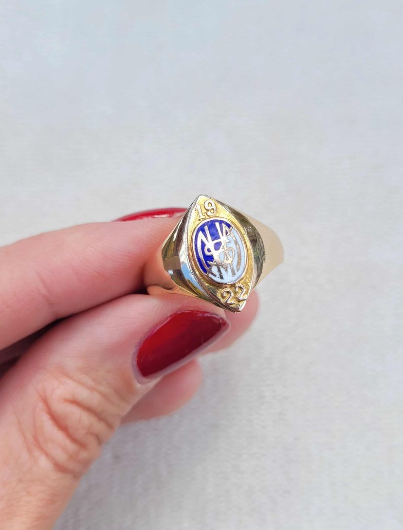 Handsome solid 10k yellow gold 1922 class ring! This is from an estate and in very good condition, weighing in at 5.59 grams. It is unmarked so has been tested via Auracle tester and acid testing to verify purity. There is beautiful cobalt blue enamel work on the front with a design that appears to say "MHS." Please see pictures for details and measurements, does not include my ring box.