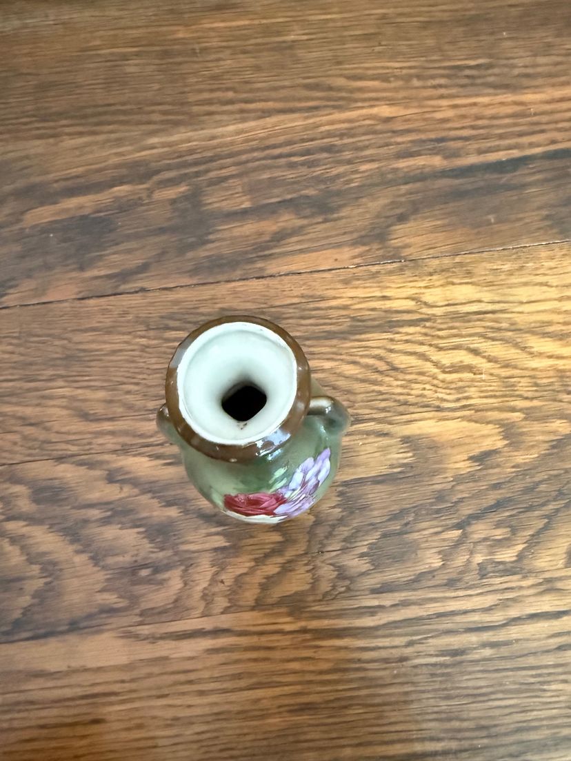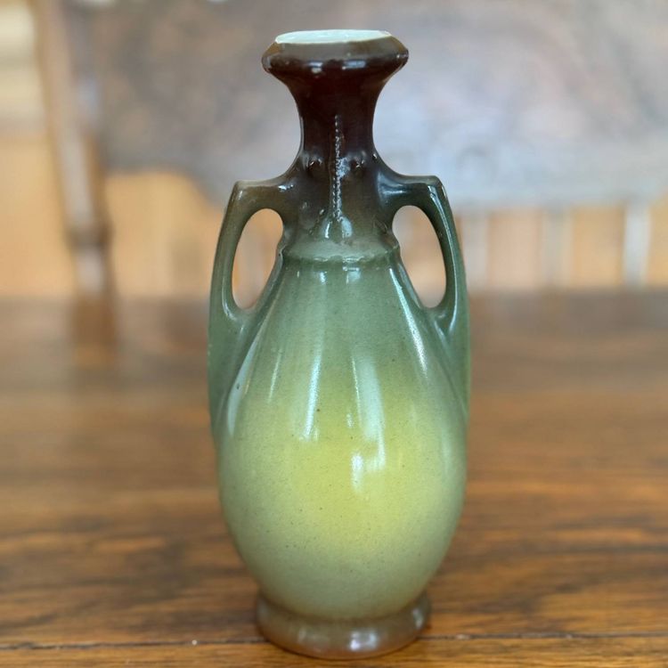 Add a touch of Art Nouveau elegance to your space with this beautifully hand-painted 7-inch pottery vase. It features a soft gradient glaze in shades of olive green to warm brown, accented with hand-painted florals in rose and violet hues. The dual handled, sculptural form and gilded detailing around the shoulder showcase the graceful lines and organic style that defined early 20th-century European ceramics.