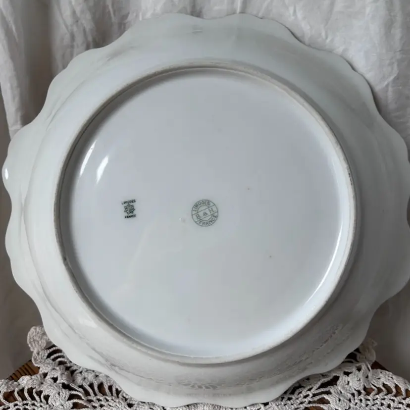 Very pretty porcelain serving bowl by B&H Limoges from France. B&H stands for Blakeman and Henderson which was a company that decorated porcelain blanks in the 1890s through the early 1900s. The bowl is in very good condition with just a little wear of the 24k gold on the scalloped edges. It measures 10.25” in diameter by 3” tall.