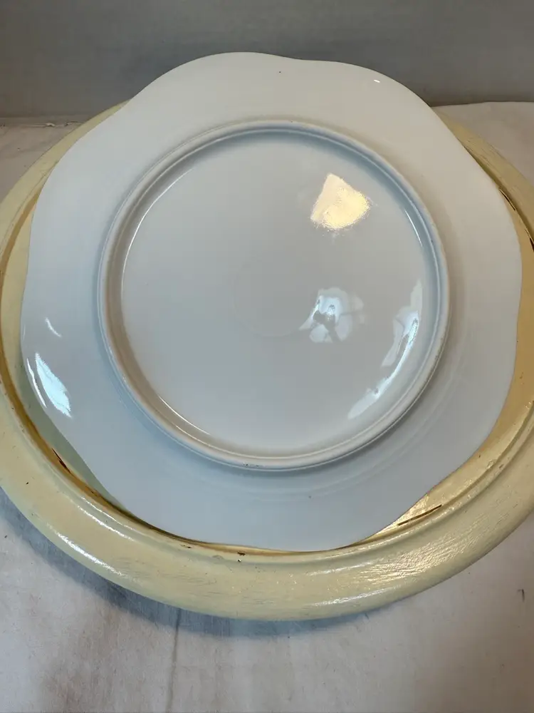 From the late 19th to early 20th century, likely Porzellan Fabrik Moschendorf . Has gold gilding, floral wreath details, scalloped edges. Has no chips or cracks there is some wear on paint, as shown in pictures. Measurements are 7 3/4” wide.