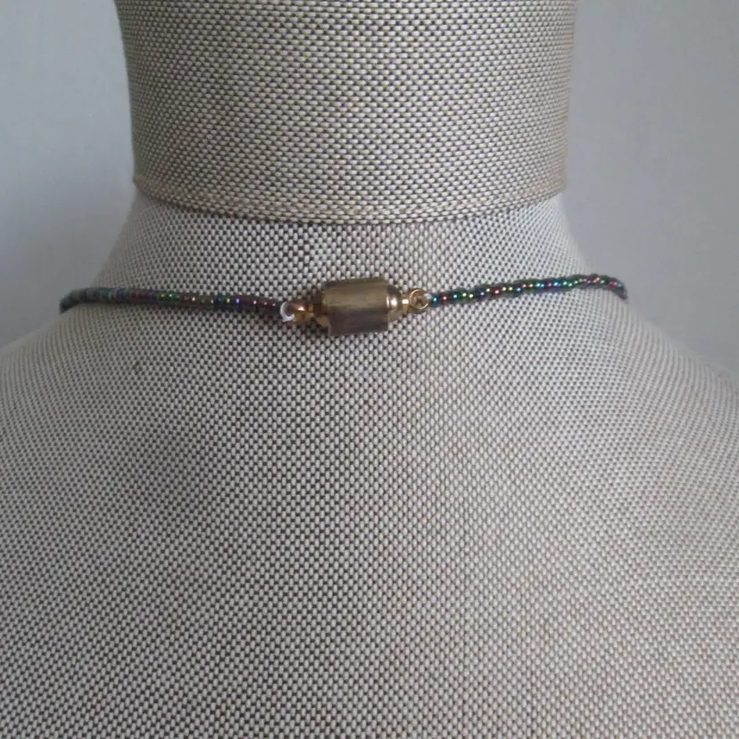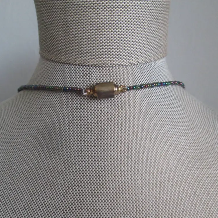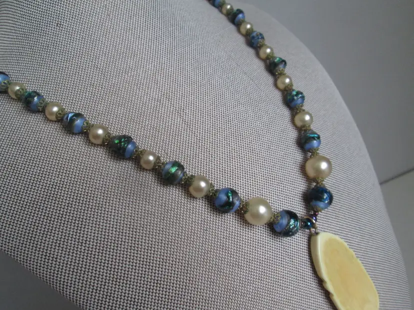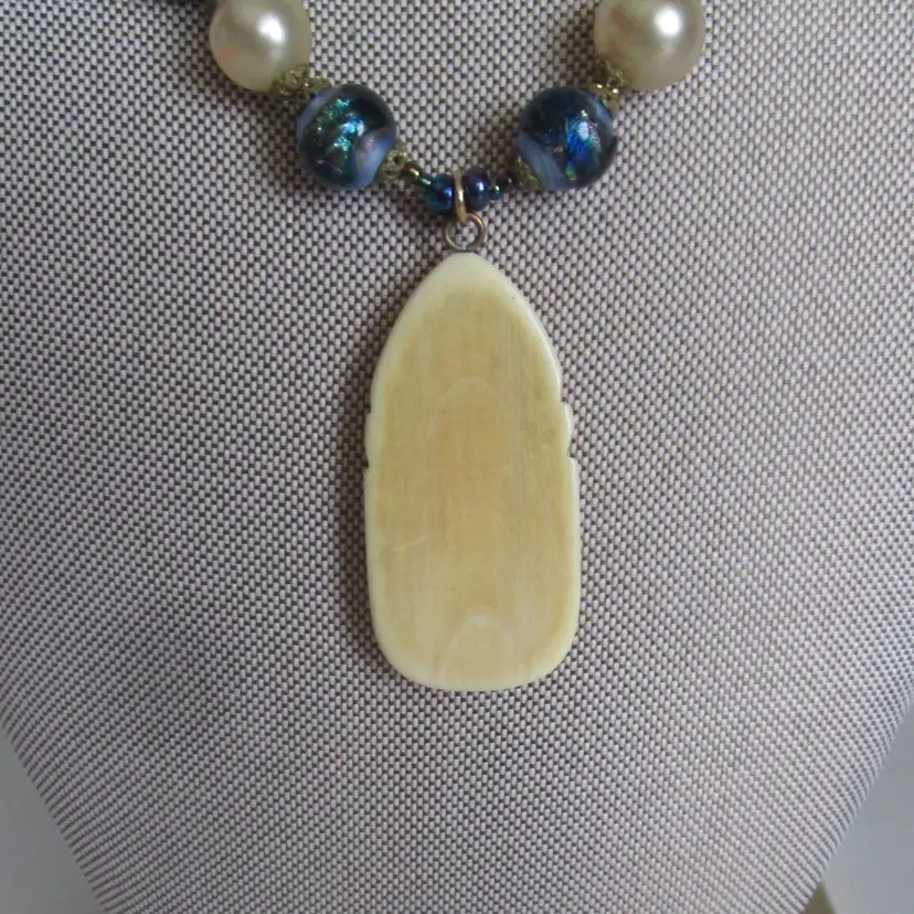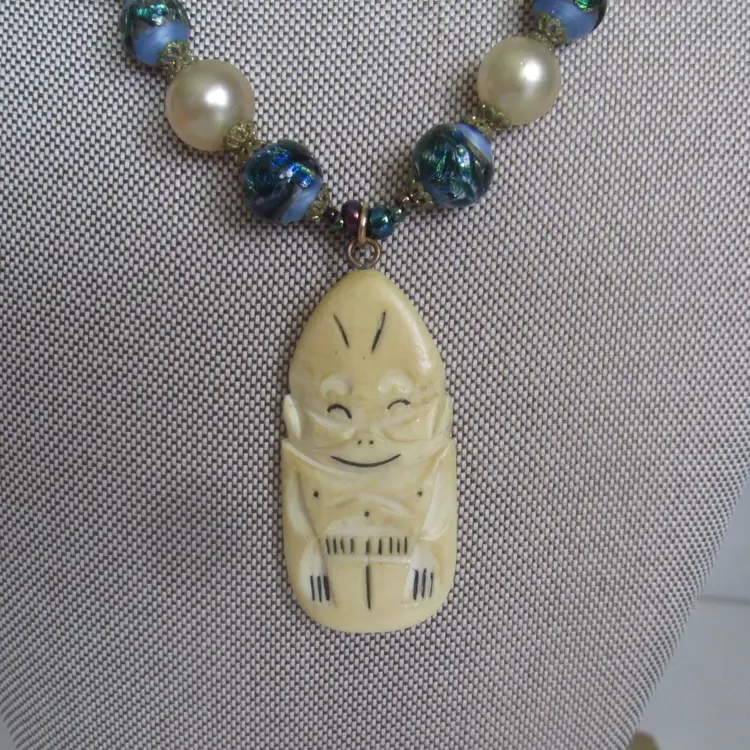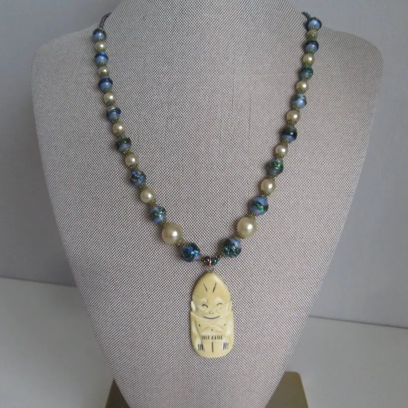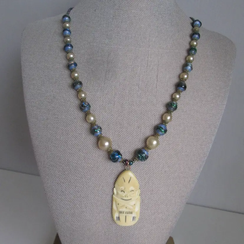 Antique blue and ivory beaded necklace with Billiken pendant. The Biliken is hand carved from bone. It measures 1" x 2". The beads are blue wrapped with green glass and faux ivory glass beads. I did repair this necklace by restringing the beads. I also added a barrel style closure that can be used magnetically or can be turned like a standard barrel. The length of the strand is 20". This was worn for good luck!