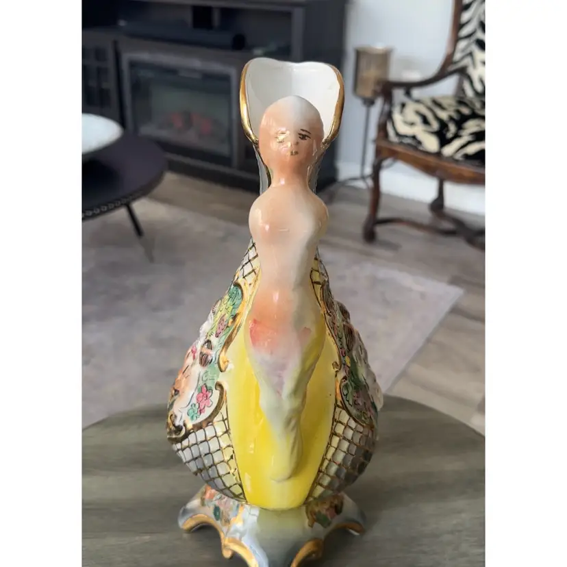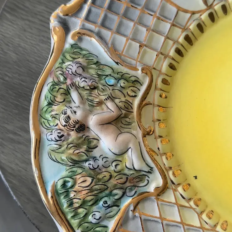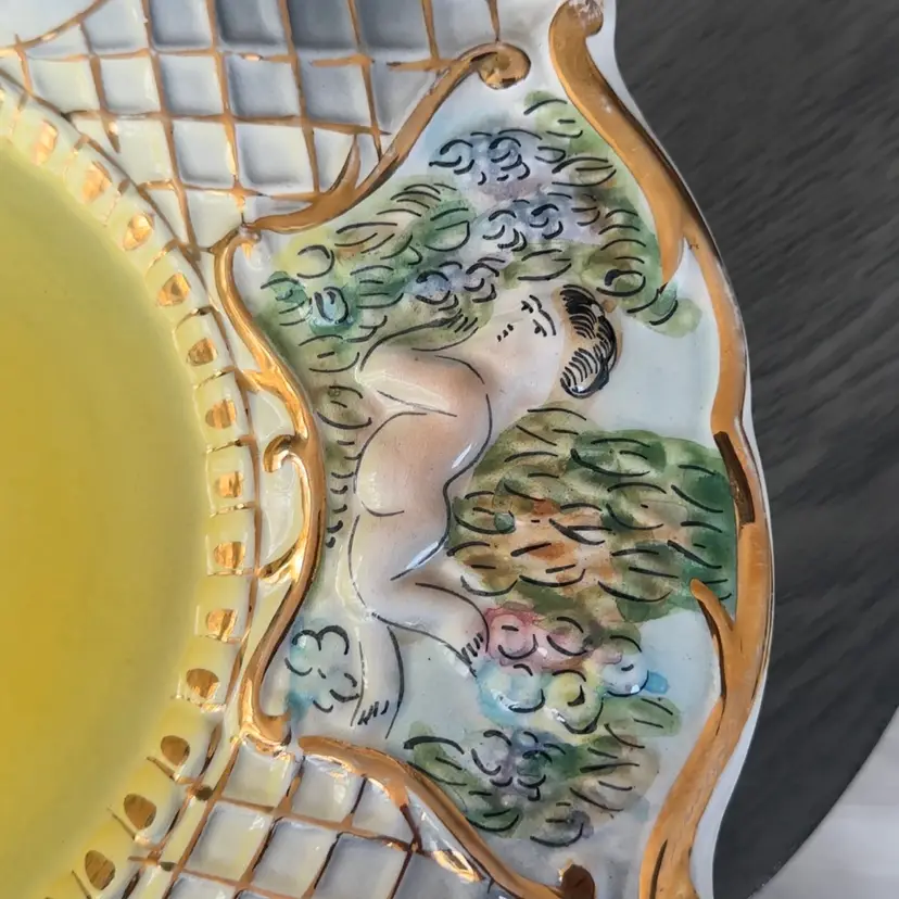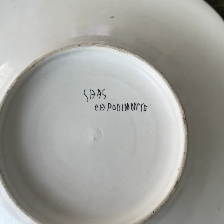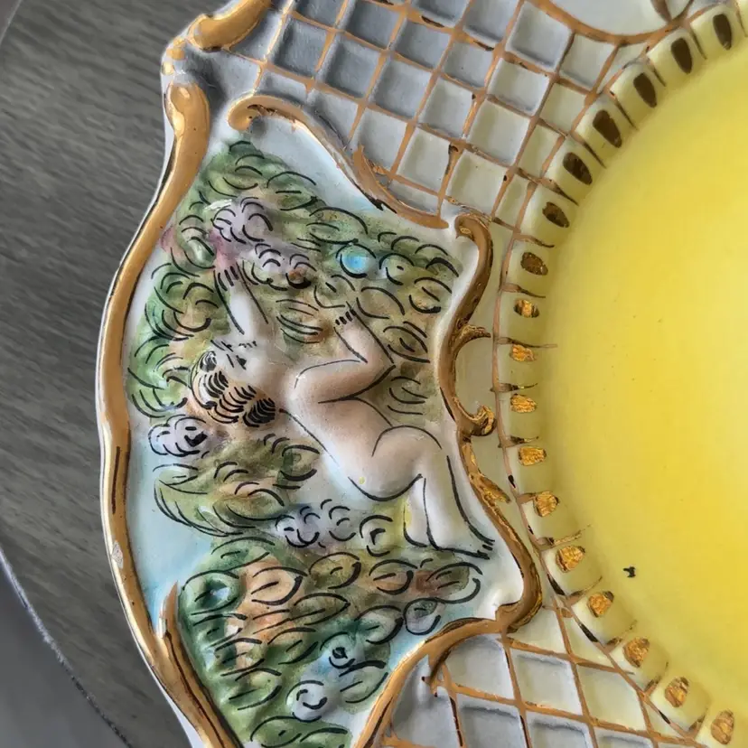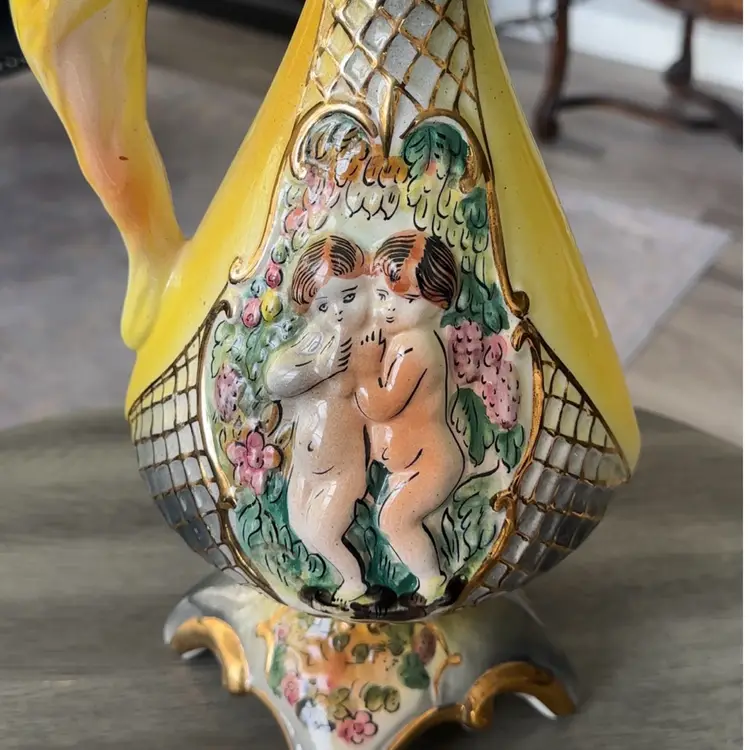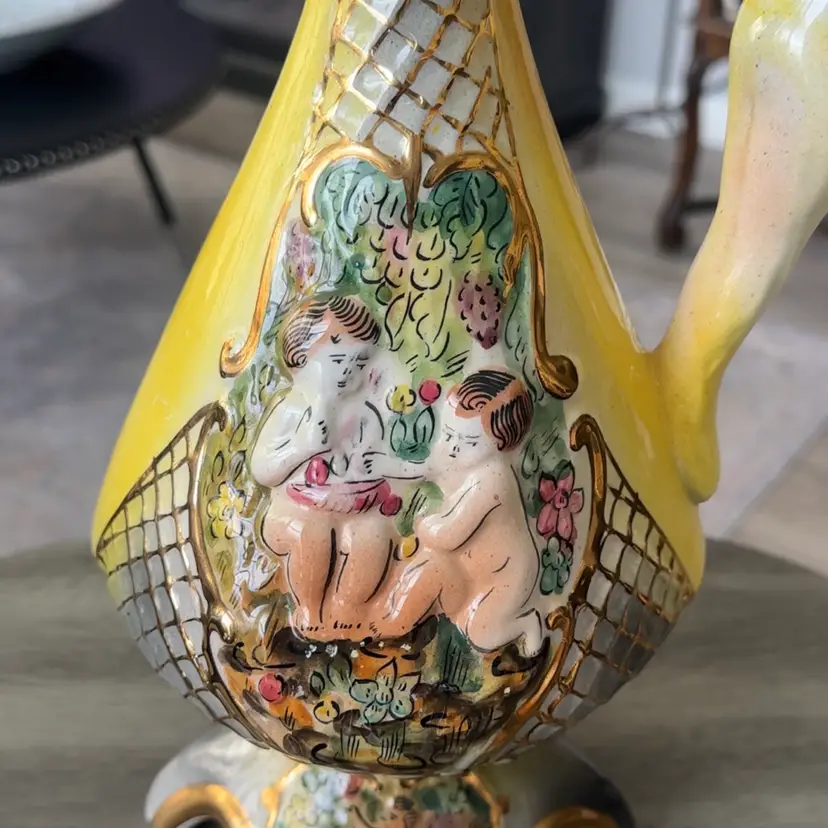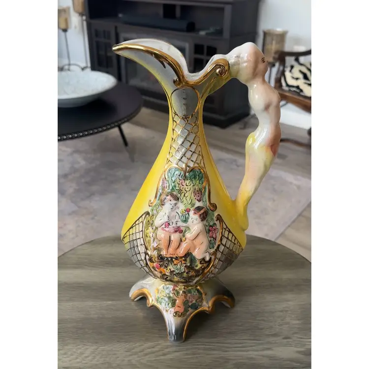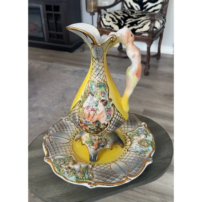 The Antique Capodimonte SAAS Gold Gilt Pitcher with Woman Handle and Under Plate is a stunning piece of vintage porcelain art pottery from Venice. Handmade with multicolor gilding, this original set of 2 includes a pitcher with a unique woman handle and a separate under plate. The intricate details and artistry of this Capodimonte piece make it a beautiful addition to any collection of decorative cookware, dinnerware, or serveware. Pitcher is 13.5” tall, 6.5” wide. Under plate is 13” diameter. Please note there is a hairline crack on the pitcher as seen in photos, as well as some staining on the dish.