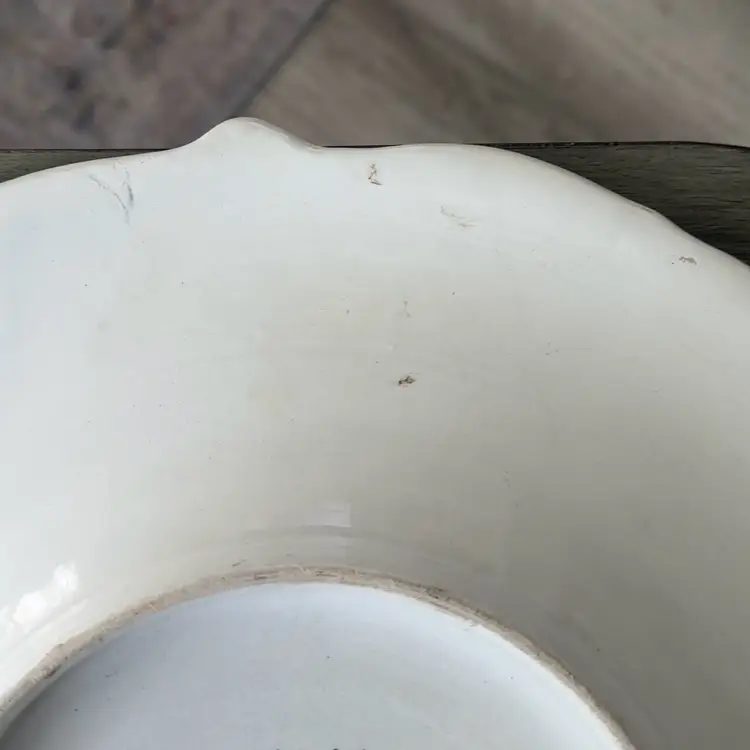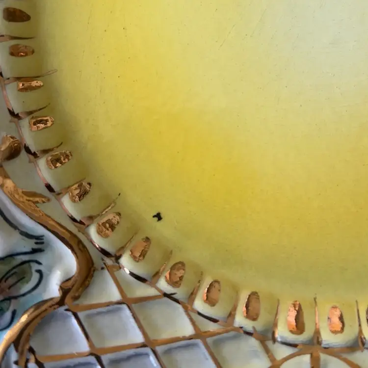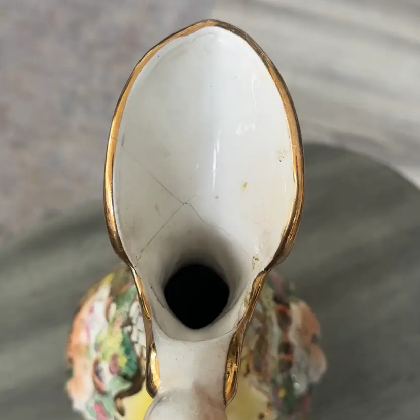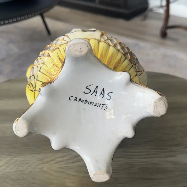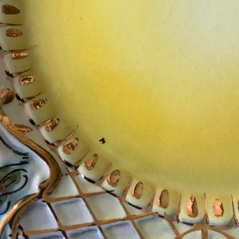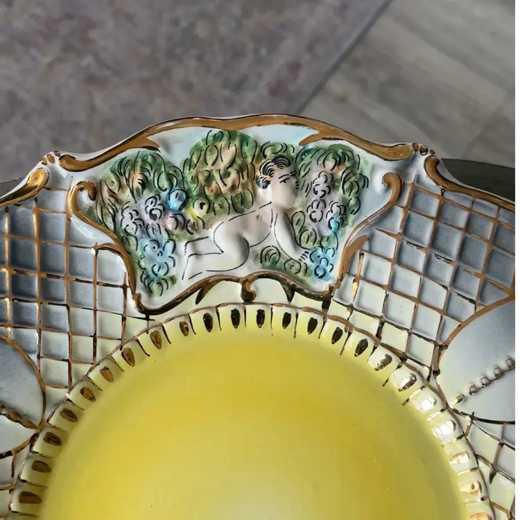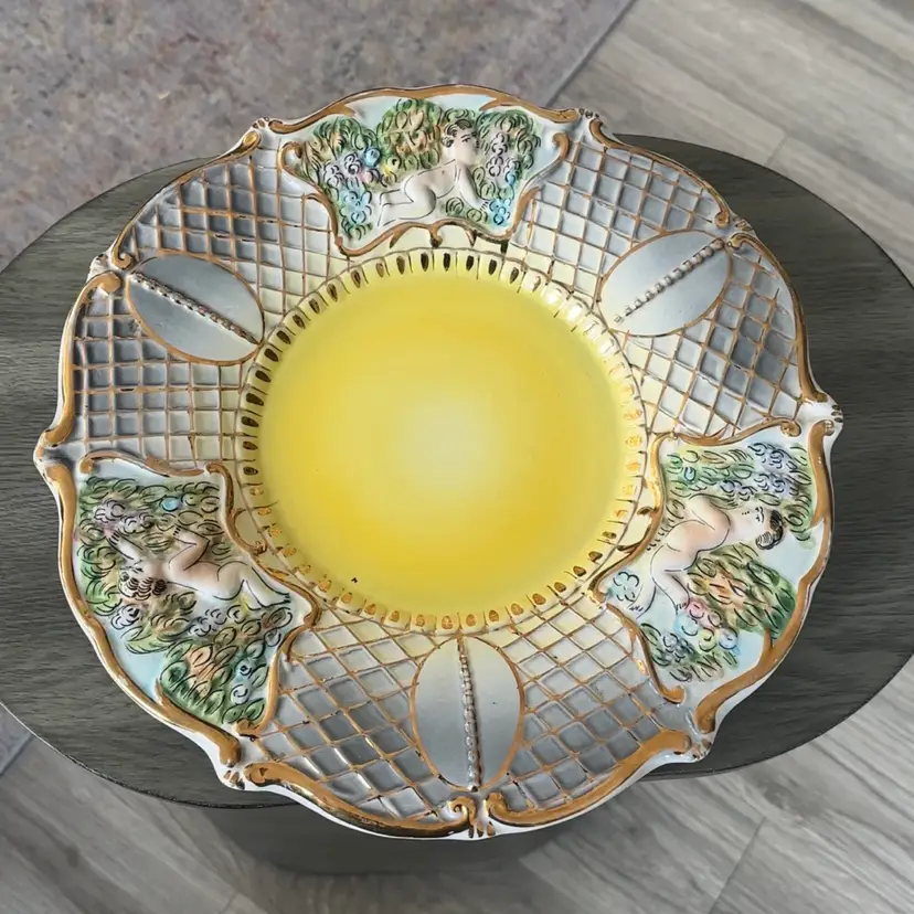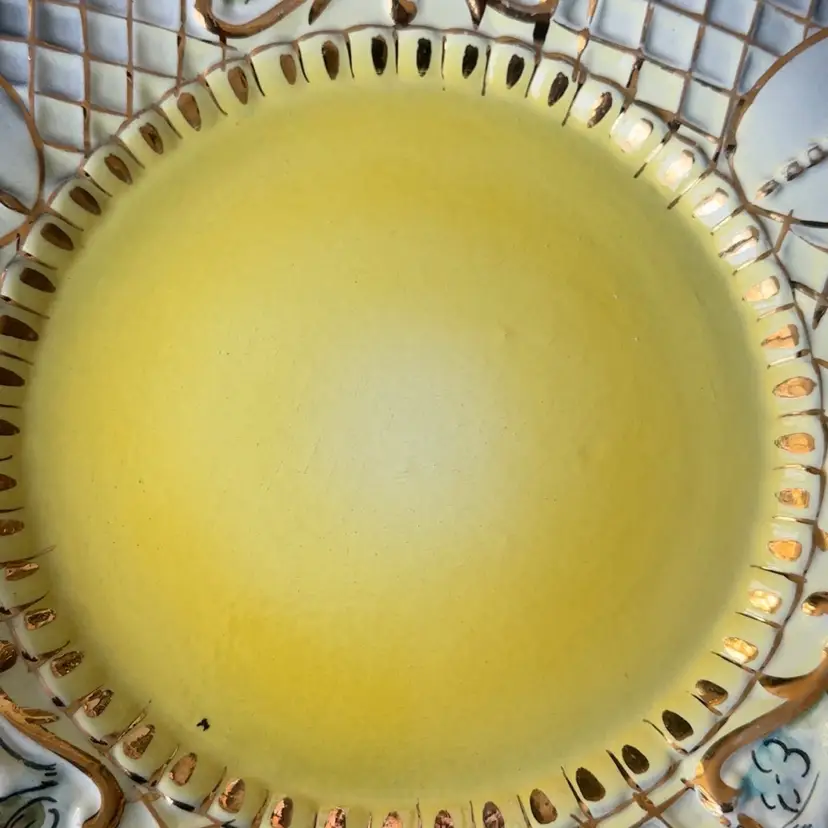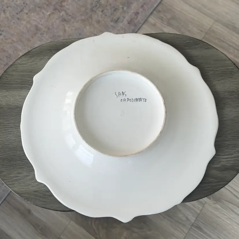 The Antique Capodimonte SAAS Gold Gilt Pitcher with Woman Handle and Under Plate is a stunning piece of vintage porcelain art pottery from Venice. Handmade with multicolor gilding, this original set of 2 includes a pitcher with a unique woman handle and a separate under plate. The intricate details and artistry of this Capodimonte piece make it a beautiful addition to any collection of decorative cookware, dinnerware, or serveware. Pitcher is 13.5” tall, 6.5” wide. Under plate is 13” diameter. Please note there is a hairline crack on the pitcher as seen in photos, as well as some staining on the dish.