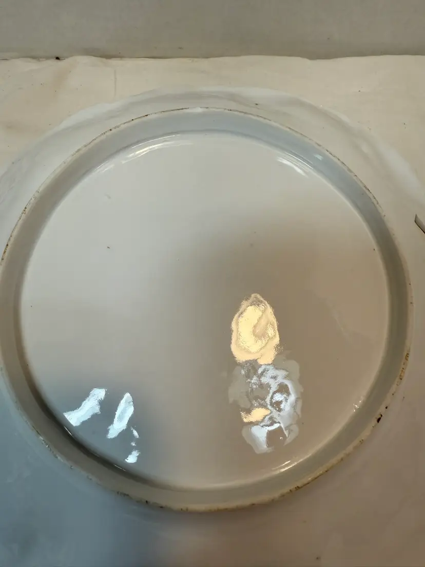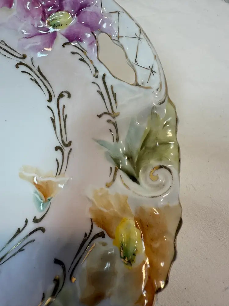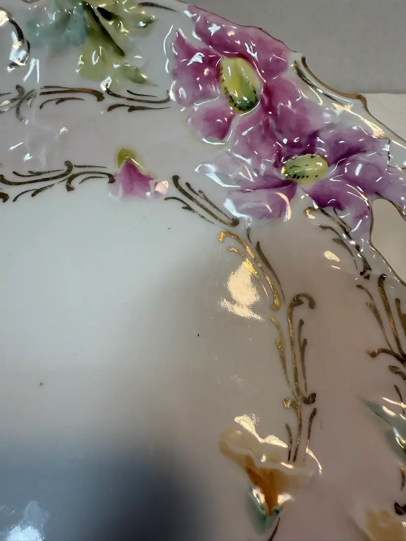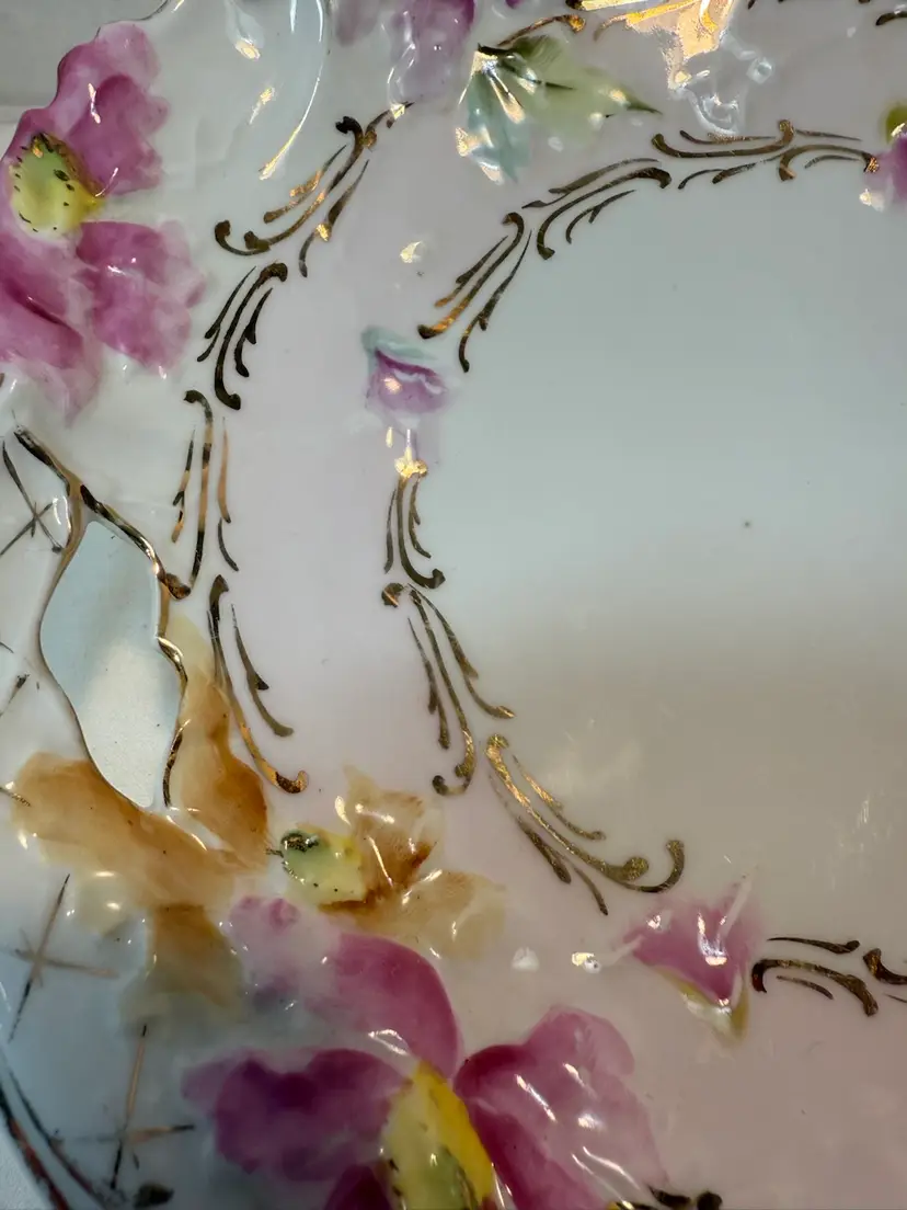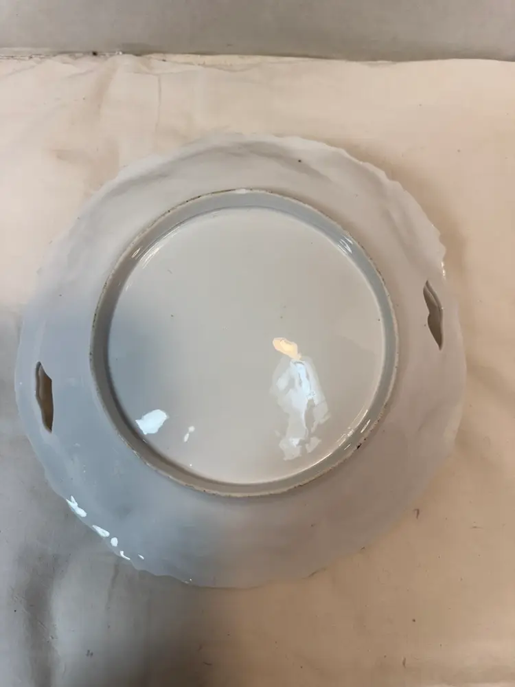 In beautiful condition no chips or cracks, no markings on back but guessing Germany maker. Has gold trim and highlights, some wear on paint. Scalloped edging, has a luster finish. Bowl measurements are 9 1/2” wide 1 1/2” tall, 1” deep.