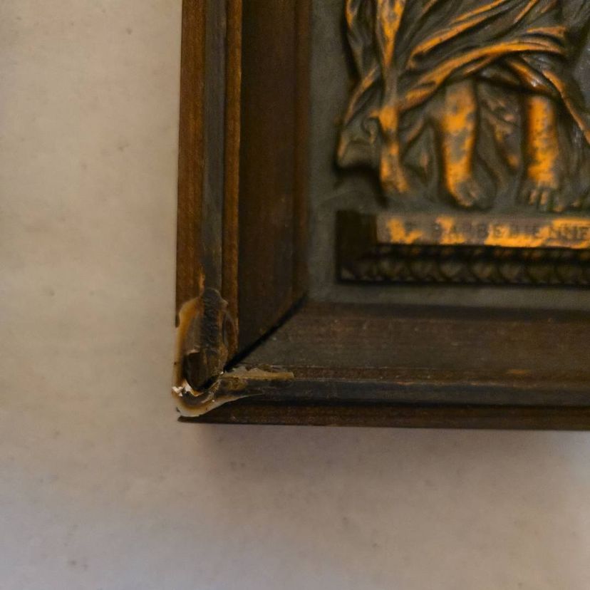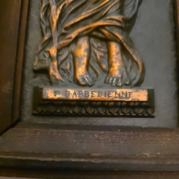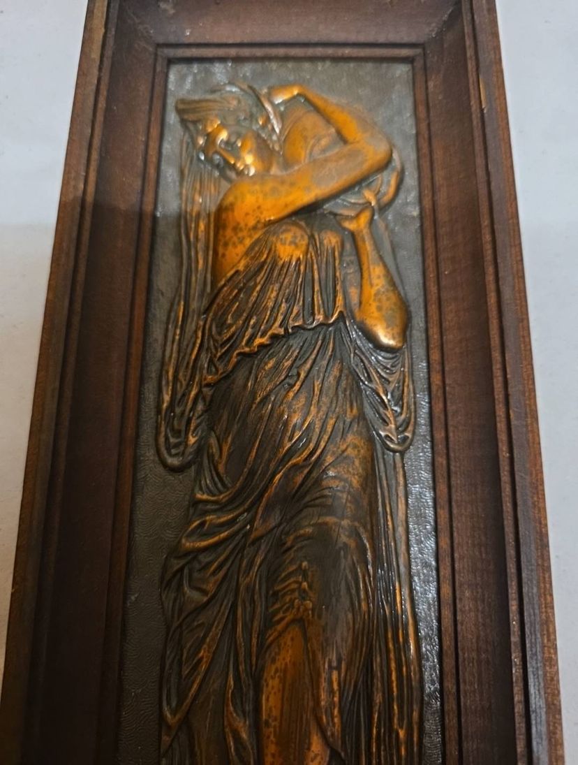 The Antique F. Barbedienne Pair of French Bronze Resin Plaques featuring Greek Maidens framed in an Art Deco style is a handmade licensed reprint from France. The relief prints are portrait-oriented and signed by F. Barbedienne, measuring 12.5 inches in height and 4.5 inches in width. Made from bronze resin using a cast production technique, these unique plaques showcase elegant women as the subject, adding a touch of sophistication to any space.