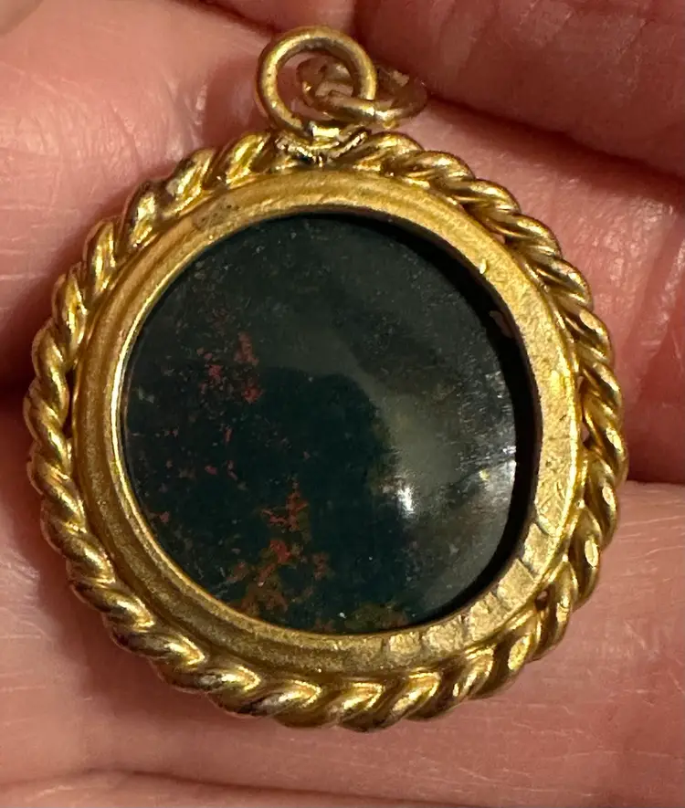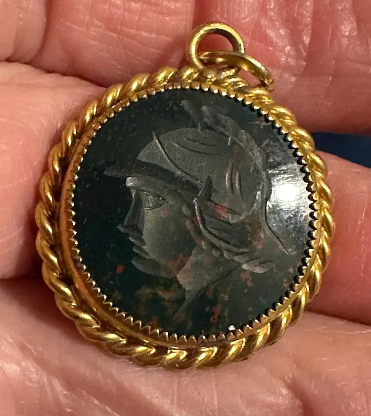Antique fob is bloodstone set in gold filled setting. It has a hand carved intaglio of warrior profile. It is 1”. Very good condition.