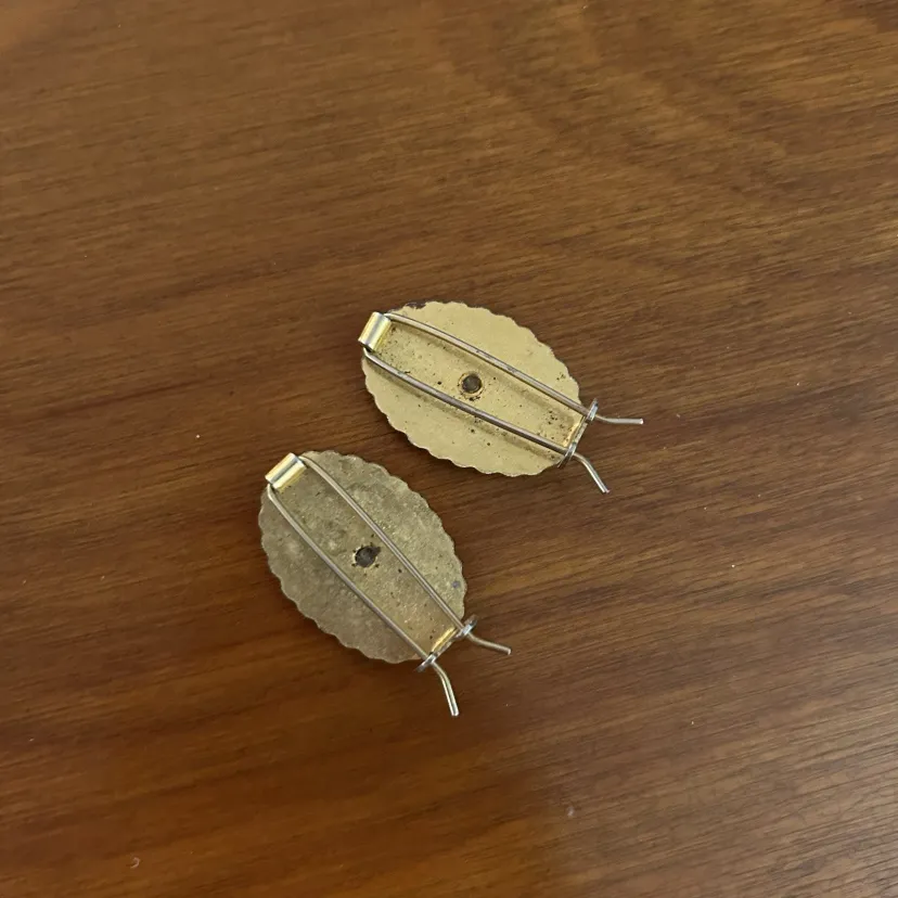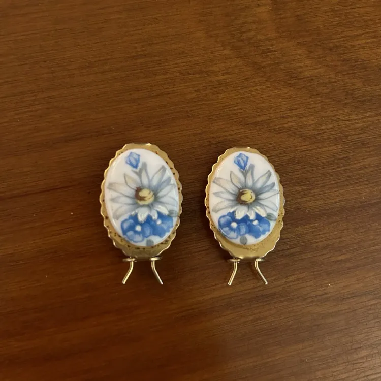 Antique Gold Tone Porcelain Blue Floral Hair Barrettes Clips Vintage