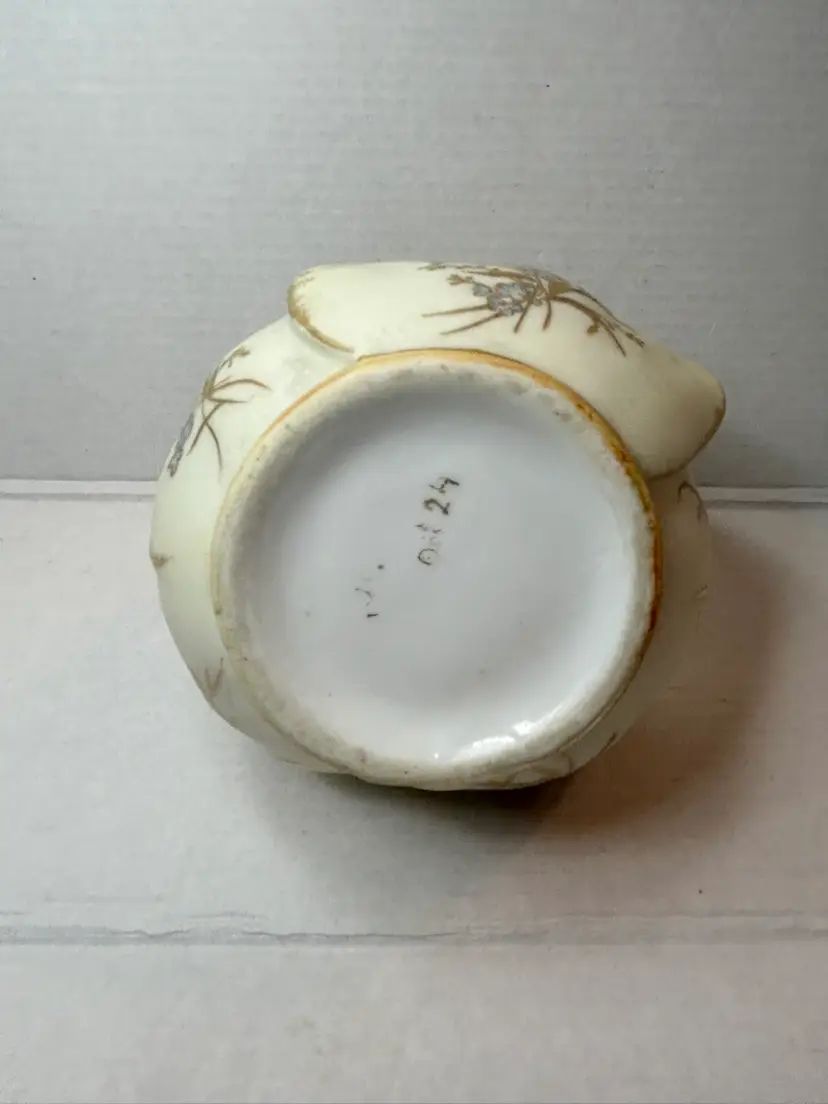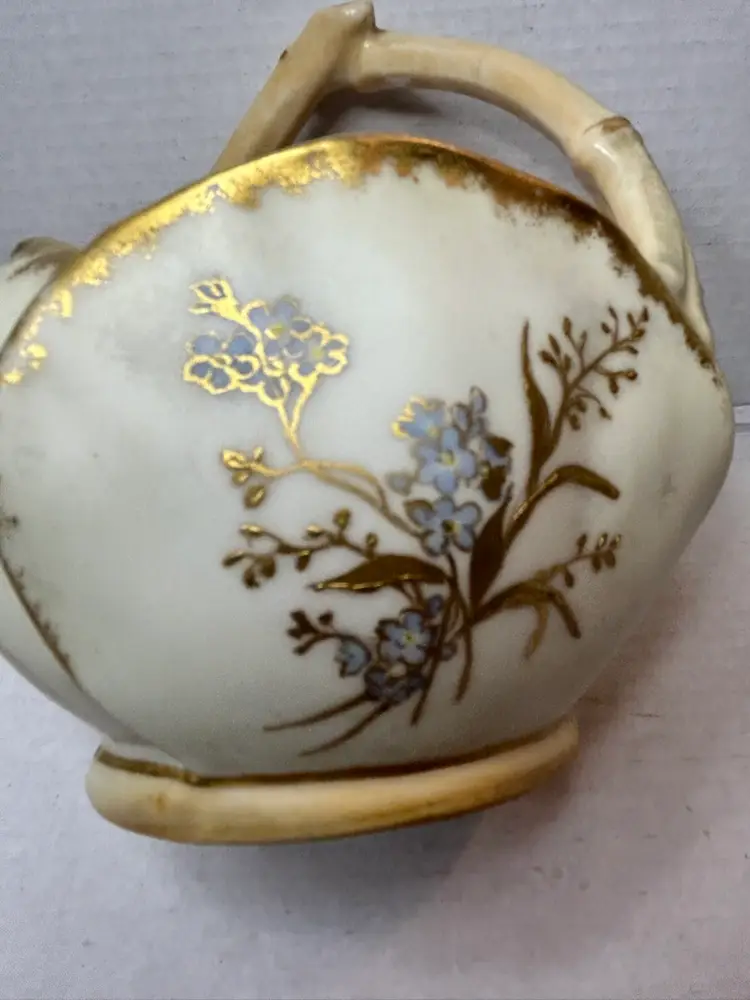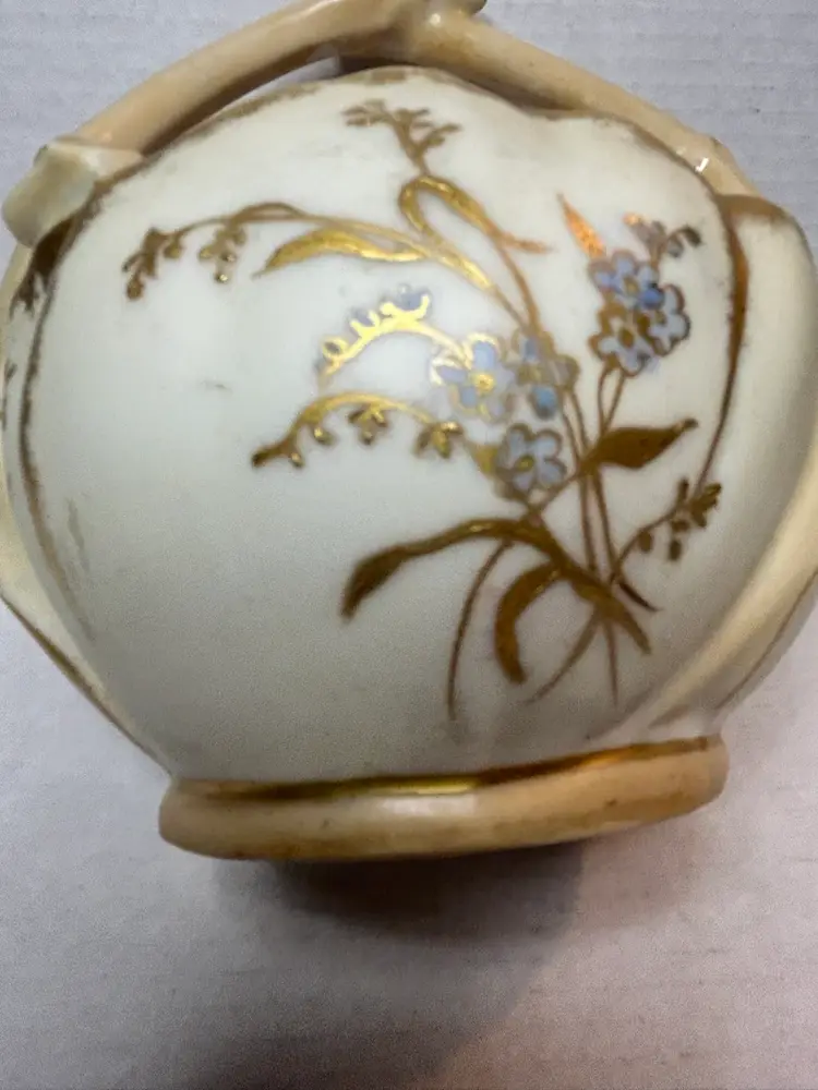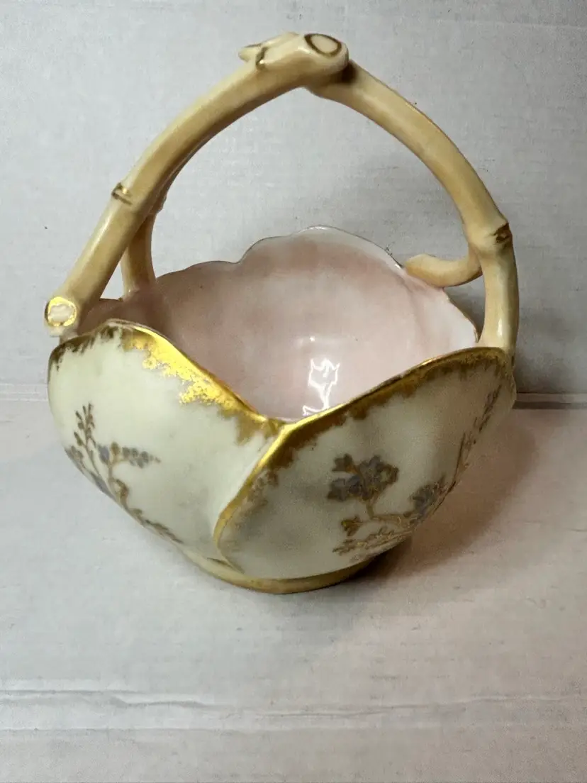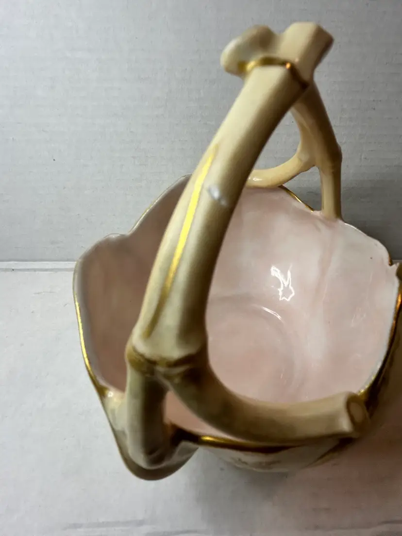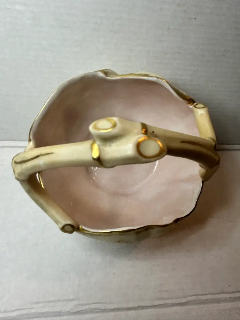Small beige porcelain basket with a pink interior. Light blue and gold flowers. Handles look like bamboo and it has cold trim all around. There is a small chip on one of the handles as shown in the last picture
