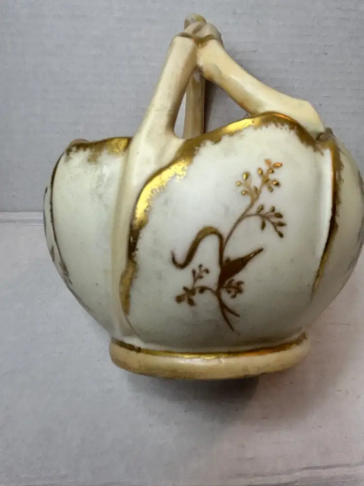Antique Hand Painted Bamboo Handle Bisque Porcelain Basket