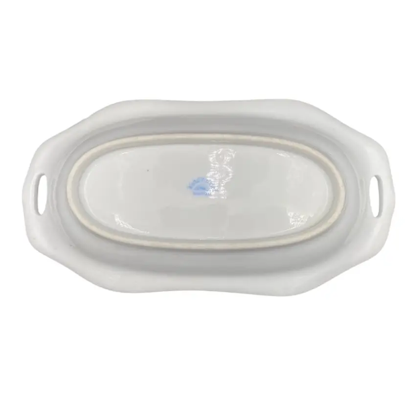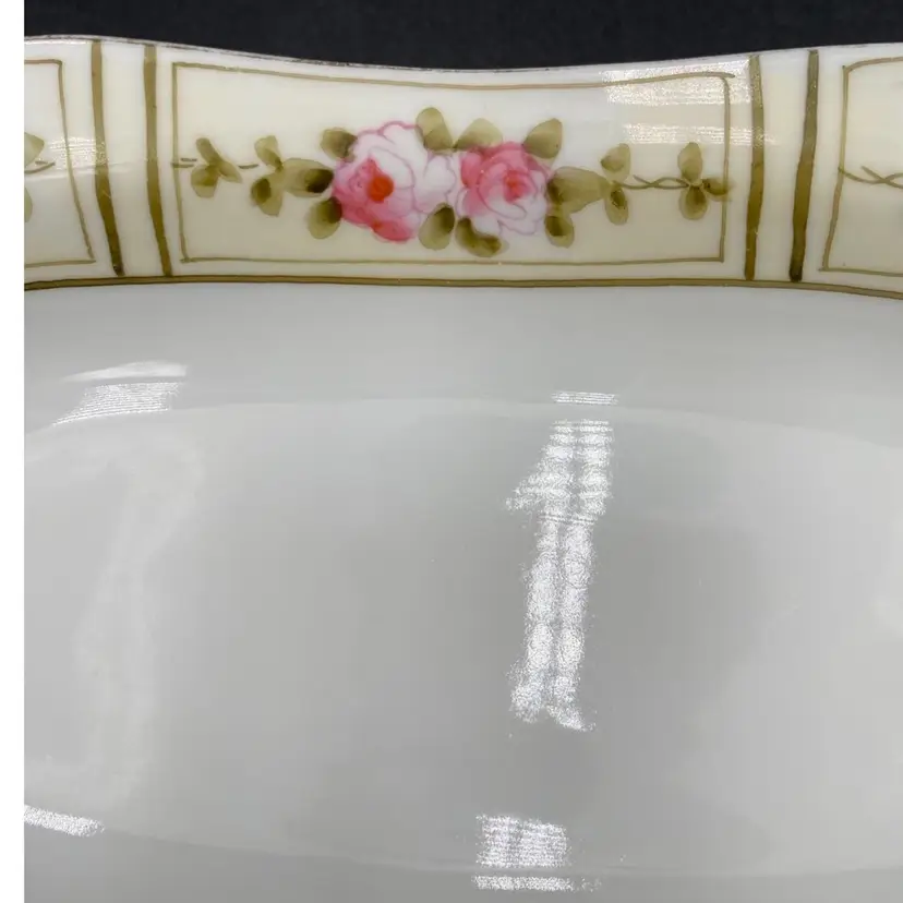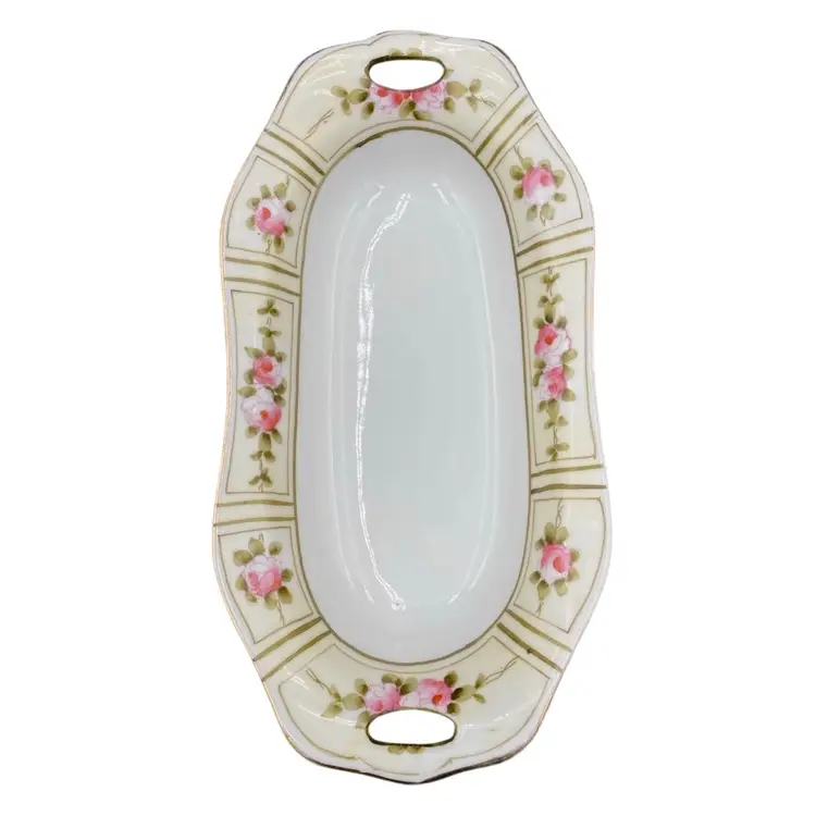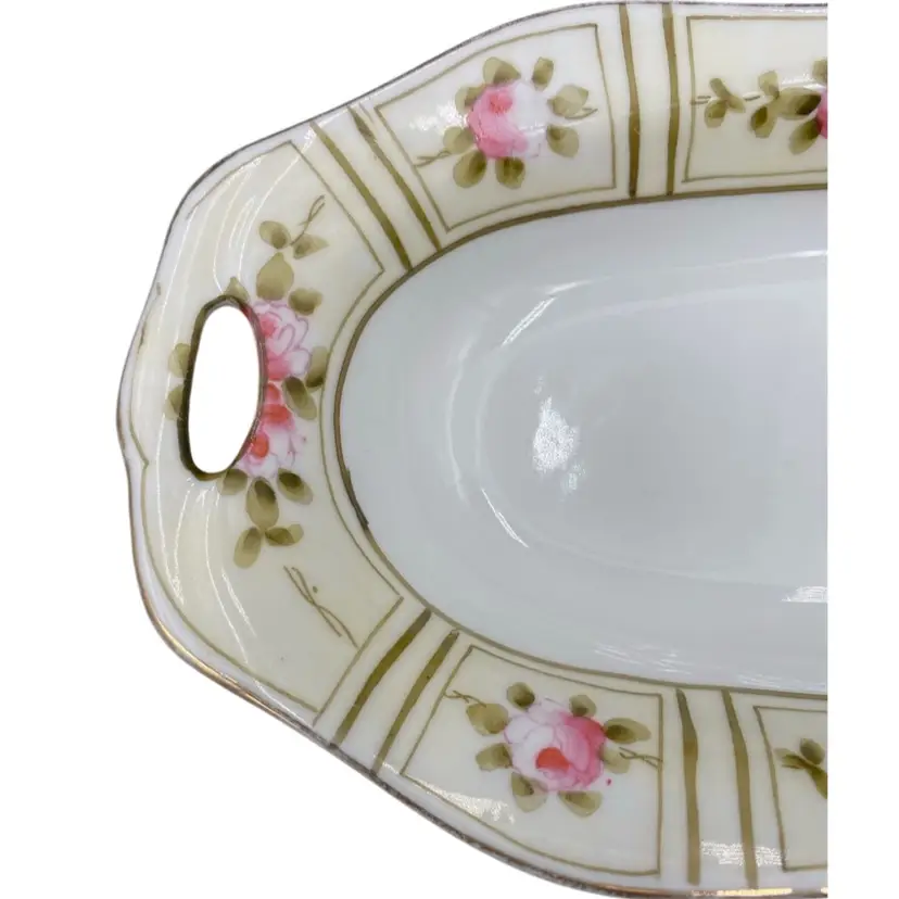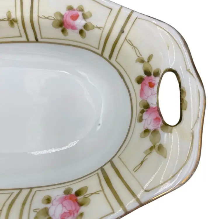 This beautiful Nippon dish is a lovely antique, with hand-painted pink peonies and reticulated handles. The pattern features rich pink peonies on a cream-colored background, framed by green foliage and outlines. There is gold edging around the rim of the dish. Made of high-quality porcelain, this dish measures 7.8 inches in length, 3.9 inches in width, and 1.1 inches in height, weighing only 6 ounces. It is perfect for decorative purposes, for serving small treats, or using as a trinket dish. This original piece from Japan during the time period of 1900-1919 and has a painted original backstamp demonstrating its authenticity.
