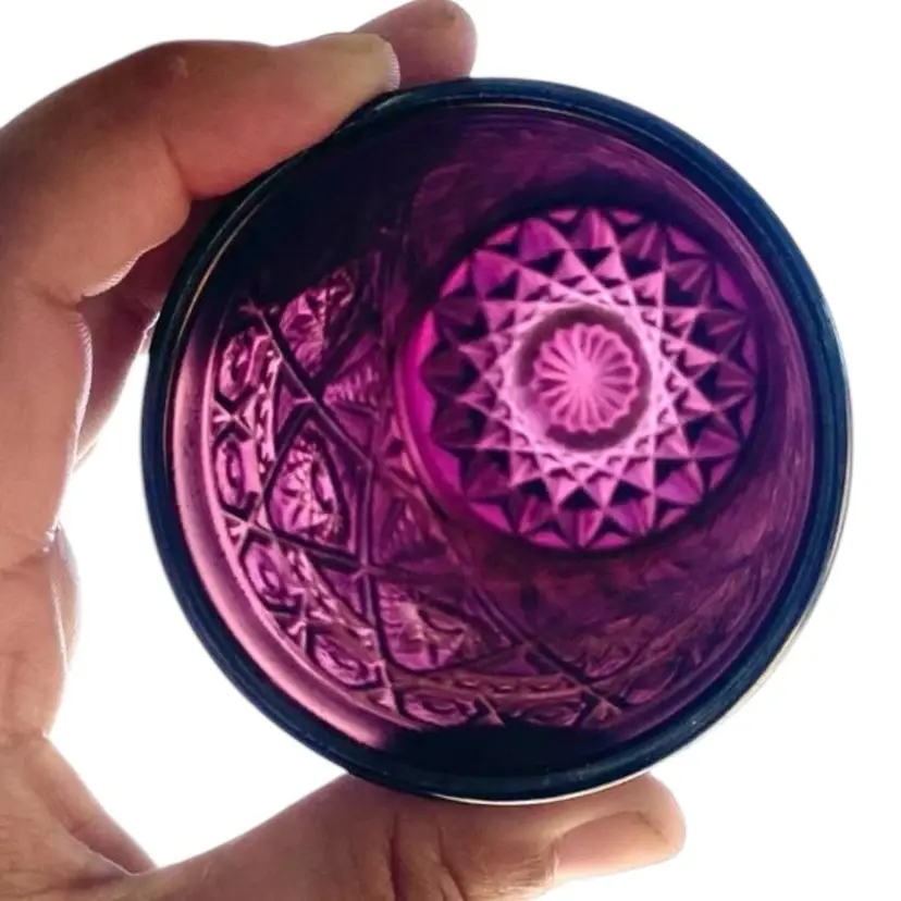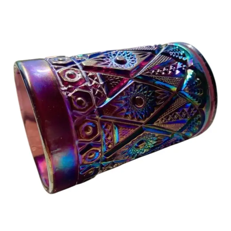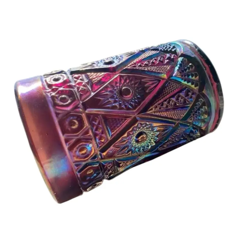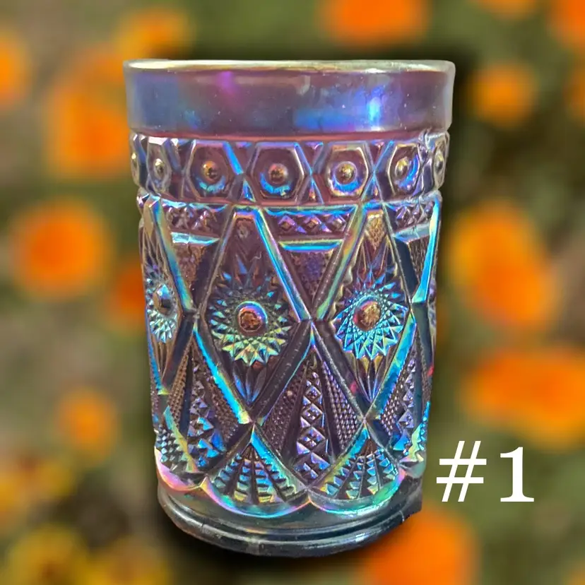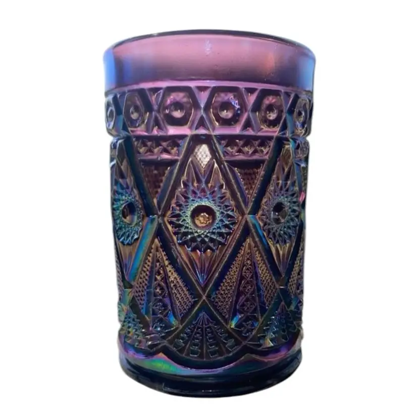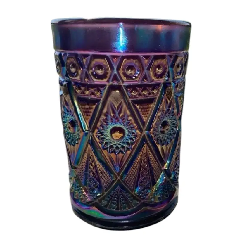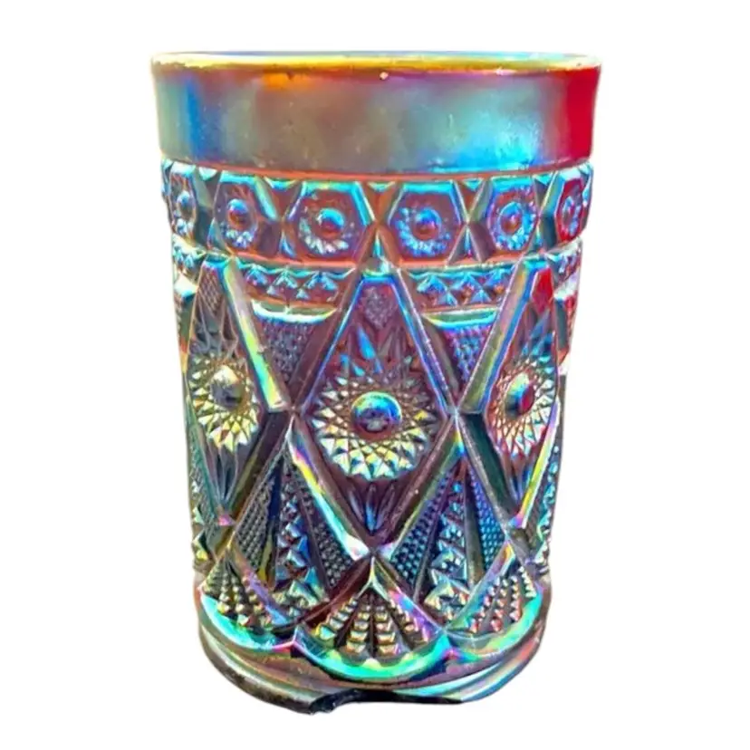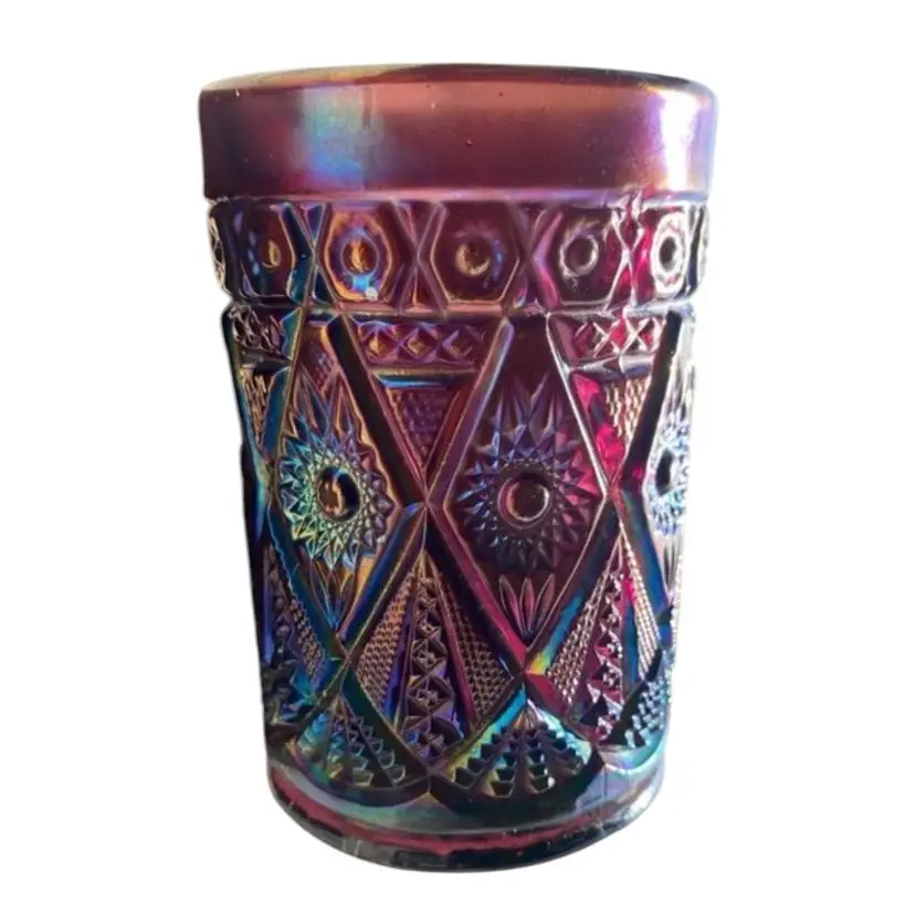 •Antique Imperial Glass tumbler, produced early 1900s in Diamond Lace pattern •amethyst carnival in color and this is one of the most fiery, metallic and rich amethyst carnivals I have ever seen •stands just over 4” tall •4 available: -1 & 2: excellent antique condition with no chips, cracks, flea bites etc. -3: has a flaked chip from mouth of glass (discounted!) -4: has large piece chipped off from bottom (discounted!)