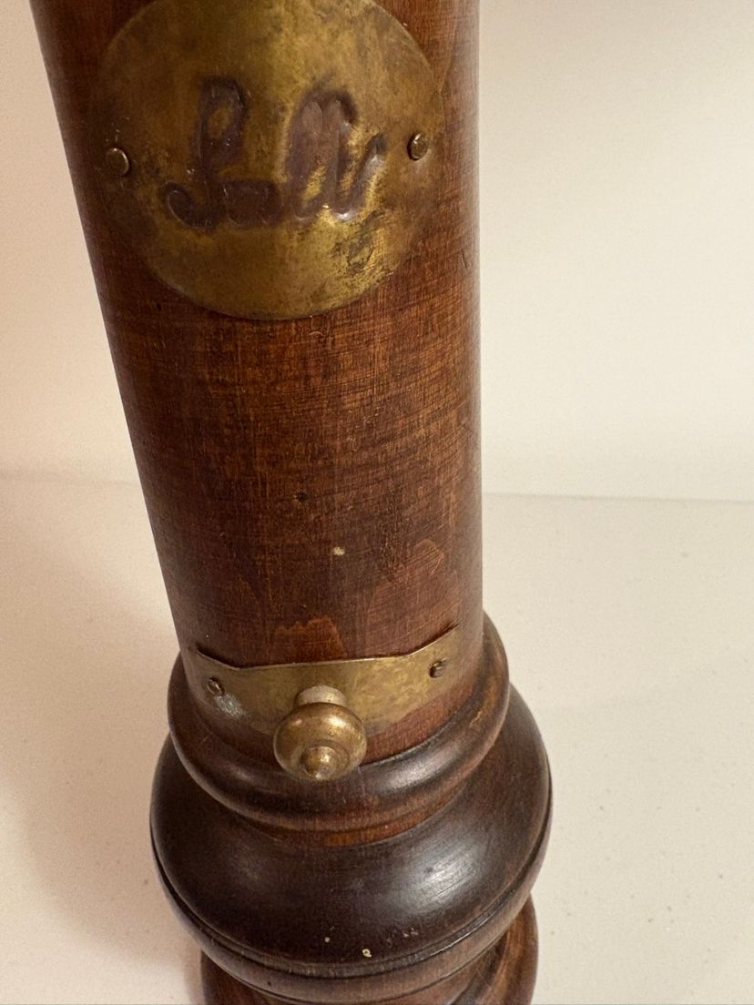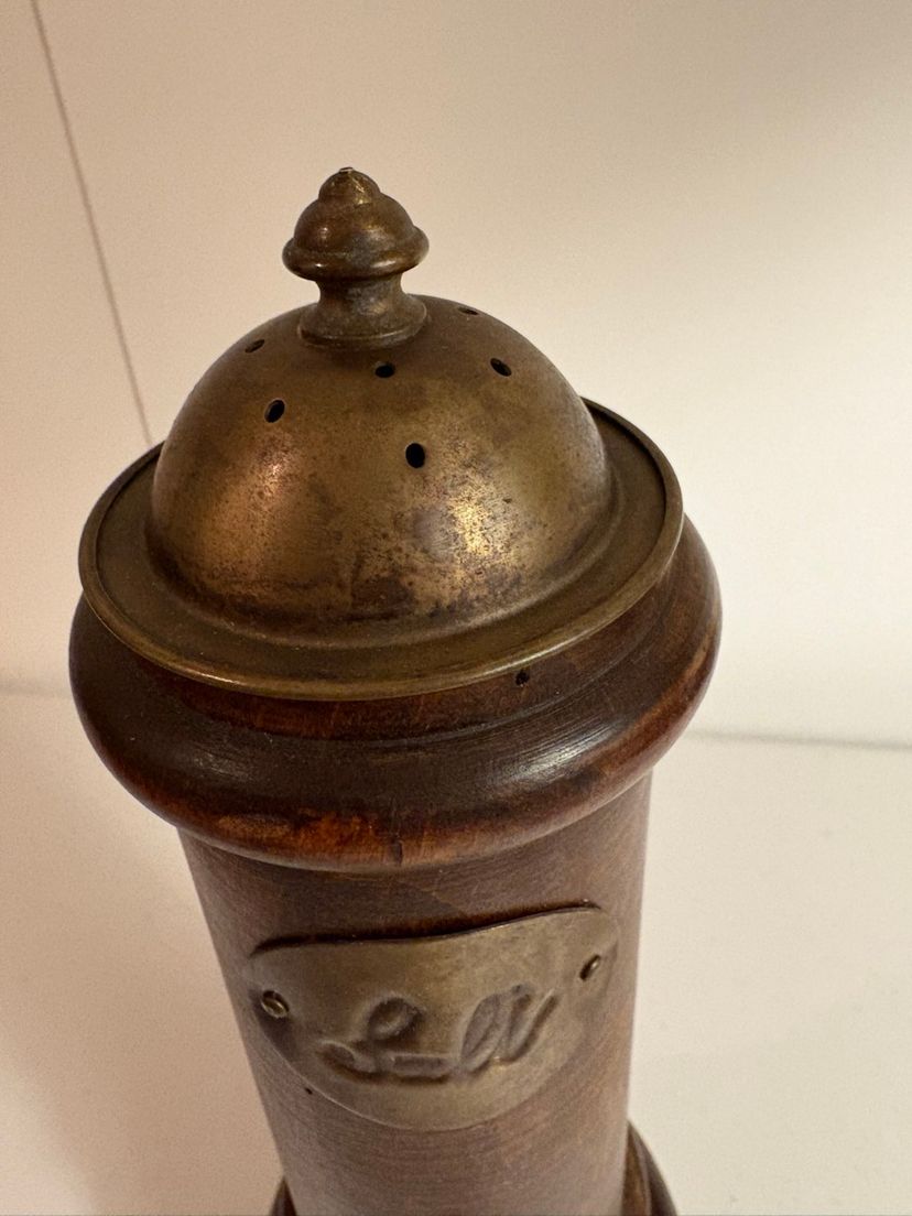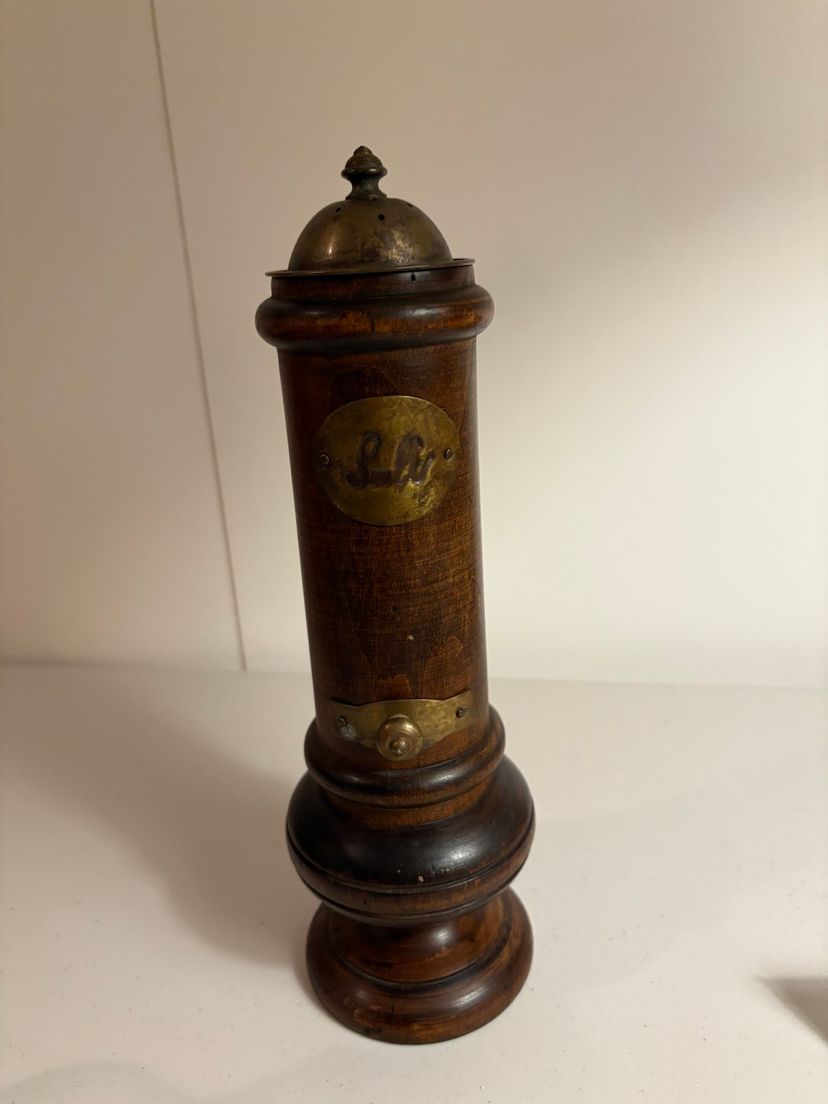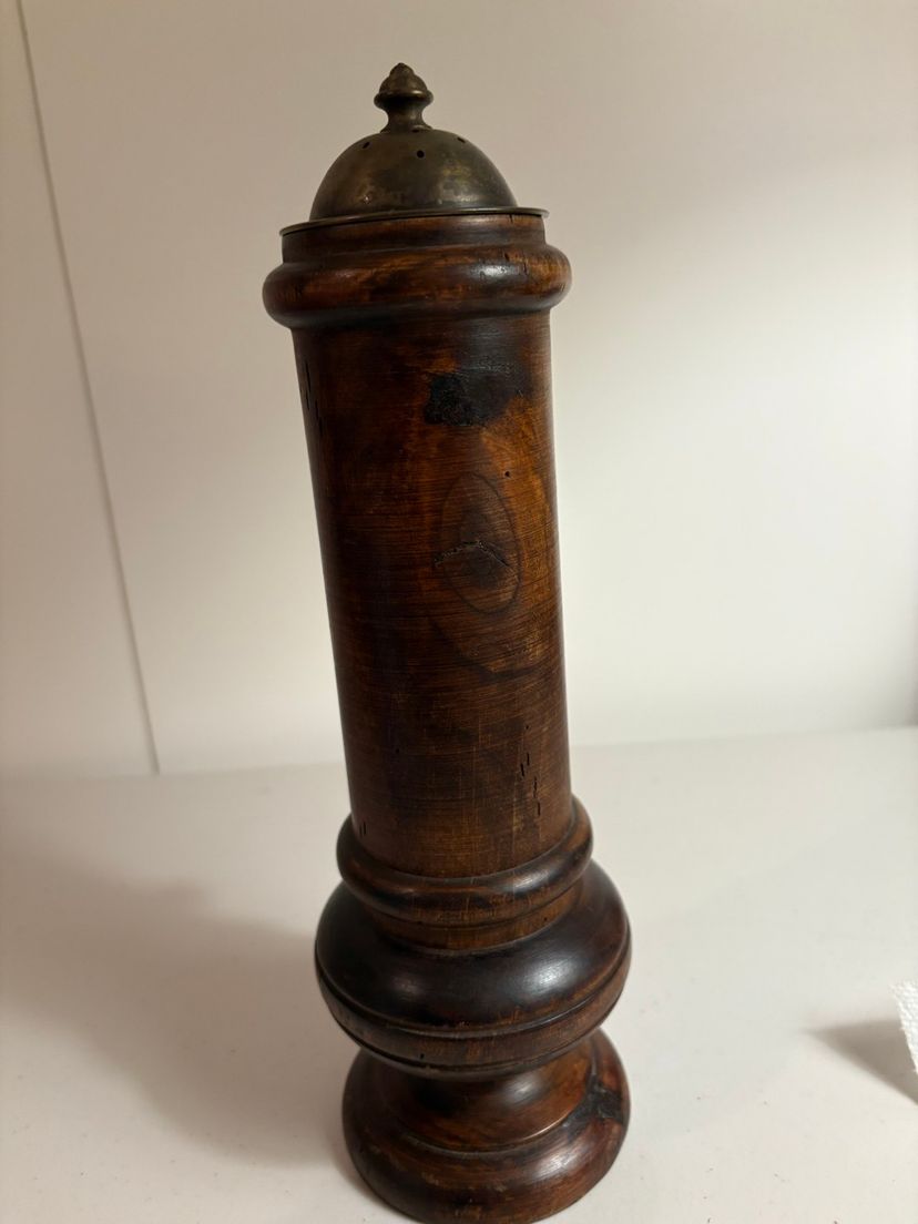 This is such a unique wood shaker. It has brass accents and is 12” tall.