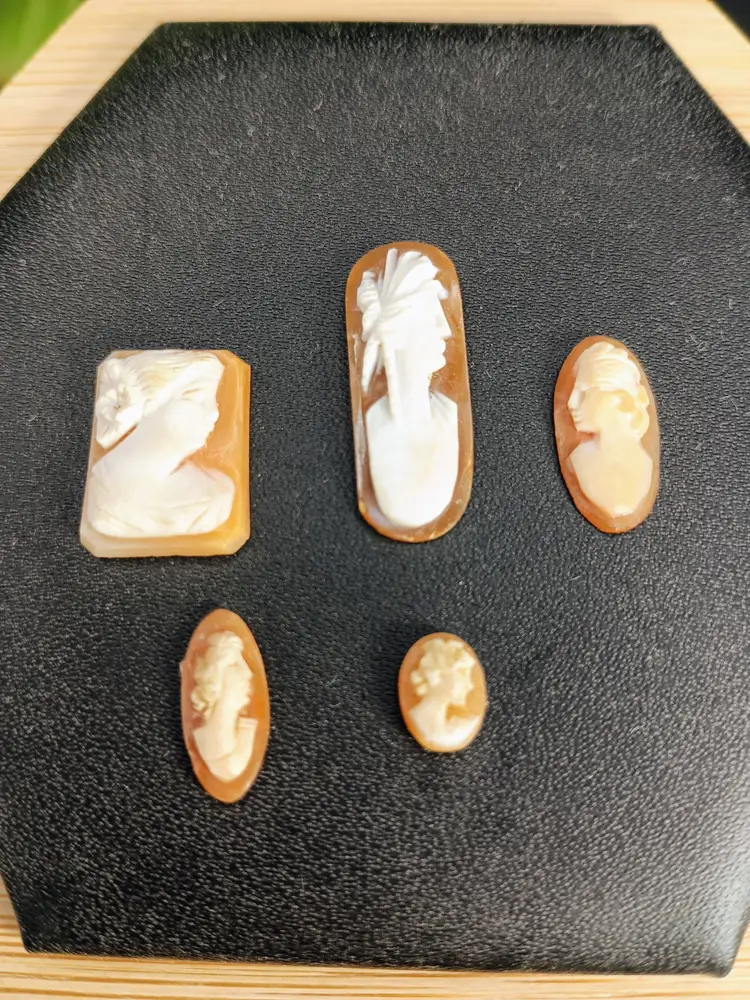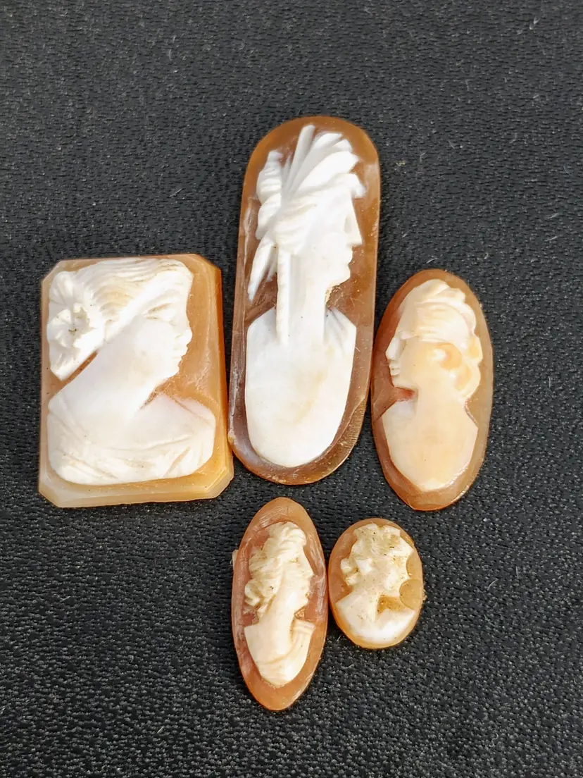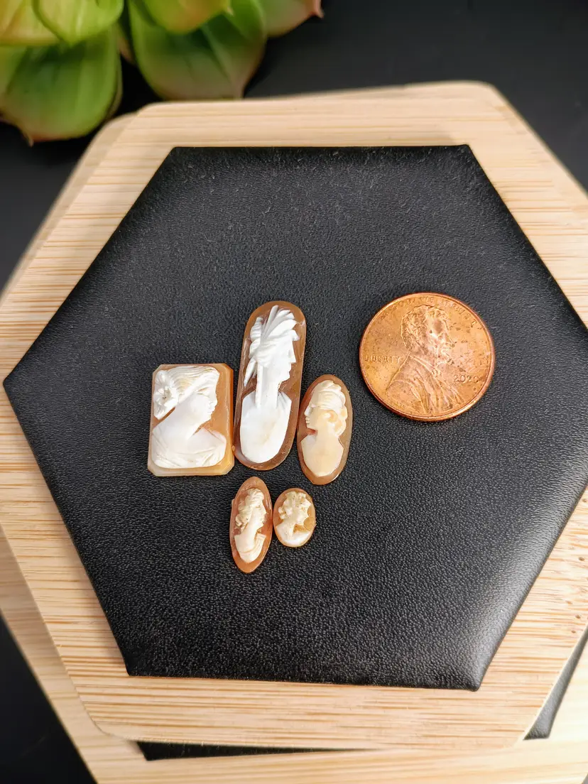 In this lot you will receive five antique cameos. This is a rare lot. They are all made of carved shell. They range in size from 6mm to 25mm. They can be used for any craft, jewelry, or mixed media projects. Or just admired in a display case. These date from the 1890s.