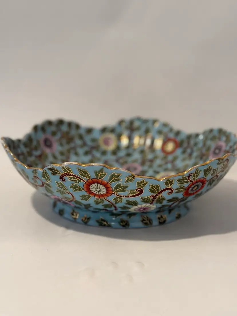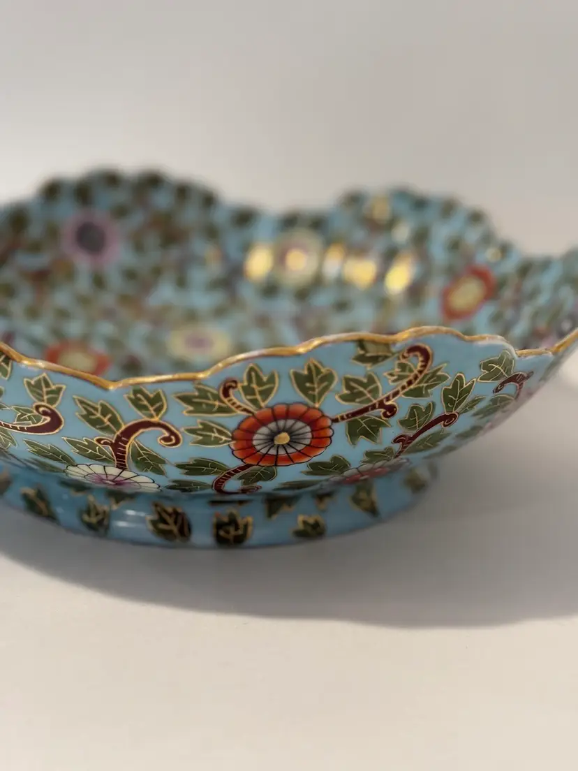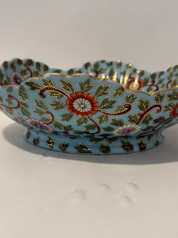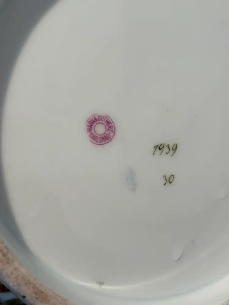 This is an antique decorative bowl by Marx & Gutherz from Austria, manufactured in 1939. The bowl features an Asian style blue floral pattern, hand-painted on blue bone china in a round shape. It is a vintage piece with a printed backstamp, showcasing craftsmanship from the 1930s in Austria.