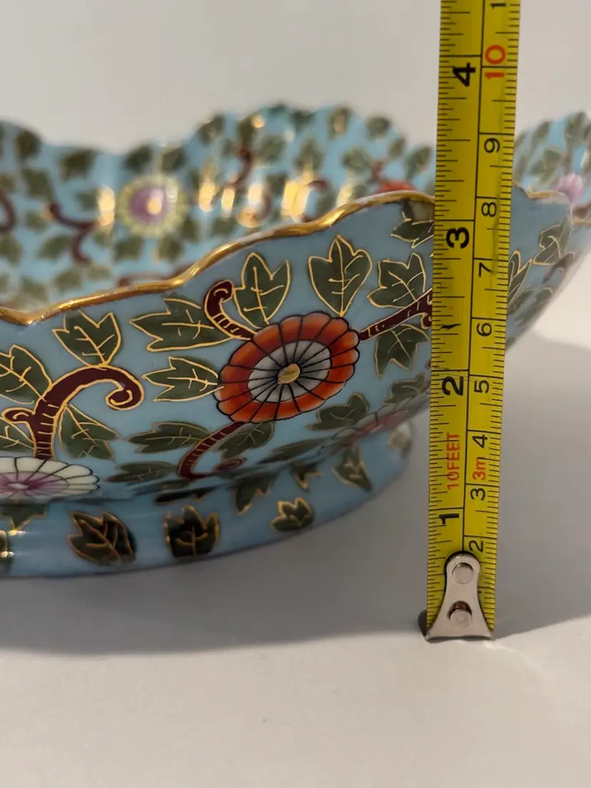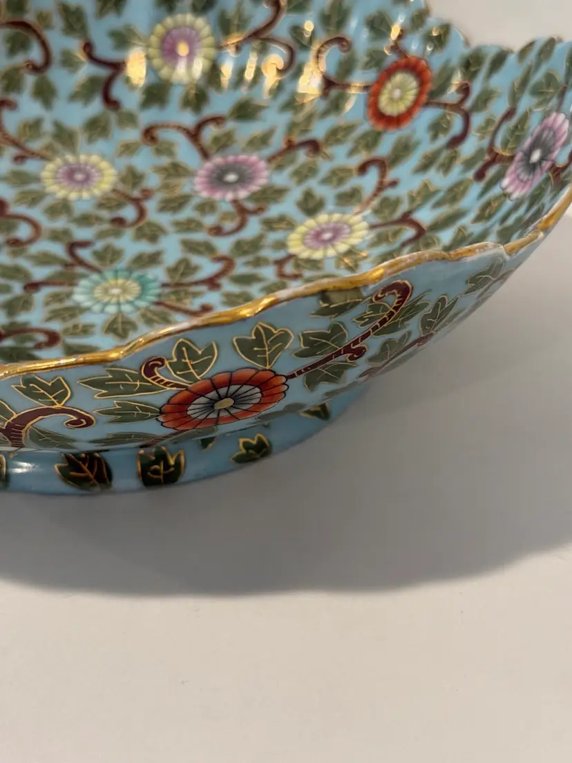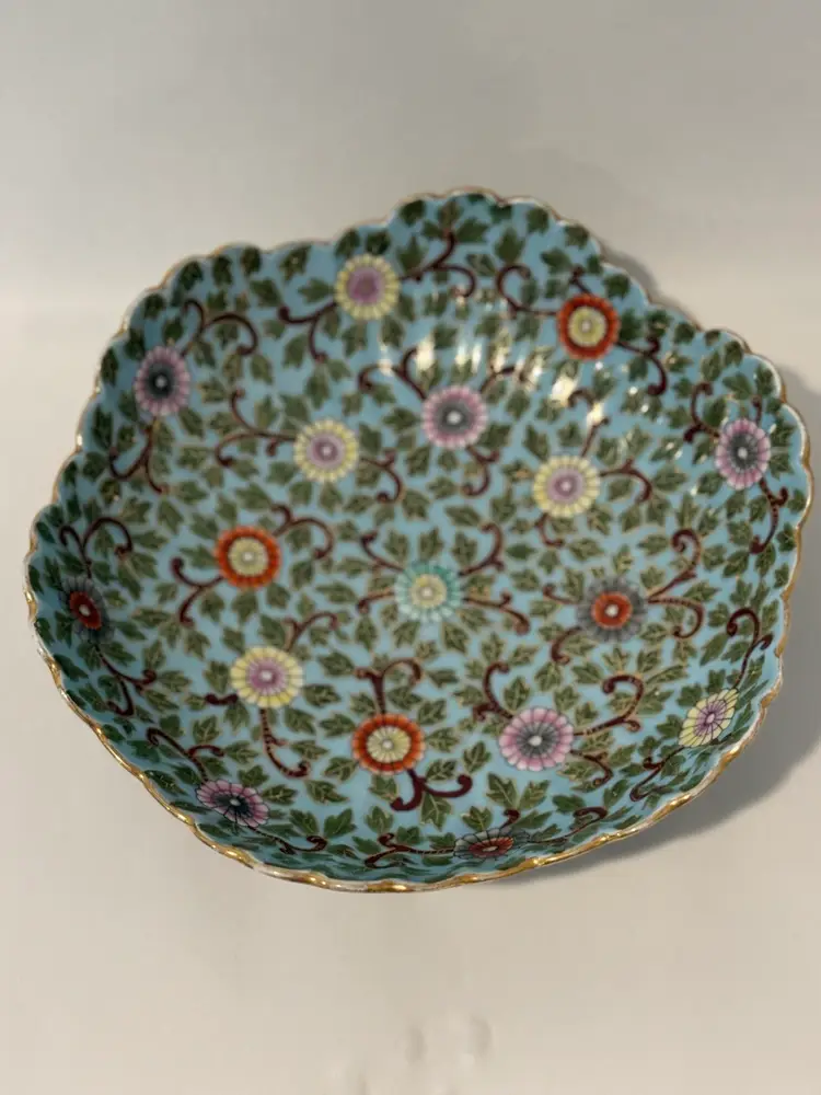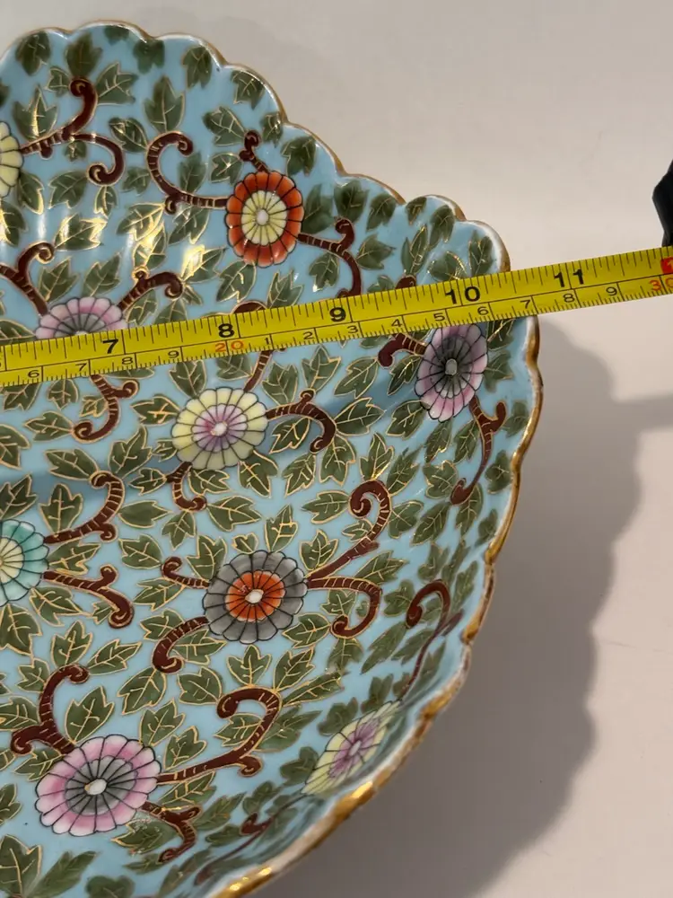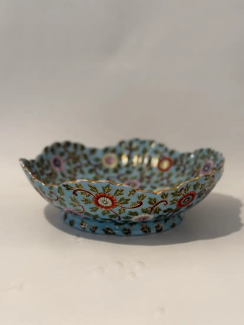 This is an antique decorative bowl by Marx & Gutherz from Austria, manufactured in 1939. The bowl features an Asian style blue floral pattern, hand-painted on blue bone china in a round shape. It is a vintage piece with a printed backstamp, showcasing craftsmanship from the 1930s in Austria.