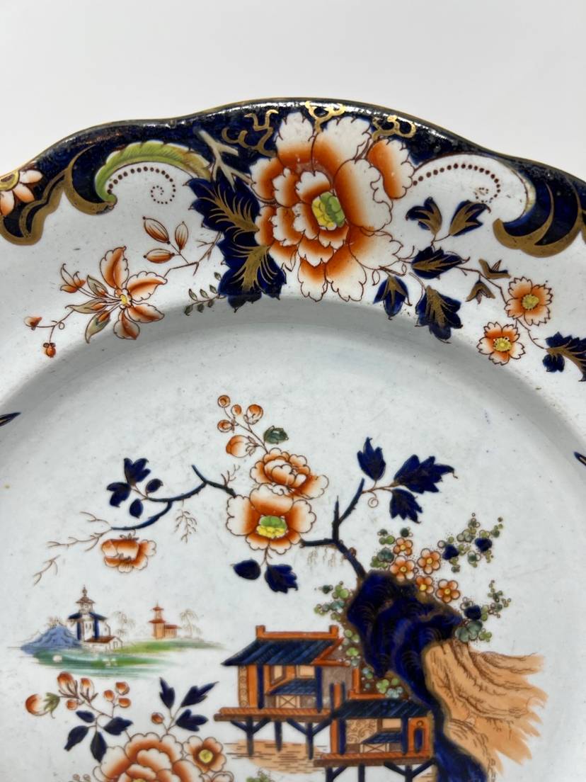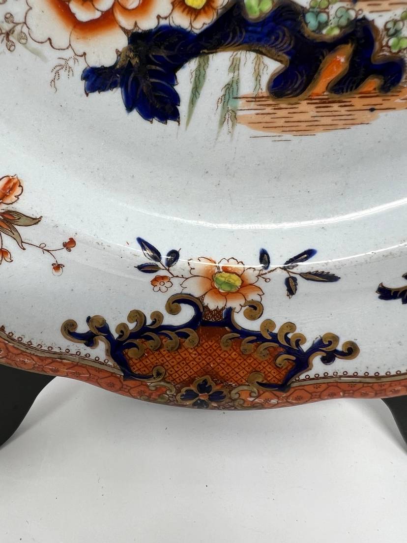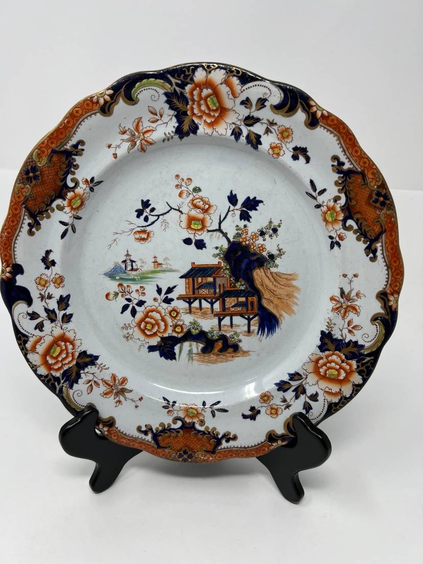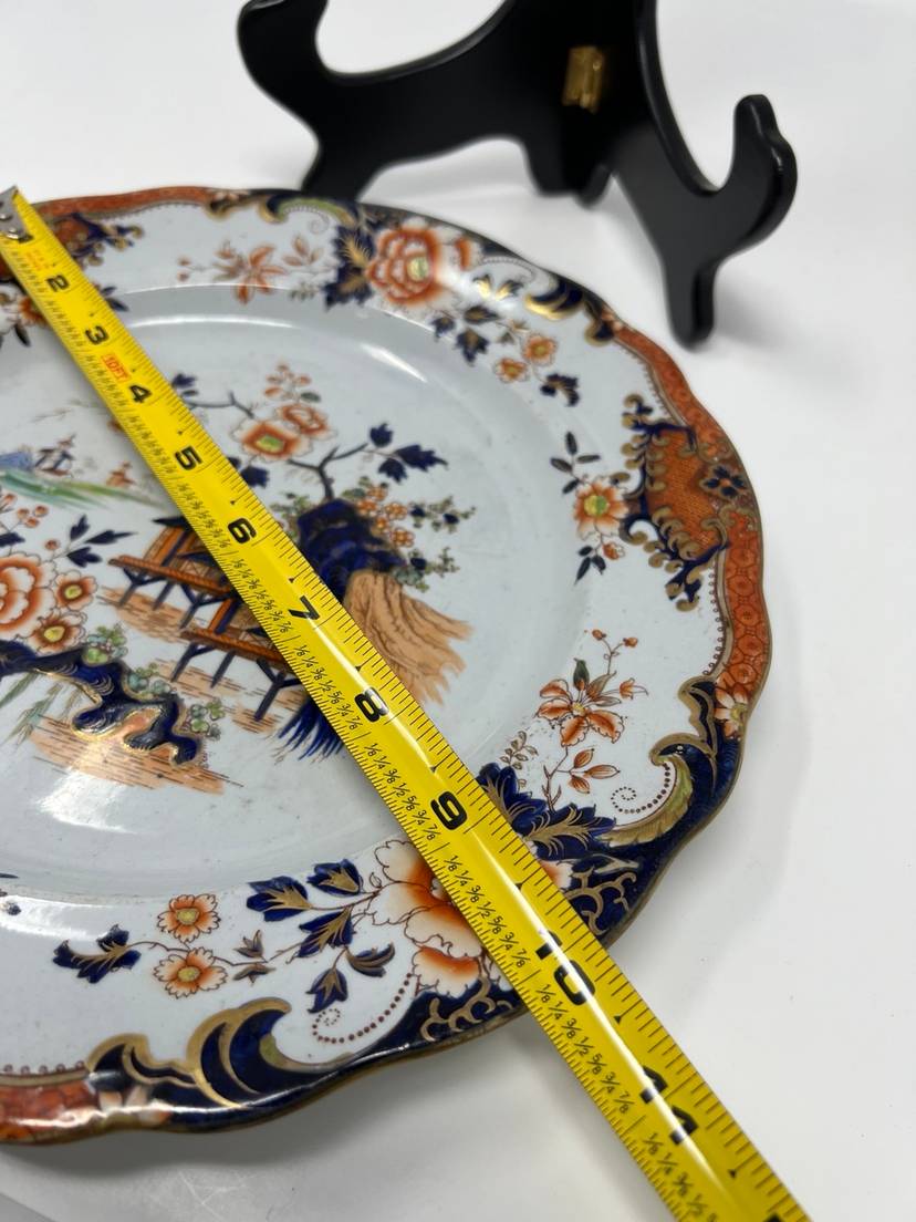 This antique plate from the Masons brand is a stunning addition to any collection. Made of durable and beautiful ironstone, this plate features a unique Imari well and tree design. The plate measures 10 1/8 inches in diameter and is from the late 19th century.