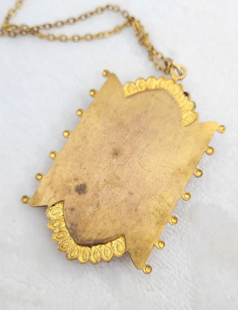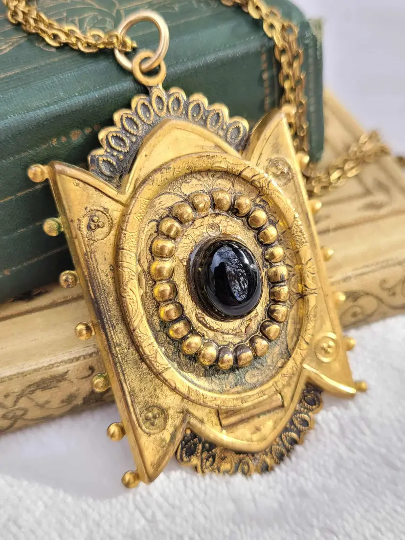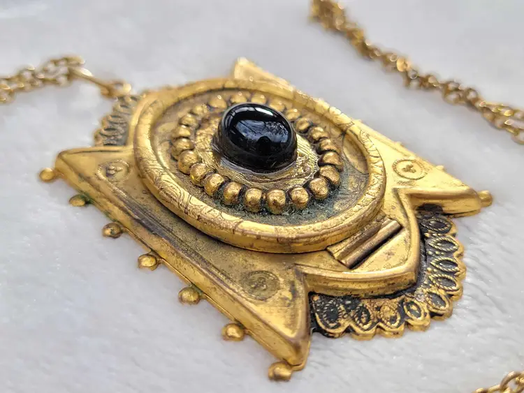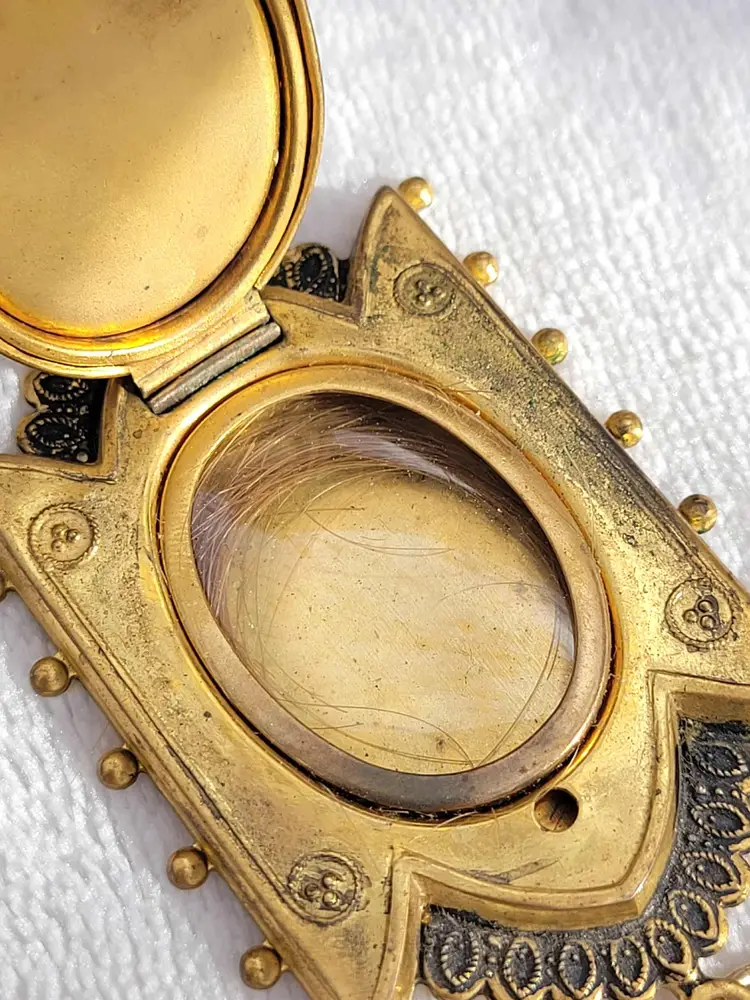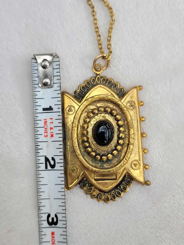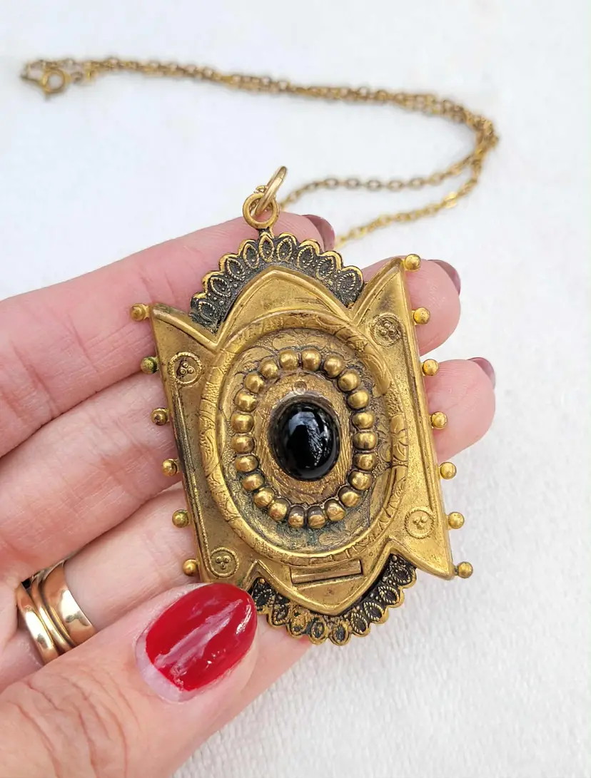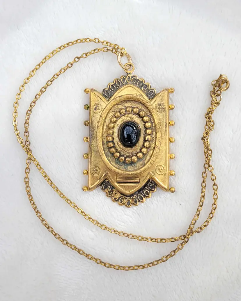 Incredible original Victorian memento mori pendant, yellow gold filled and with a genuine onyx cabachon on the front. The locket opens to... a lock of real Victorian hair! This is on a 20" chain that is not antique but likely mid-century. It is in good condition considering its age, with some wear to the gold fill and a bit of glue residue around the onyx. Please see pictures for details and measurements.