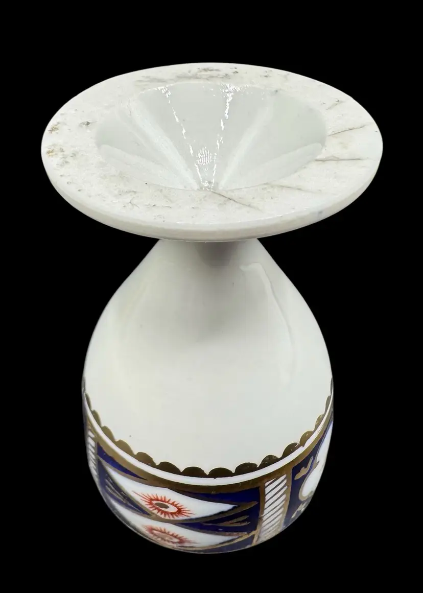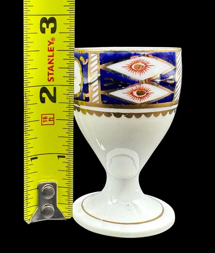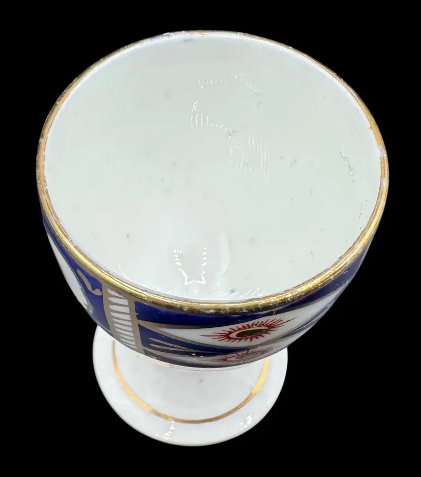Small egg cup with hand painted floral pattern in blue, red and gold over white.
